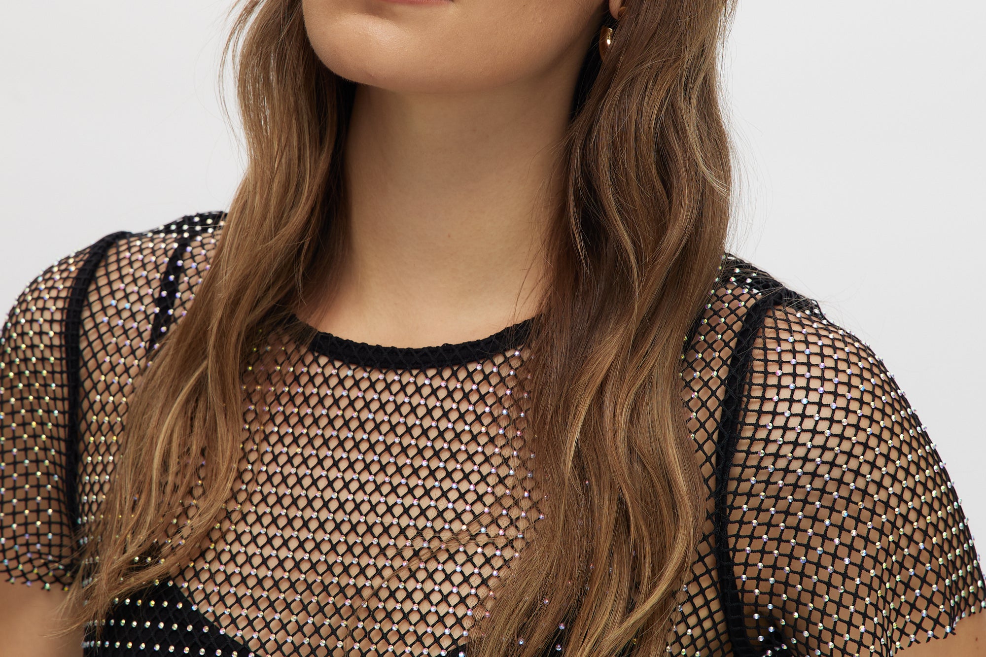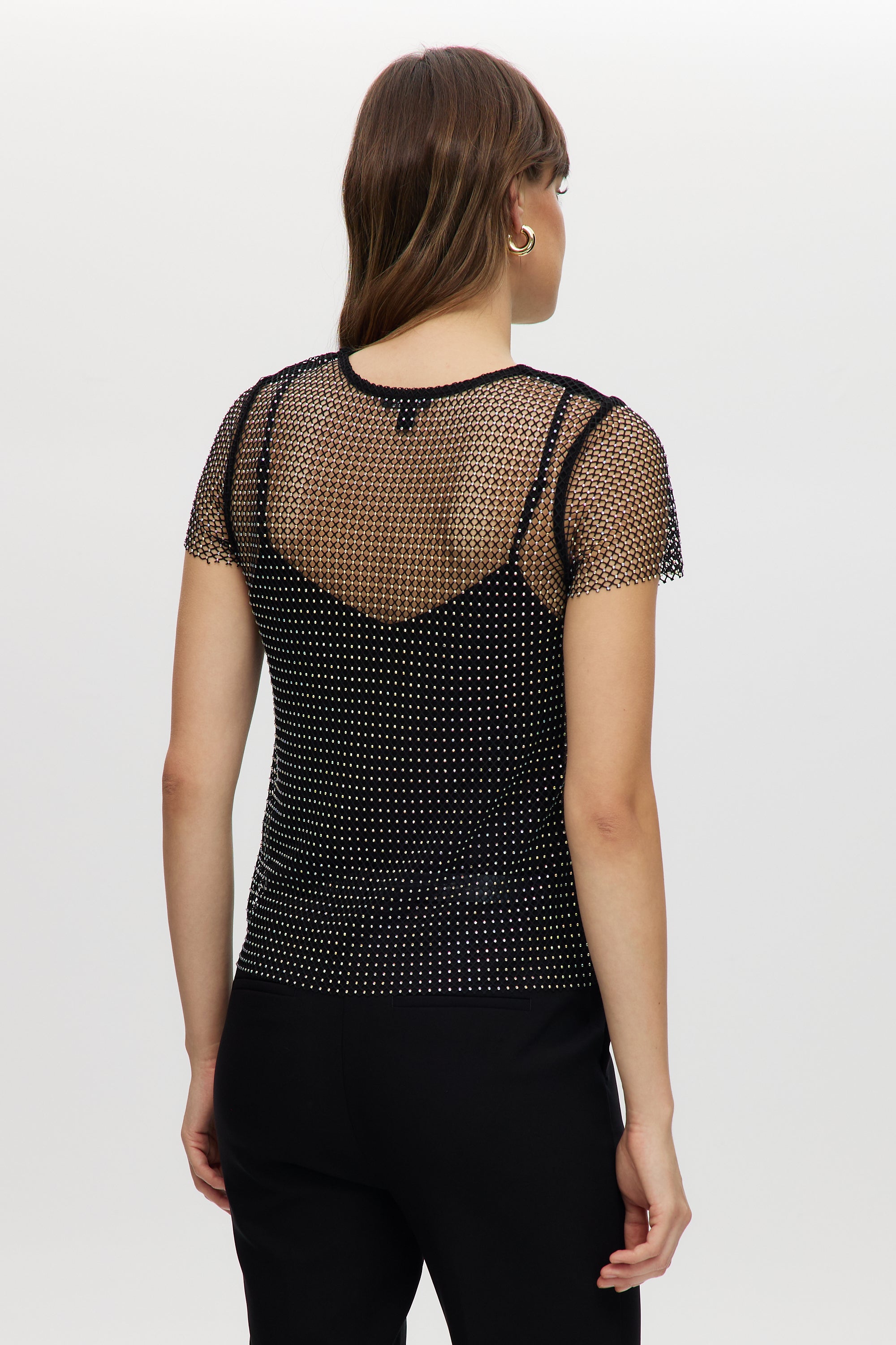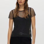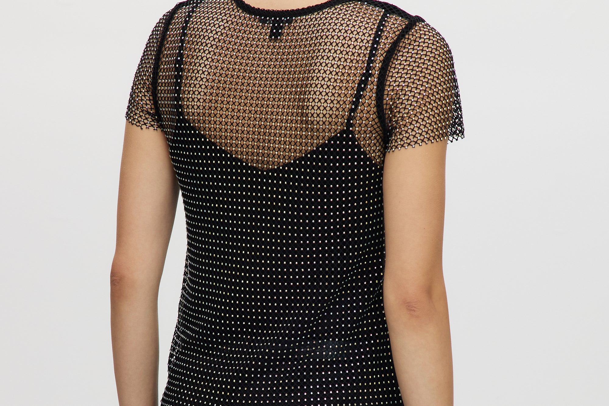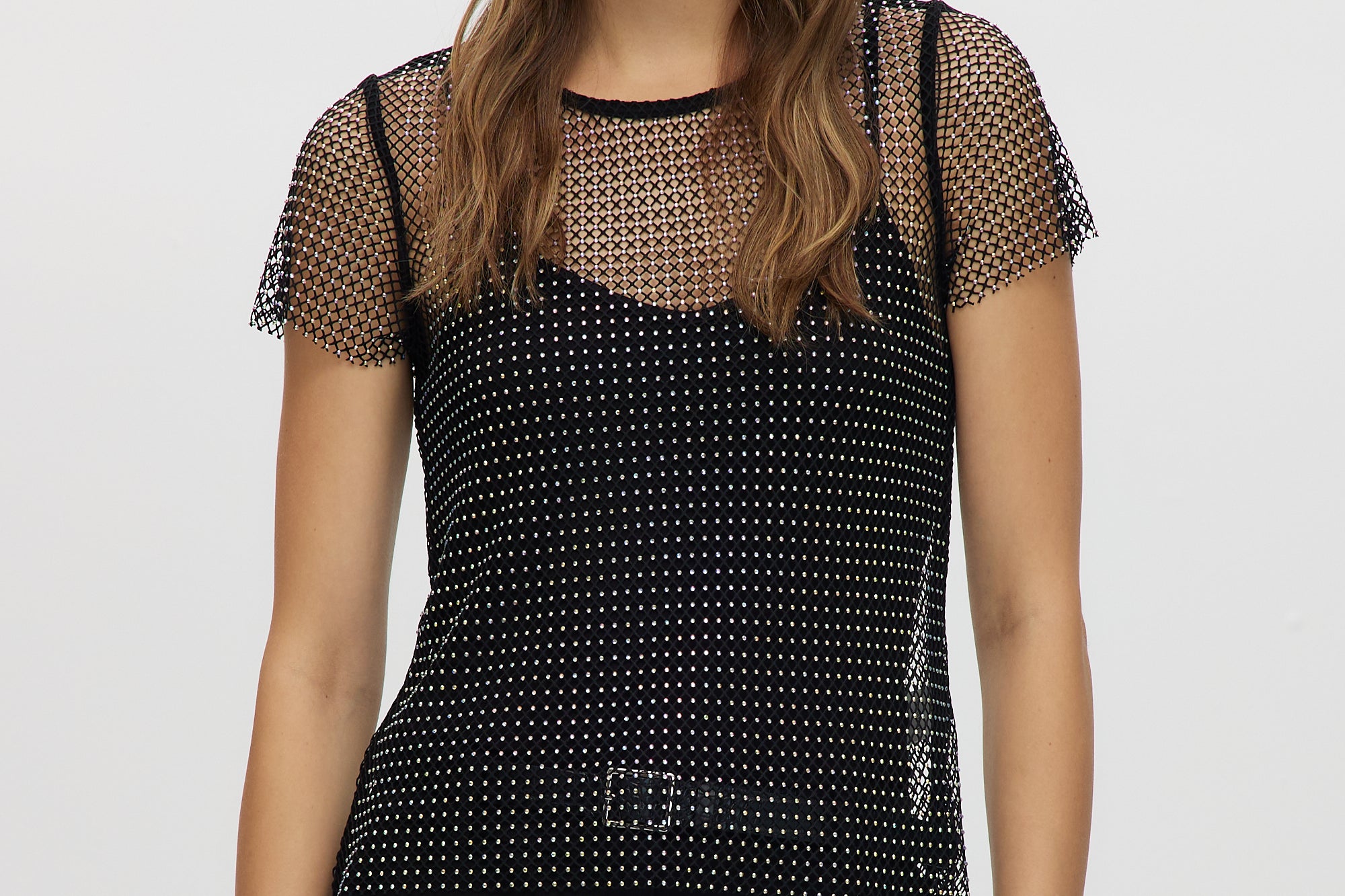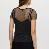 T-SHIRT EN RÉSILLE NOIRE À STRASS AVEC CAMISOLE