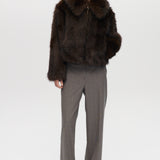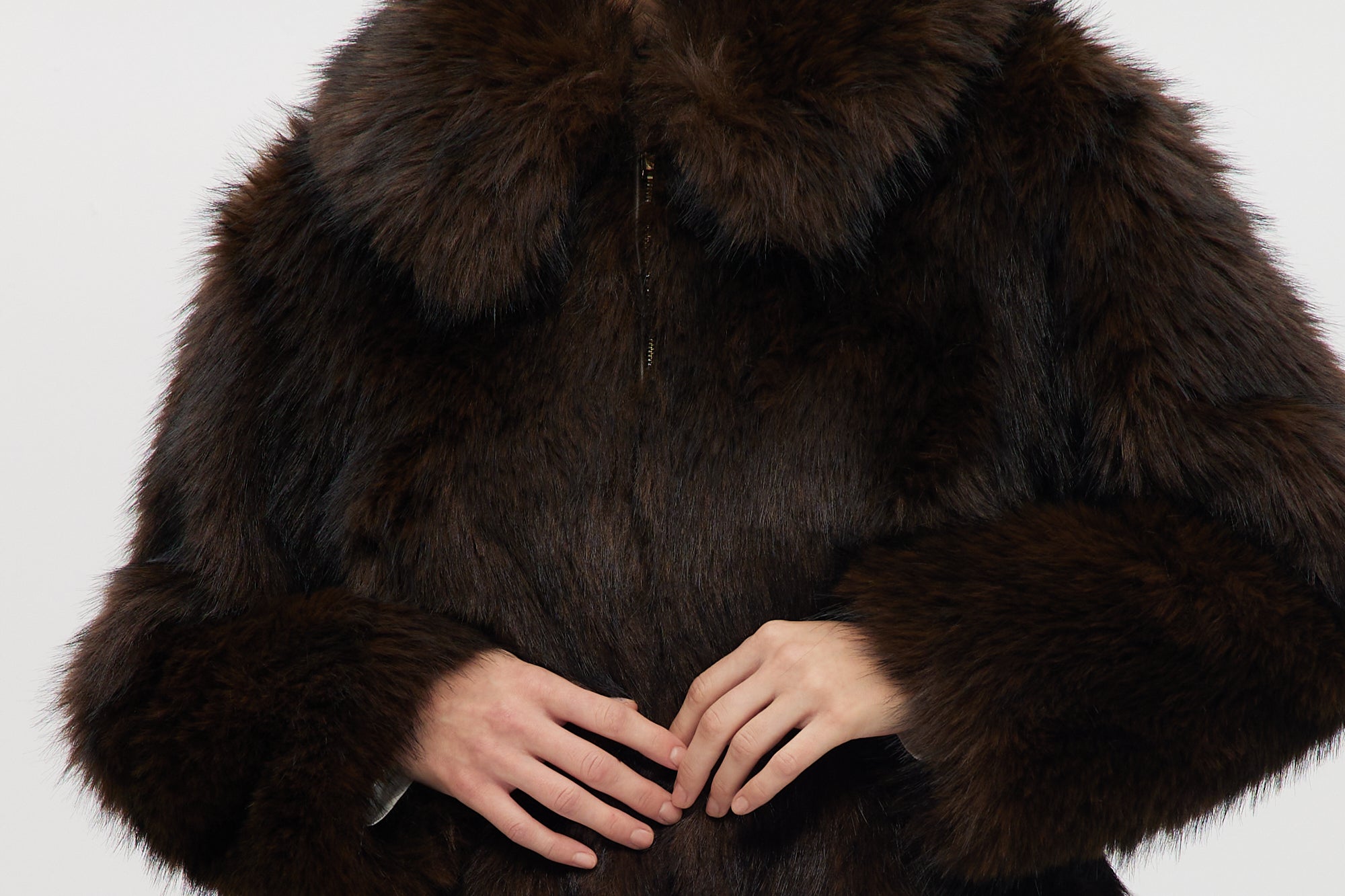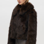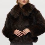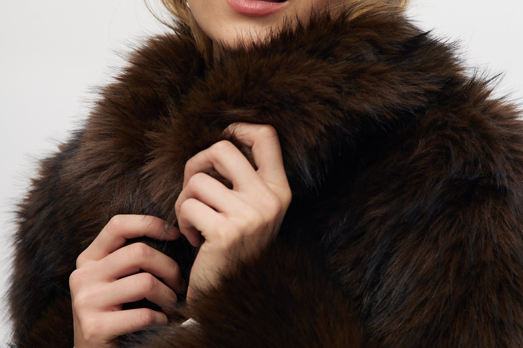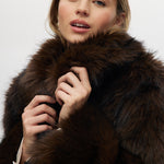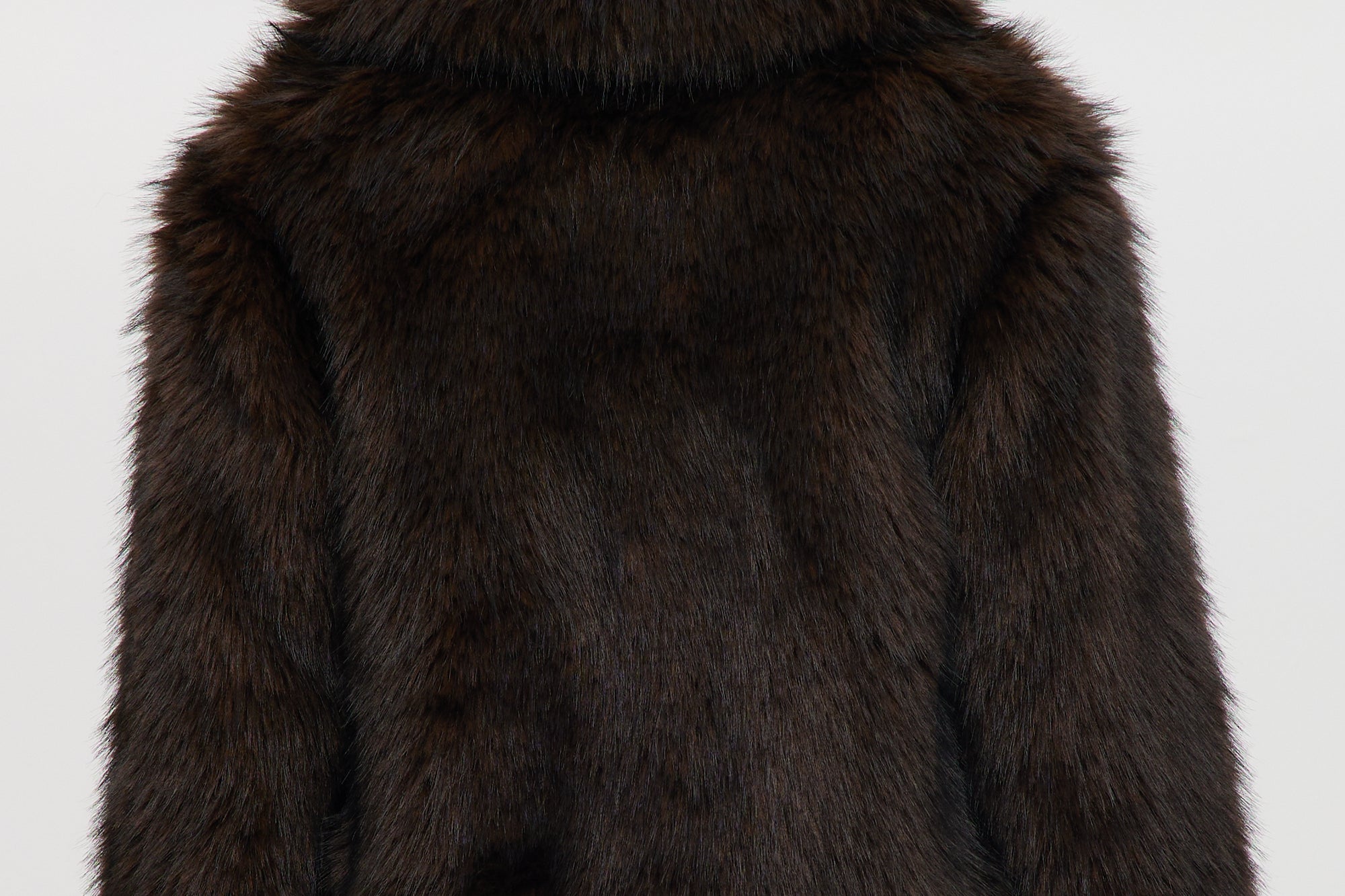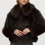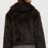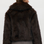 Statement warmth meets conscious luxury. This plush vegan fur jacket features long pile texture, a wide collar, and a bold cropped silhouette. Its fully lined with an interior chain detail for an elevated finishperfect for layering over denim or evening looks.