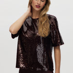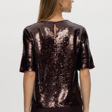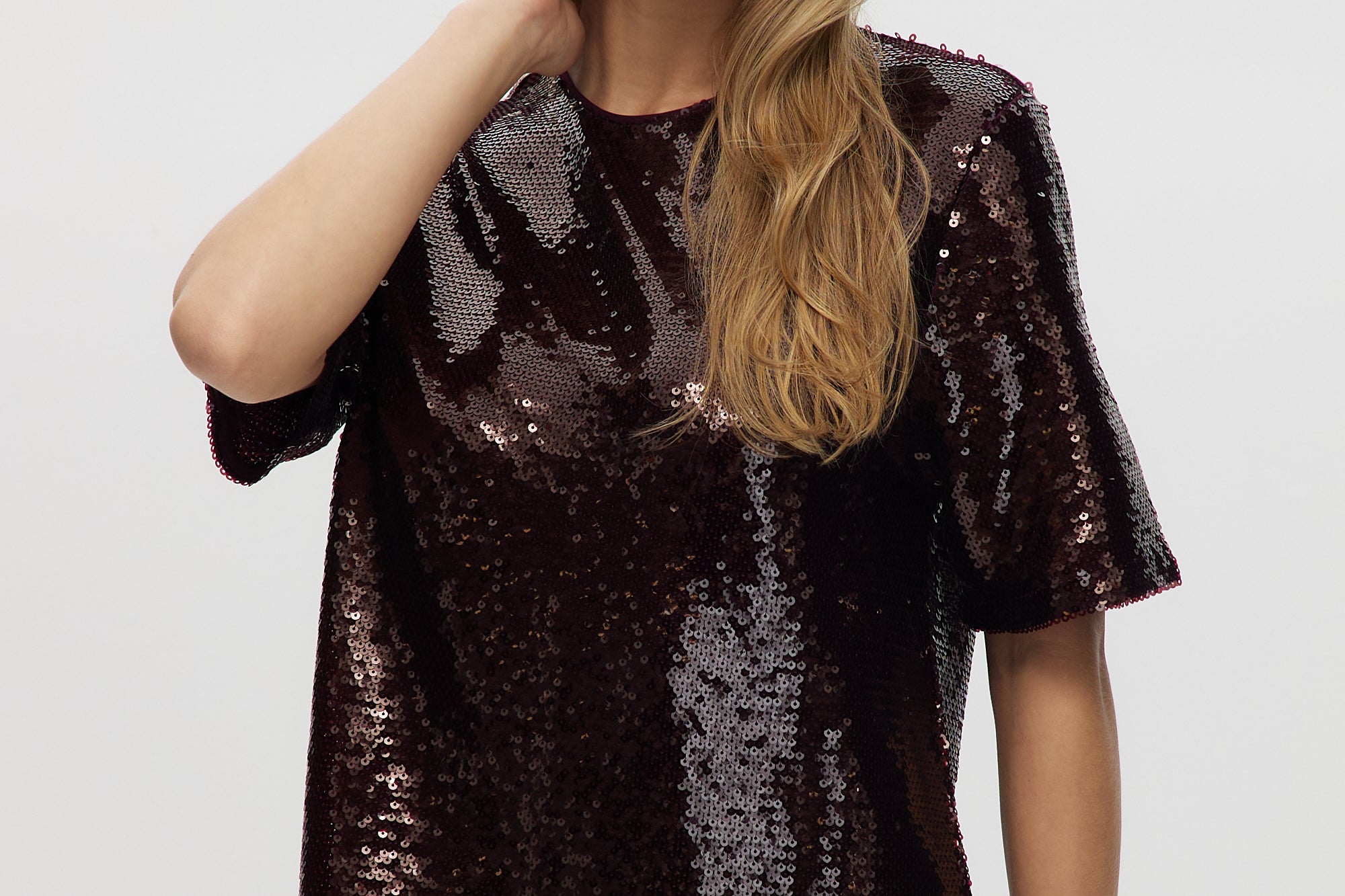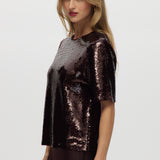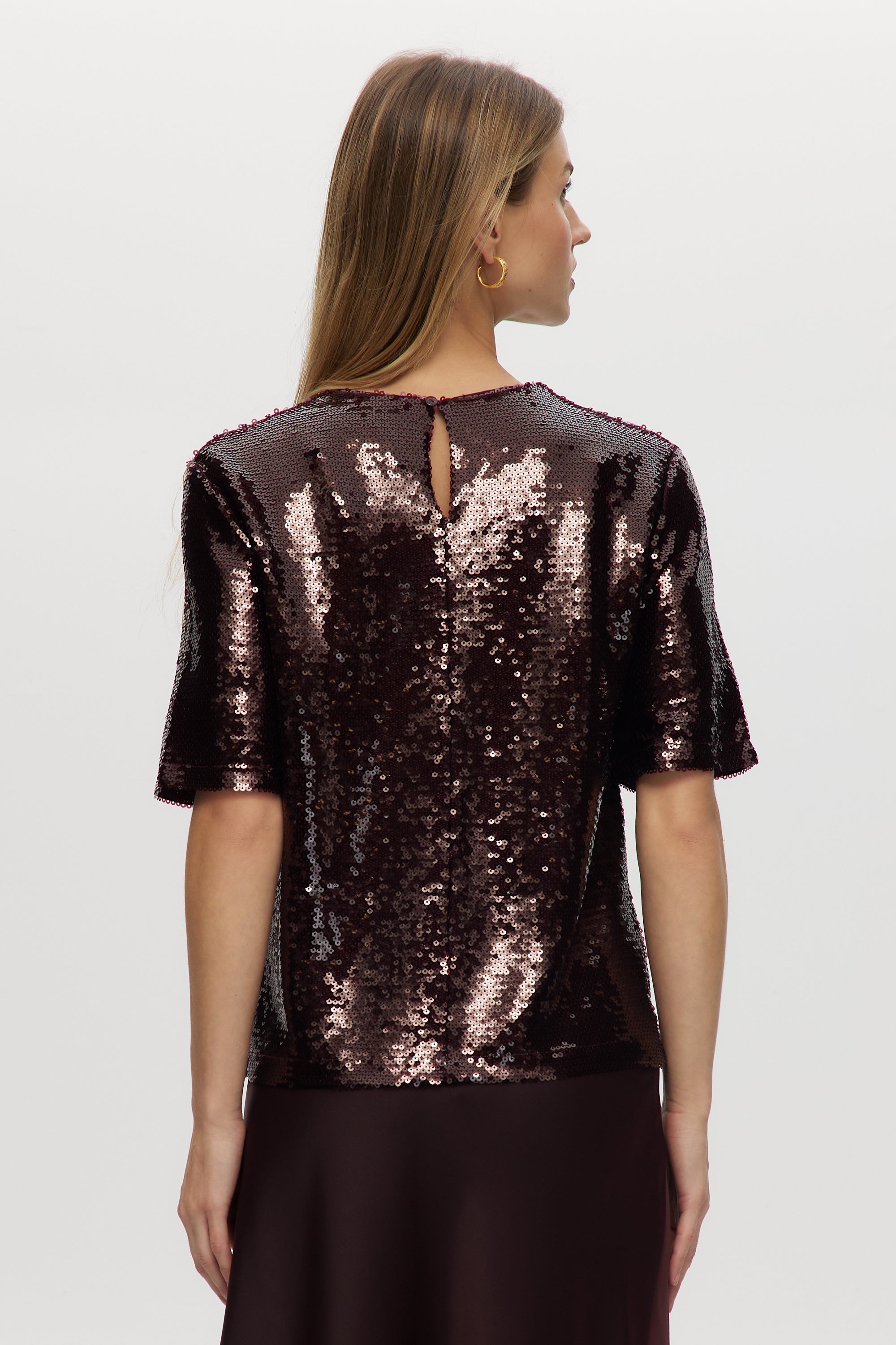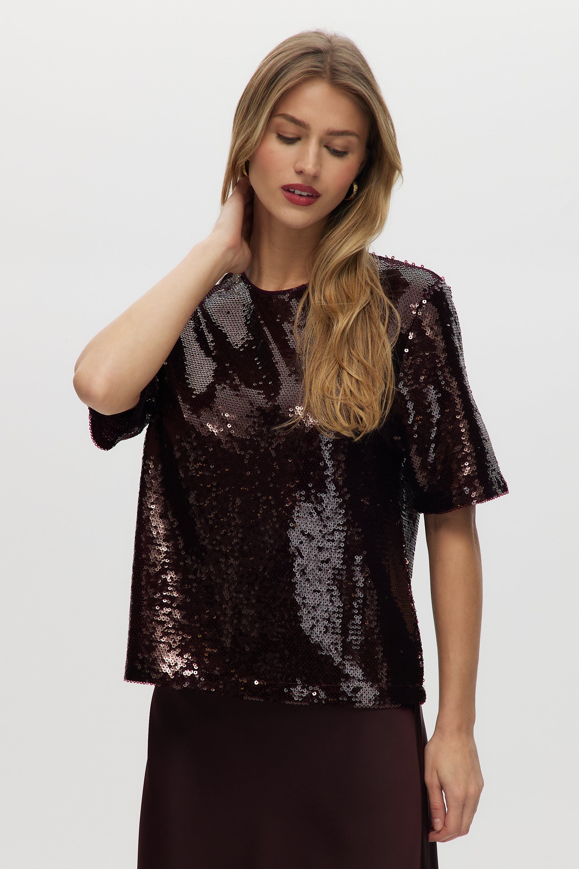 Shimmer and shine in this short sleeve sequin tee designed to light up the holiday season. With a comfortable stretch and soft lining, this festive top is a perfect match for your winter celebrations.