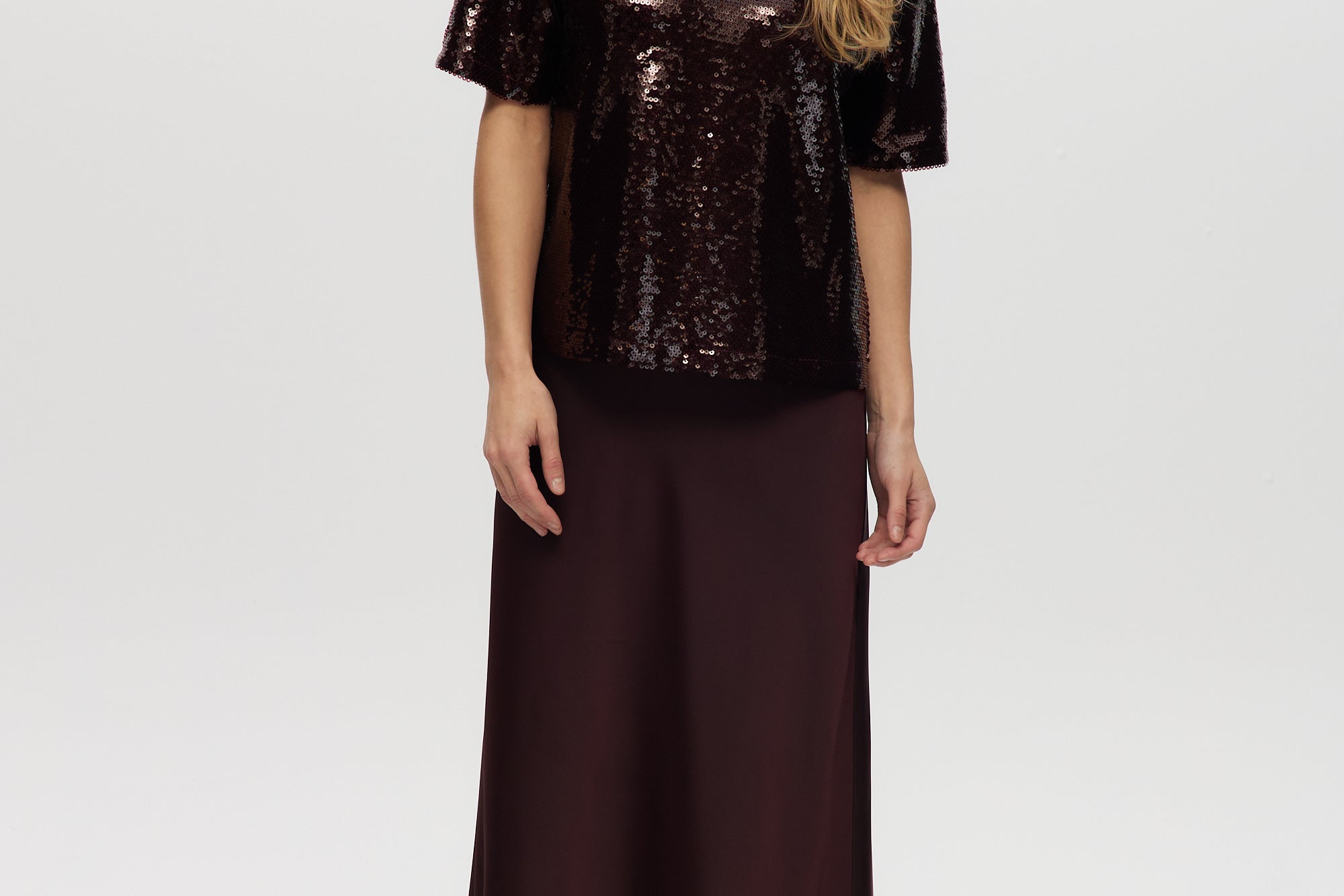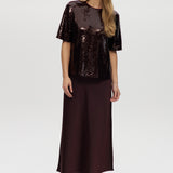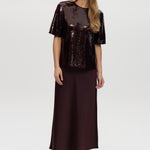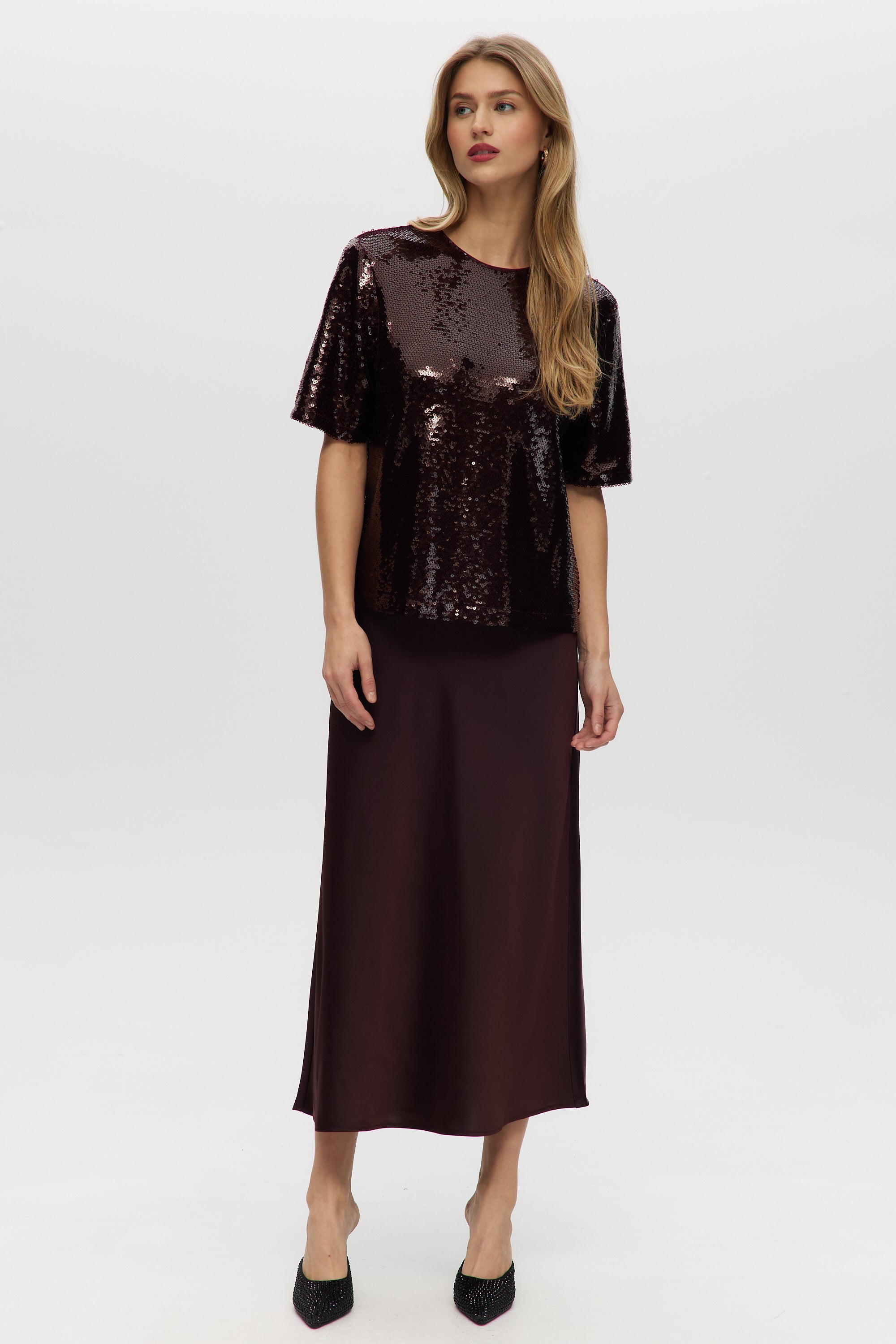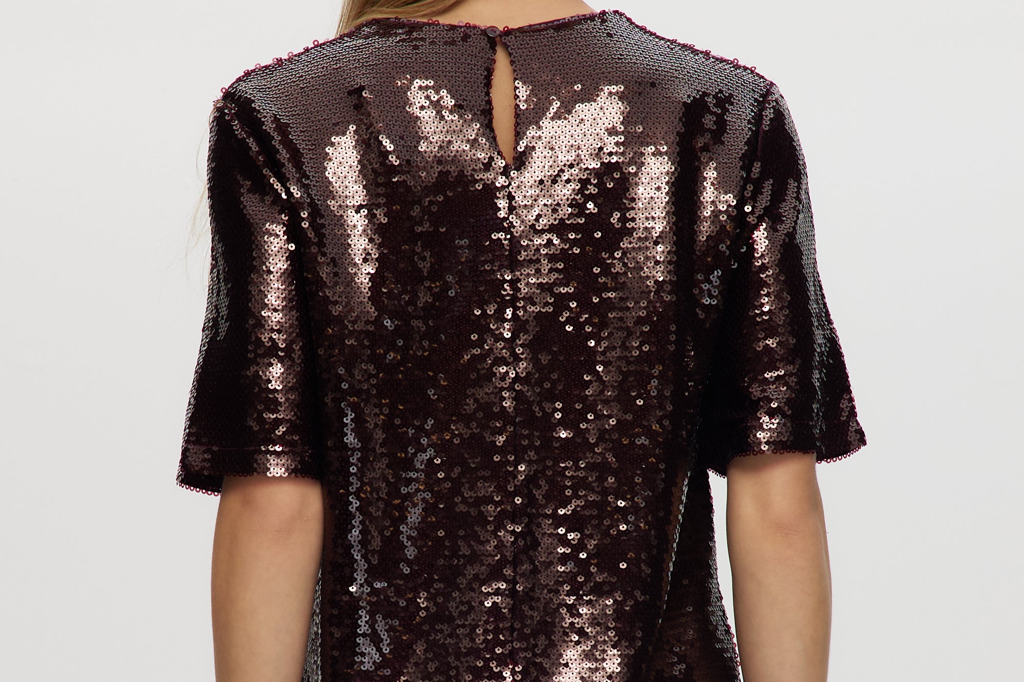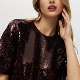 Shimmer and shine in this short sleeve sequin tee designed to light up the holiday season. With a comfortable stretch and soft lining, this festive top is a perfect match for your winter celebrations.