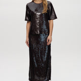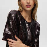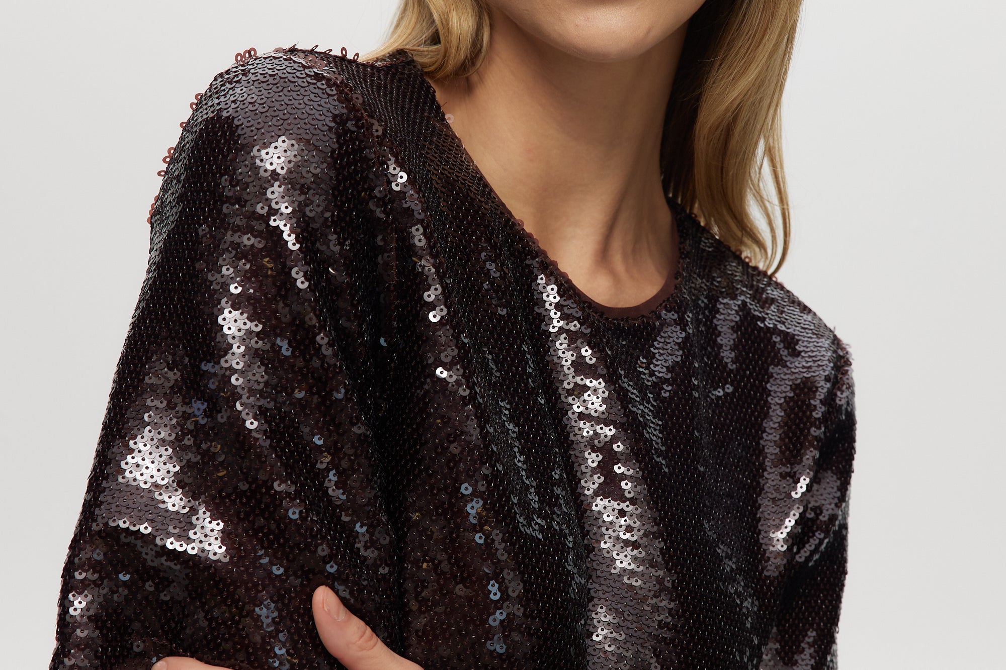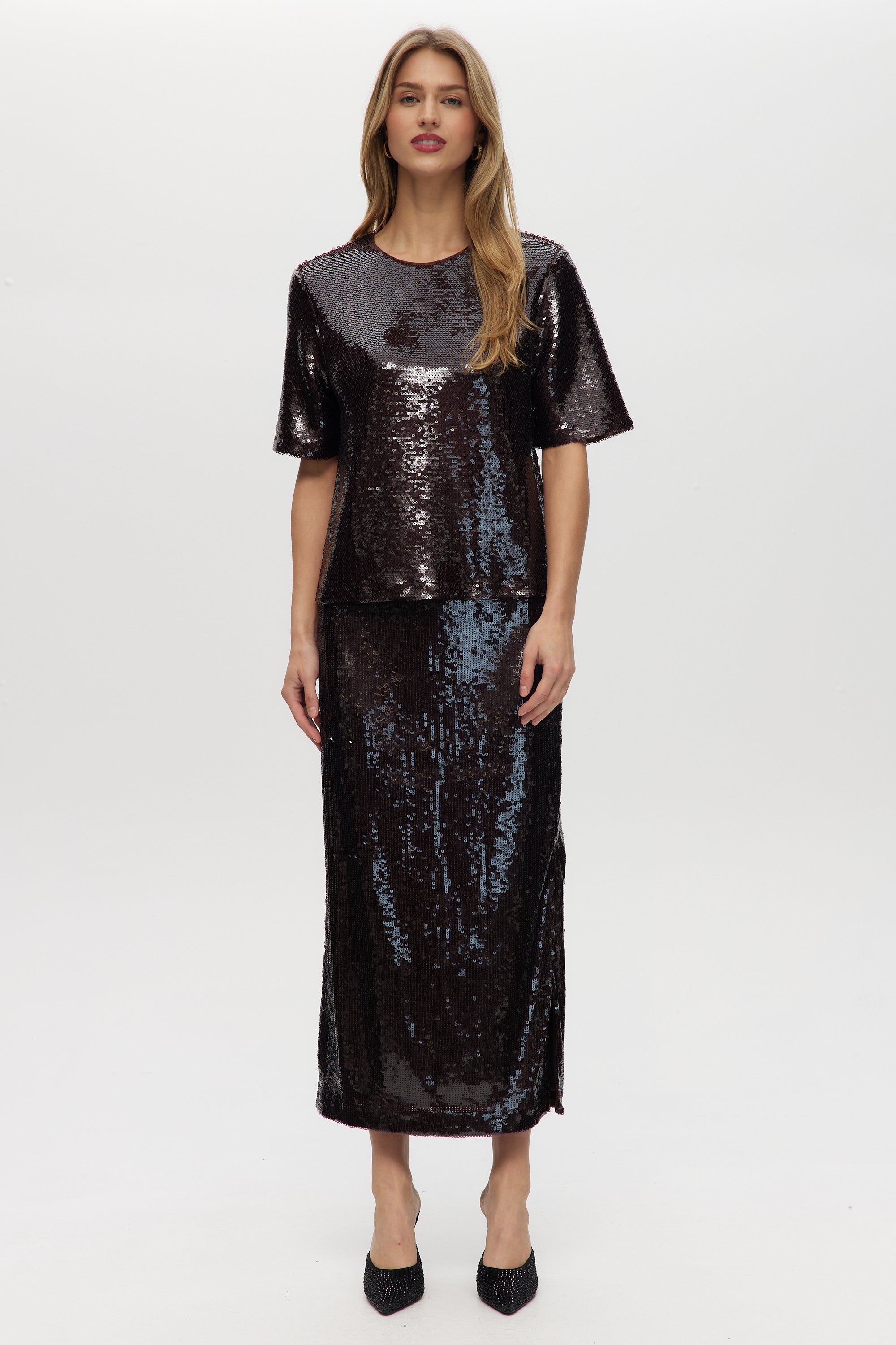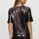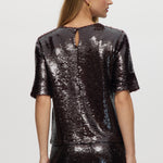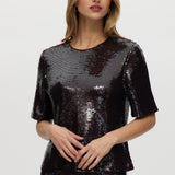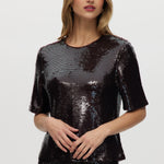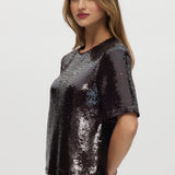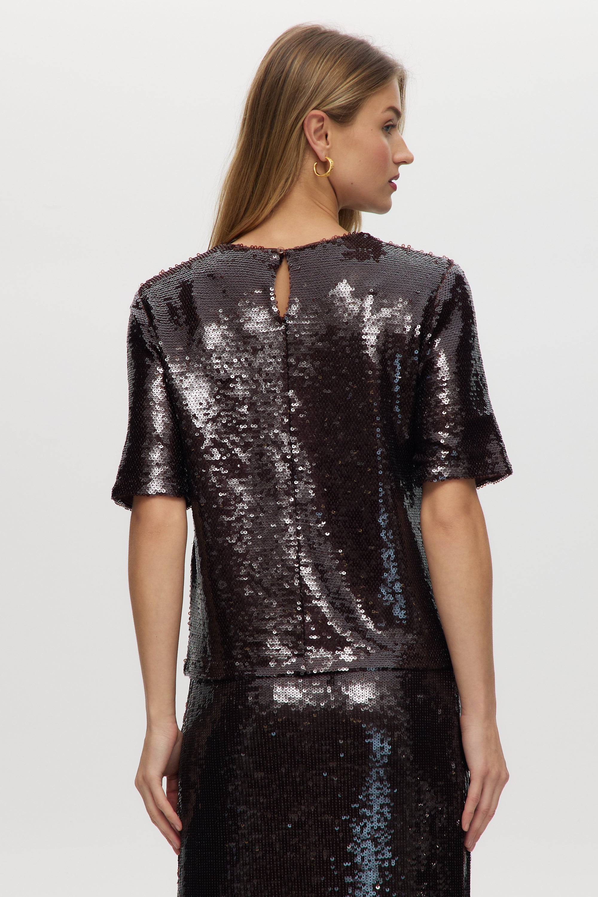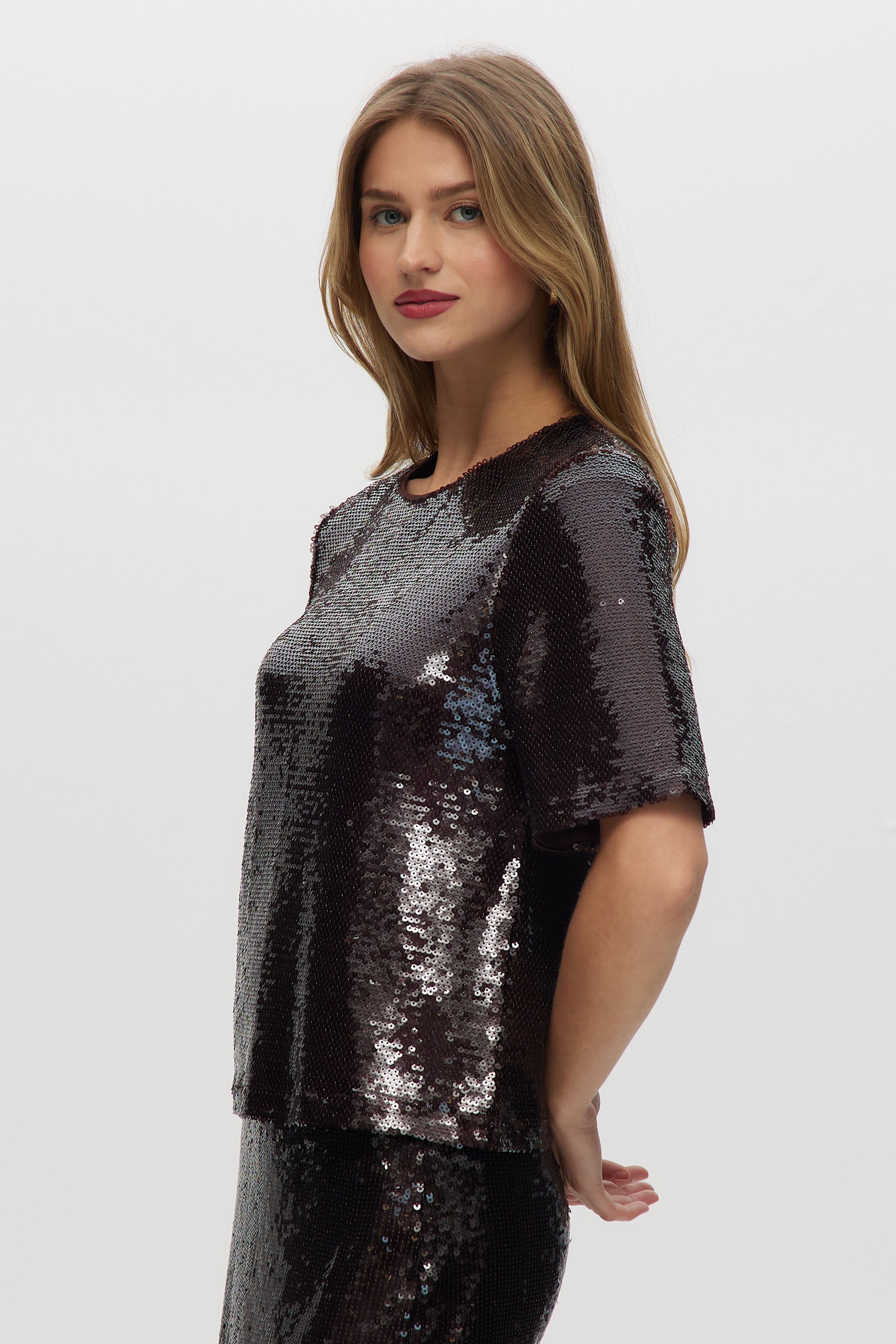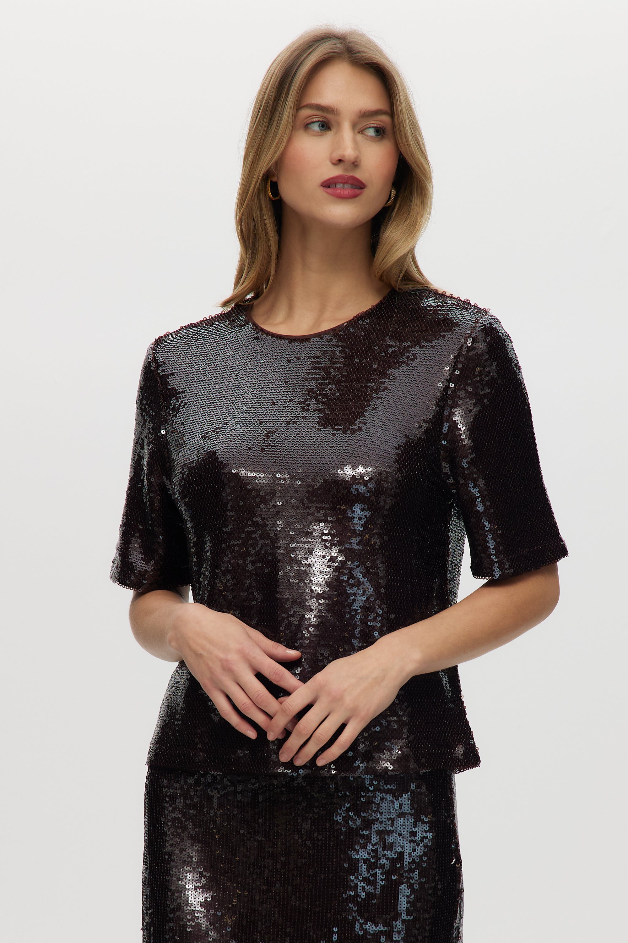 Shimmer and shine in this short sleeve sequin tee designed to light up the holiday season. With a comfortable stretch and soft lining, this festive top is a perfect match for your winter celebrations.