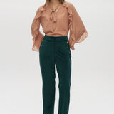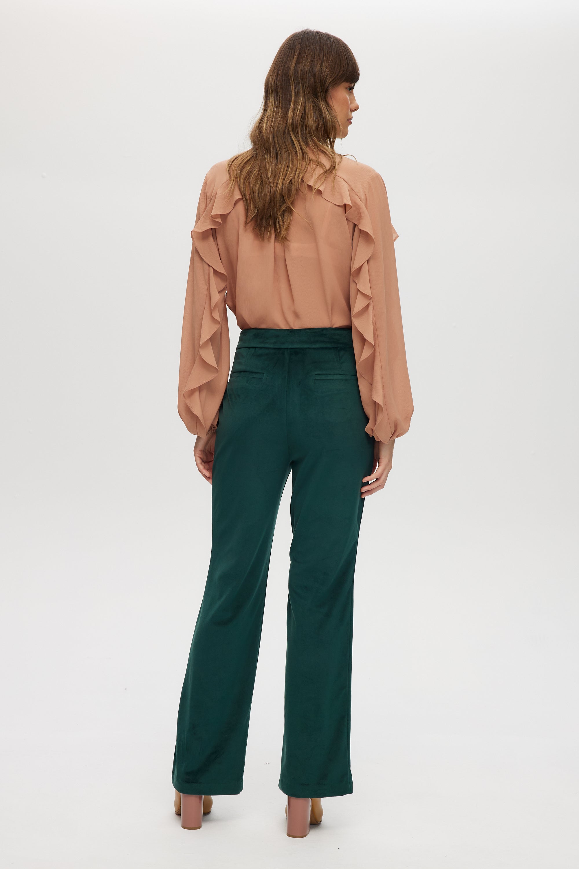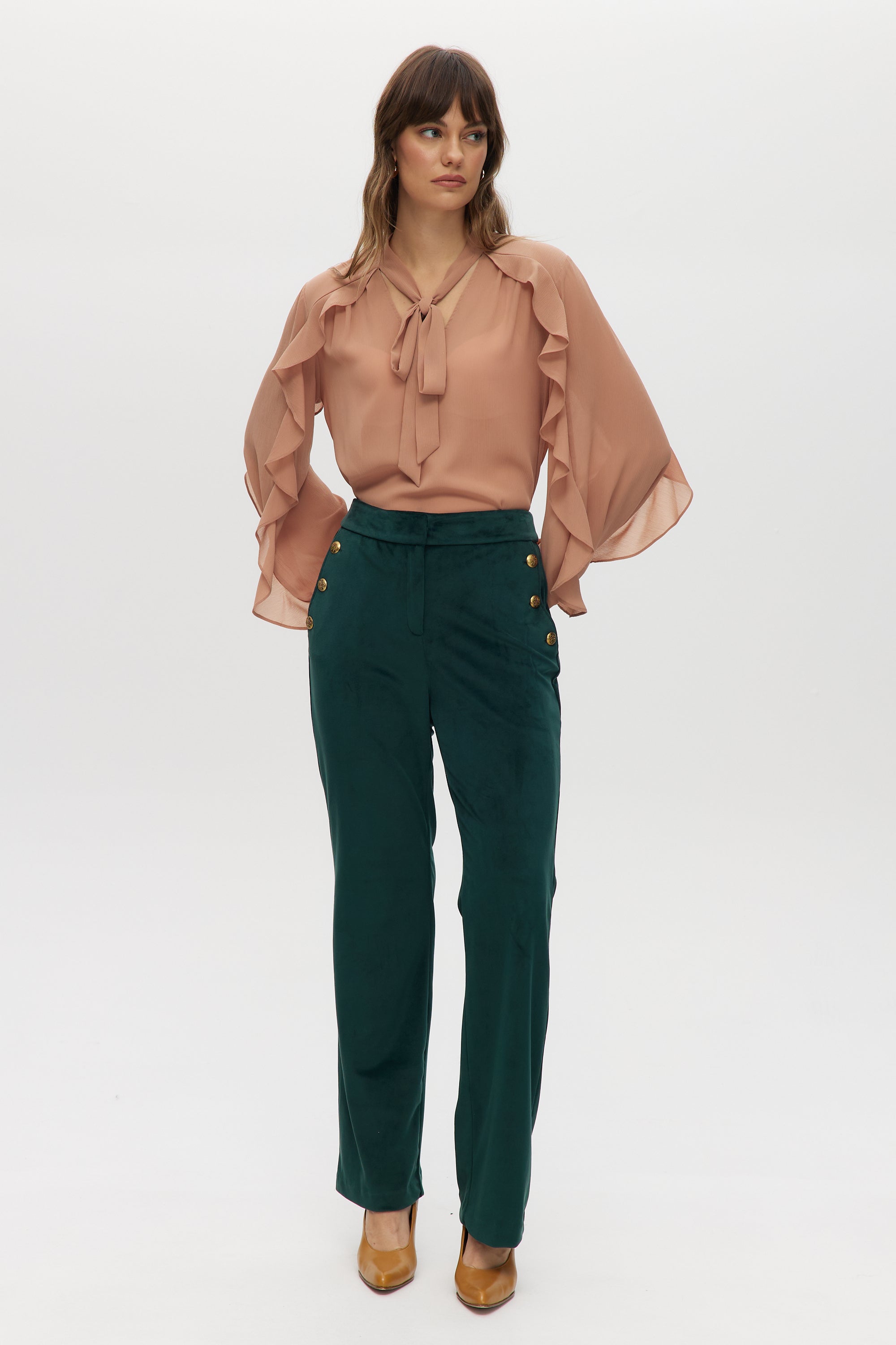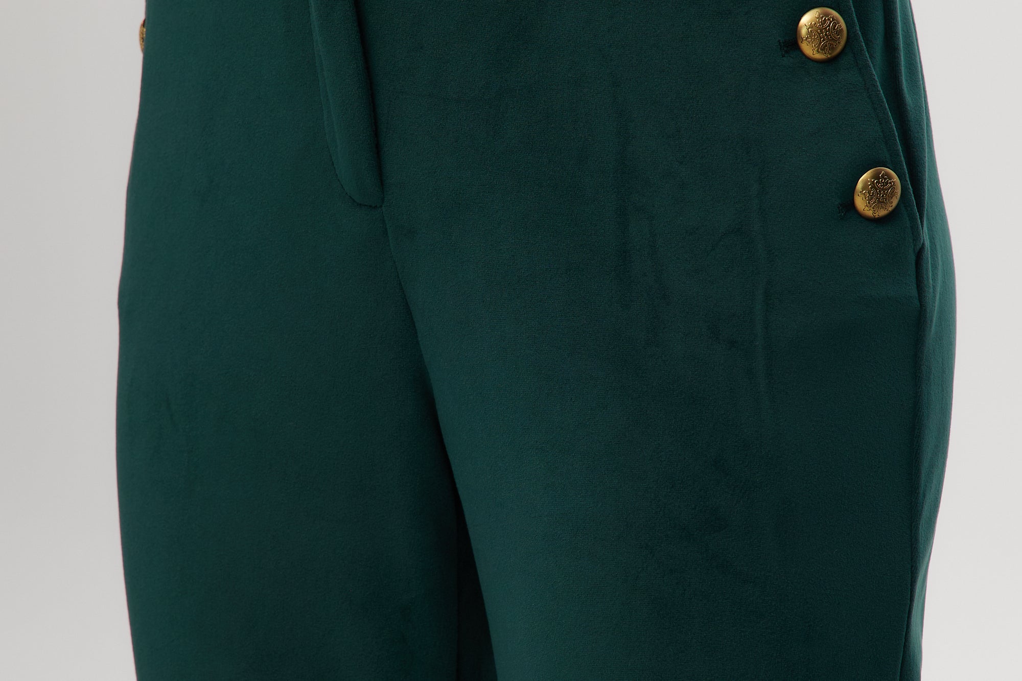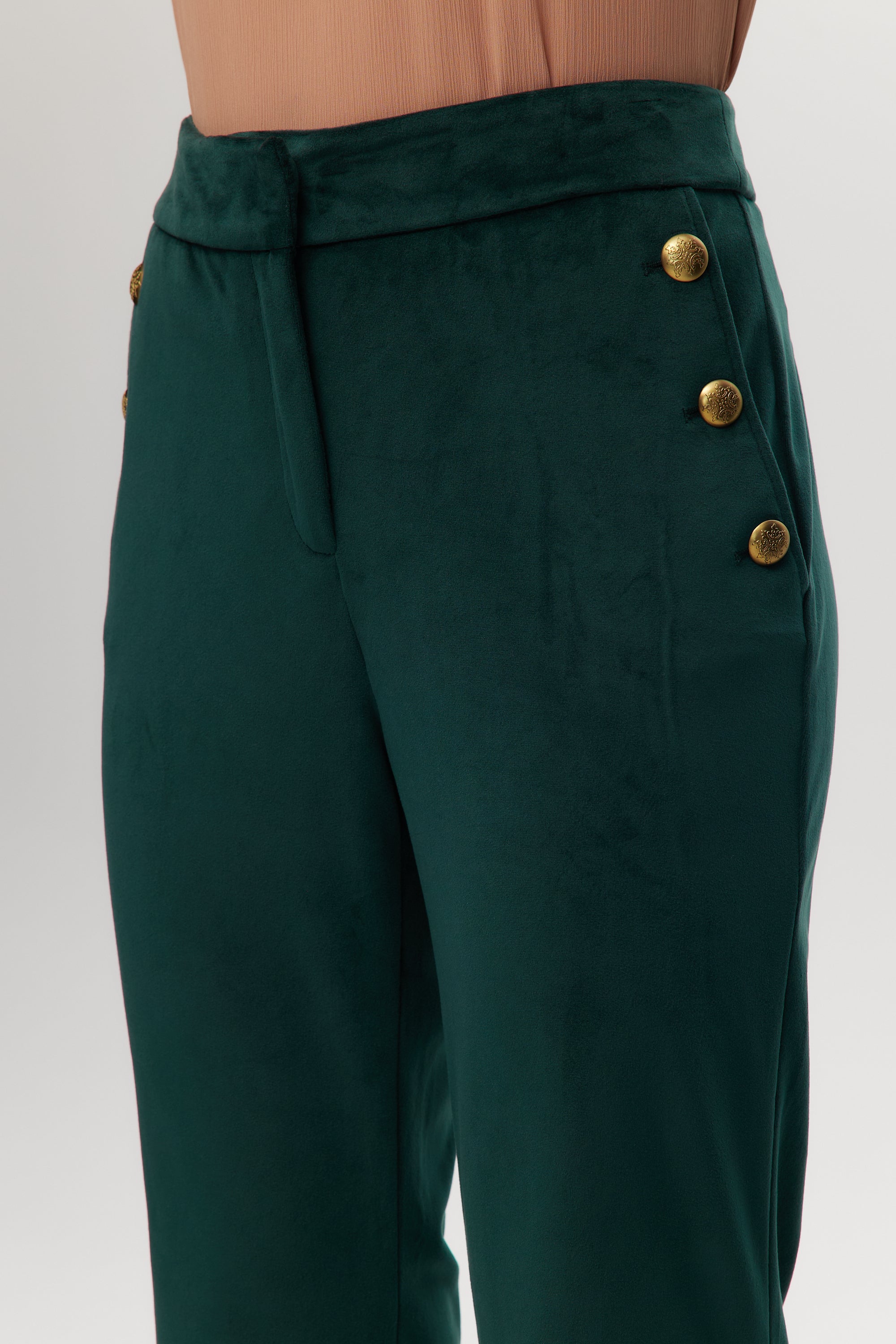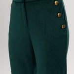 This tailored velvet pant offers a refined bootcut silhouette designed to flatter and elongate the leg. Made from a soft velvet knit with comfortable stretch, it features a 32" inseam, front hook-and-bar closure, and semi-matte gold button detail. The interior comfort waistband ensures a smooth, secure fit—ideal for pairing with blazers, blouses, or festive tops.