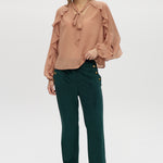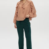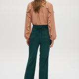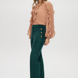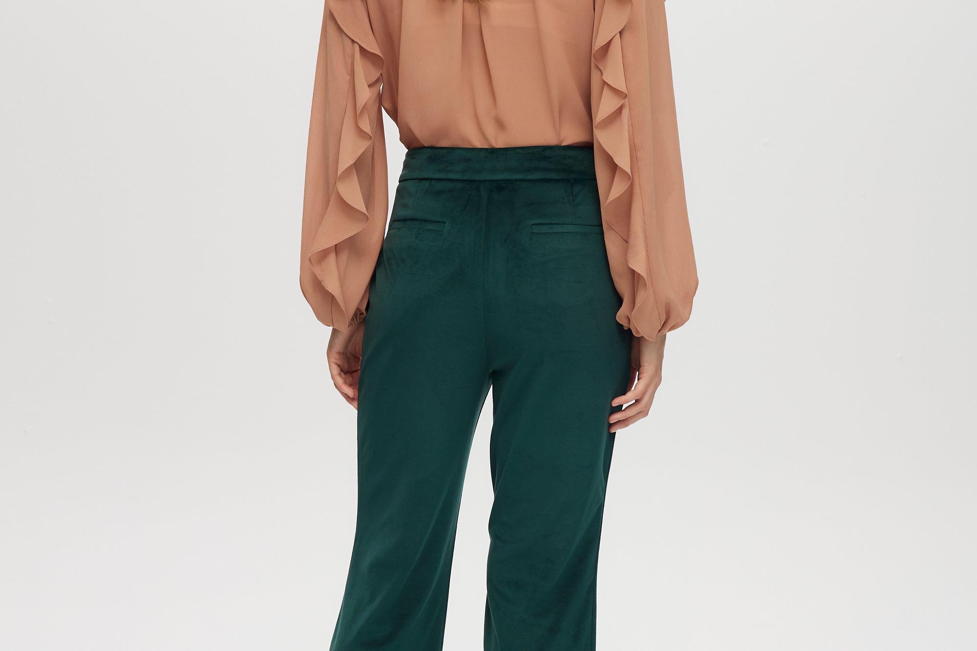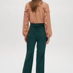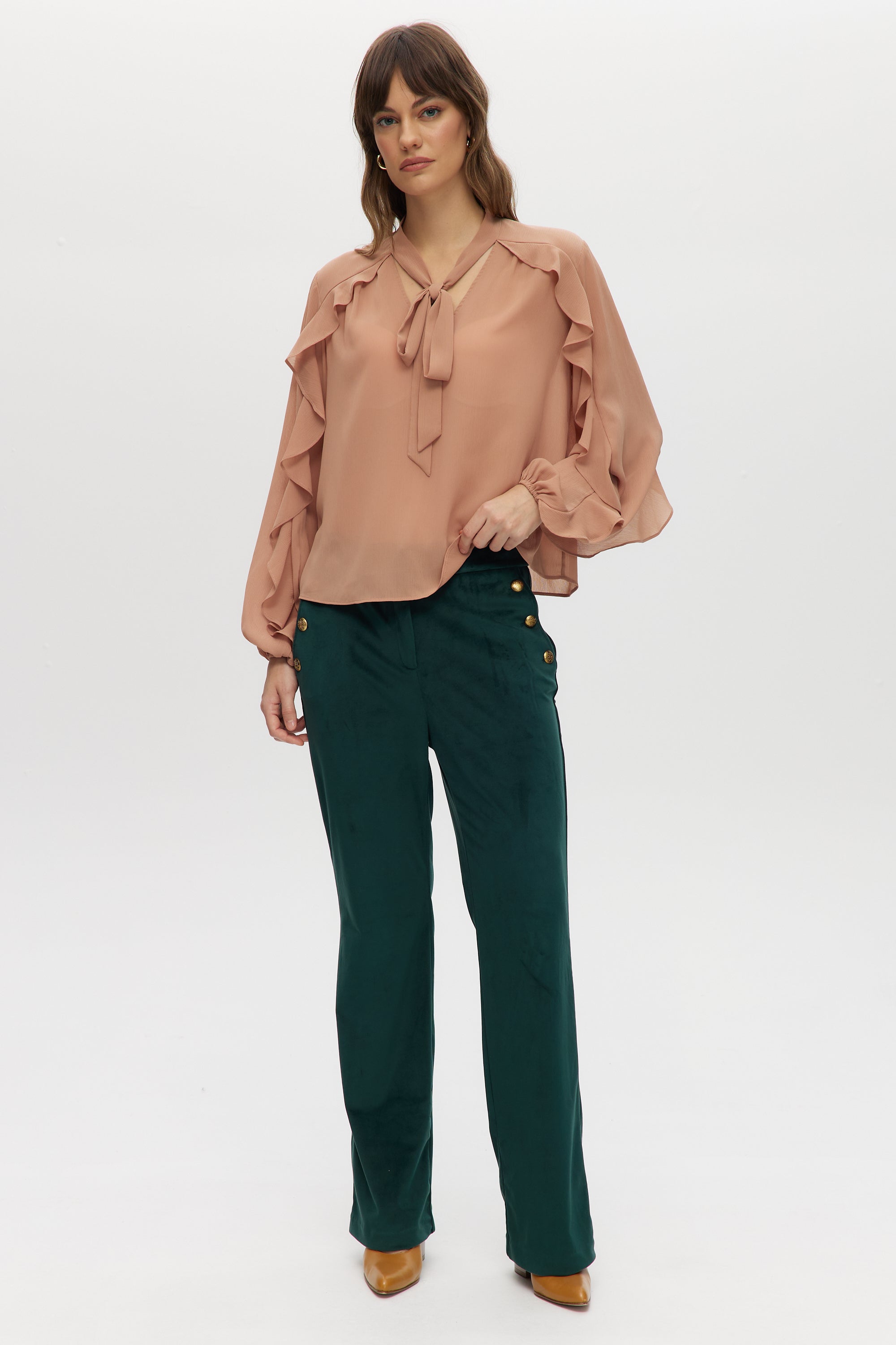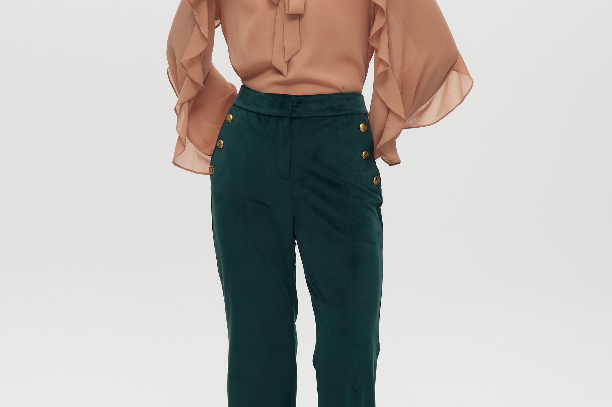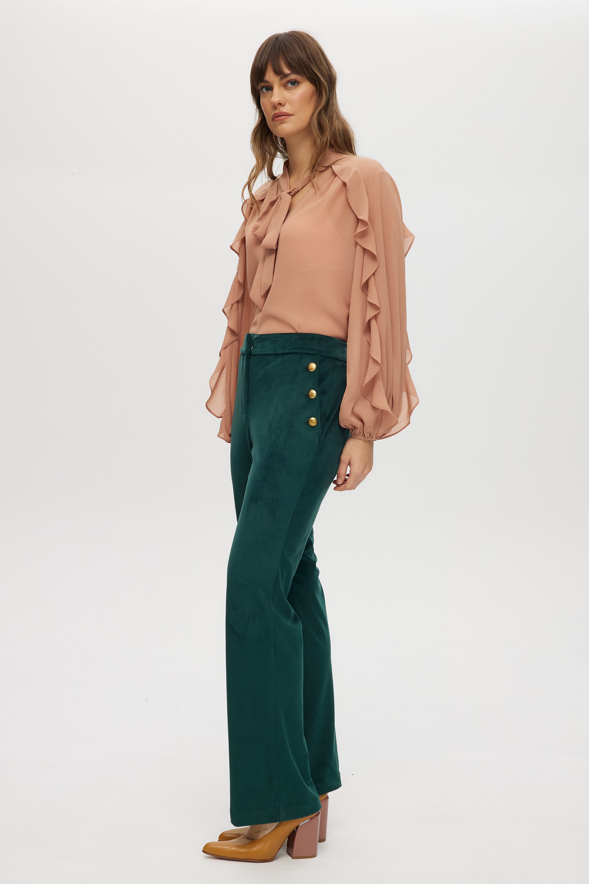 This tailored velvet pant offers a refined bootcut silhouette designed to flatter and elongate the leg. Made from a soft velvet knit with comfortable stretch, it features a 32" inseam, front hook-and-bar closure, and semi-matte gold button detail. The interior comfort waistband ensures a smooth, secure fit—ideal for pairing with blazers, blouses, or festive tops.