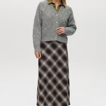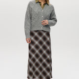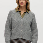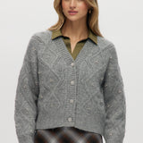 A soft and feminine cable knit cardigan designed with a flattering V-neck and delicate rhinestone rivet embellishments. The front features a textured cable pattern, while the back is finished in a smooth jersey stitch for comfortable everyday wear. Ribbed trims complete the look, giving the silhouette a refined, cozy touch—perfect for layering through the fall season.