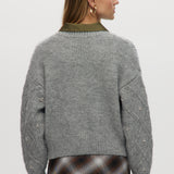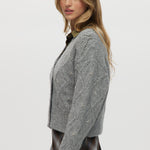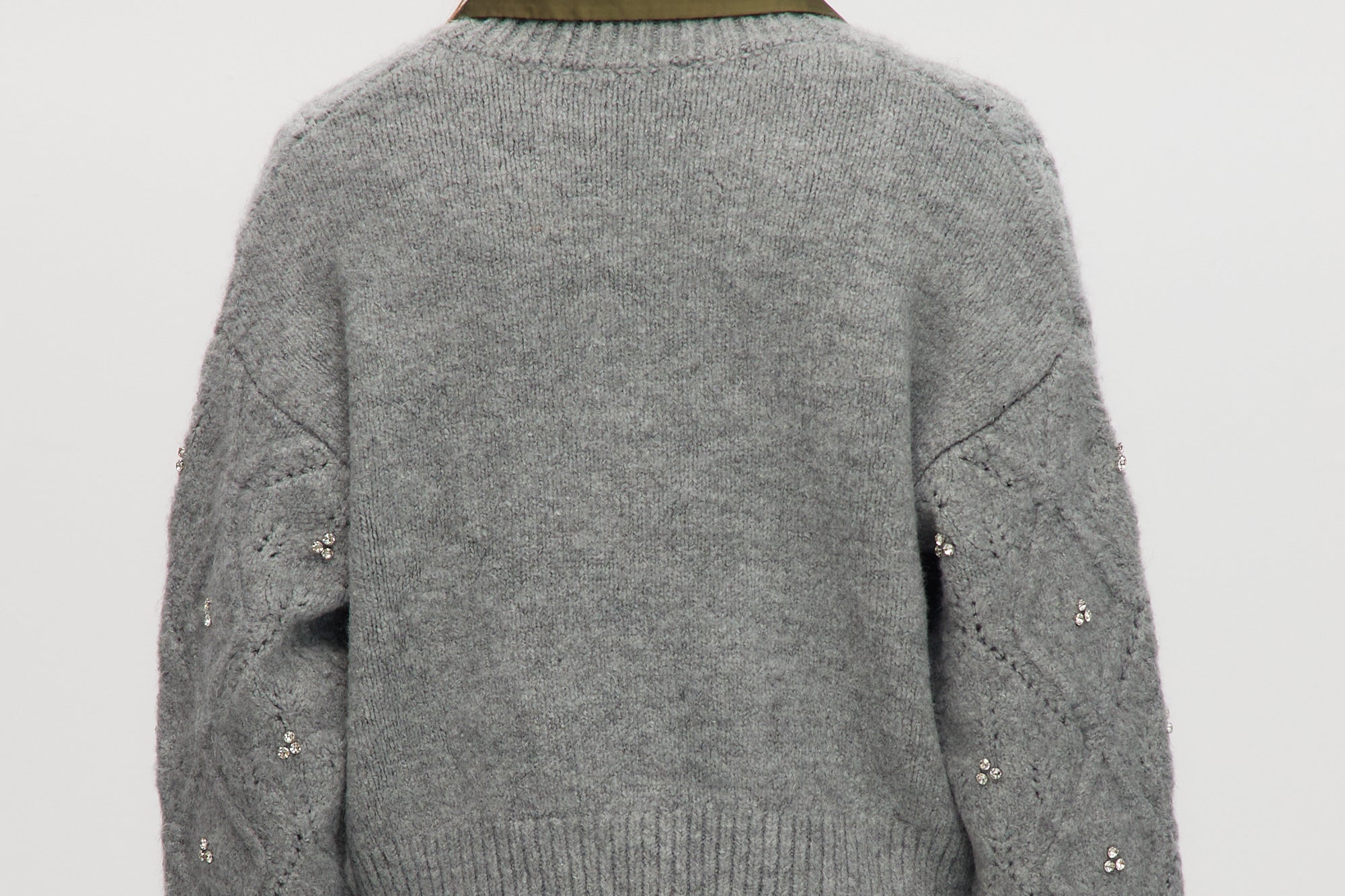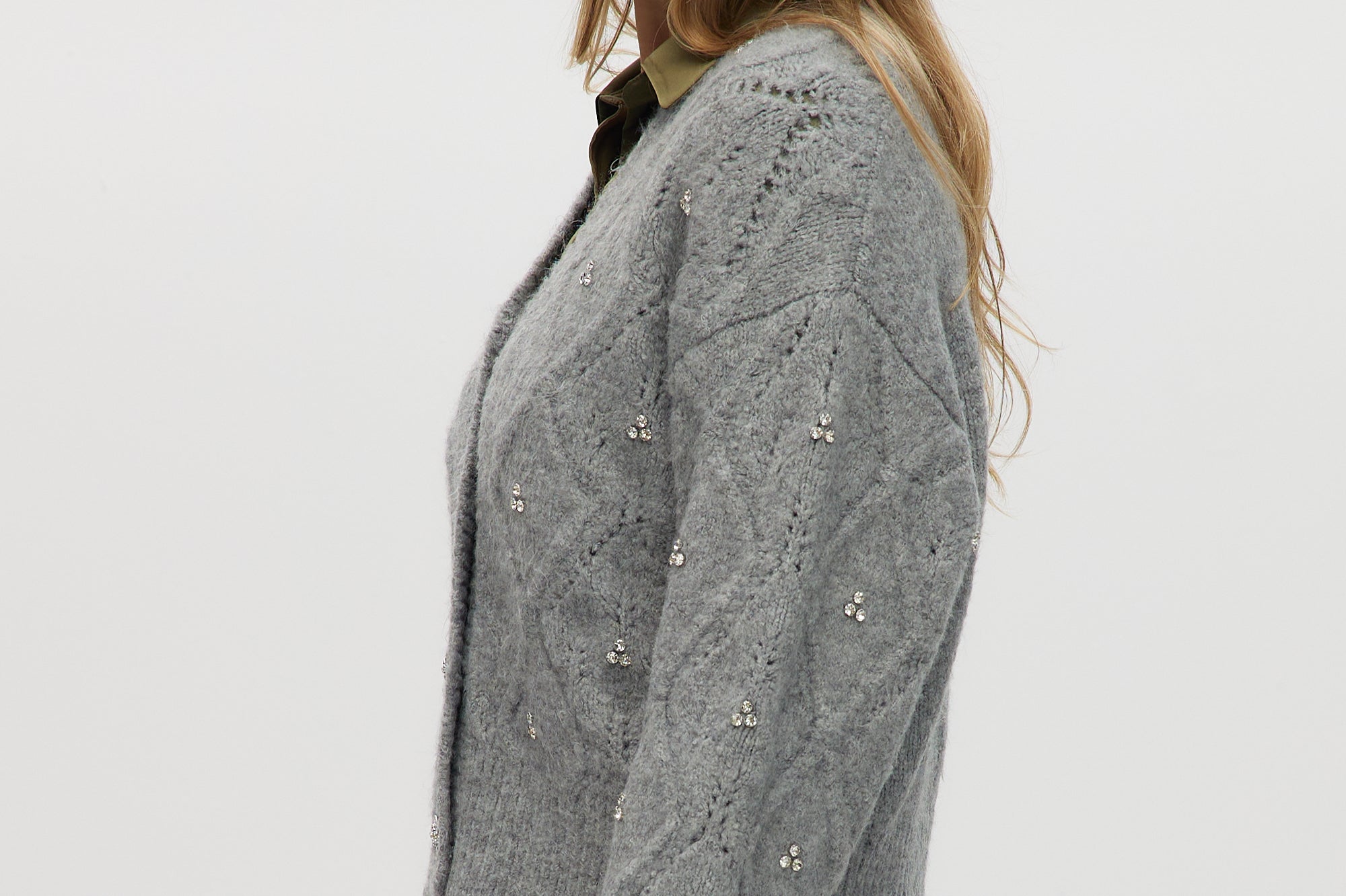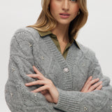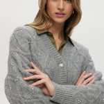 Grey Rhinestone Cable Knit V-Neck Cardigan