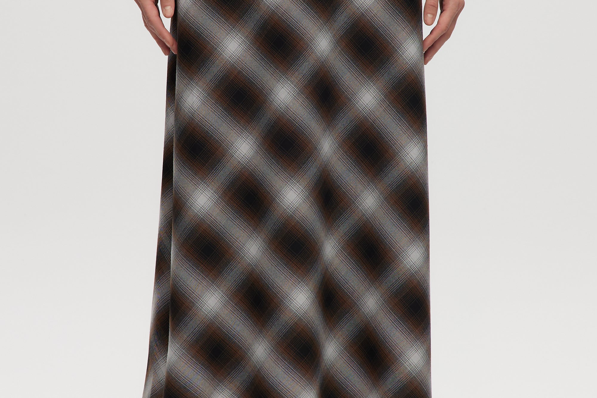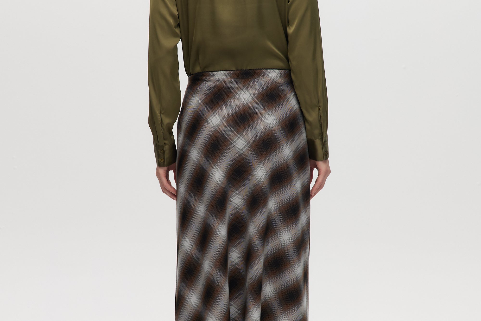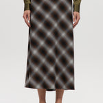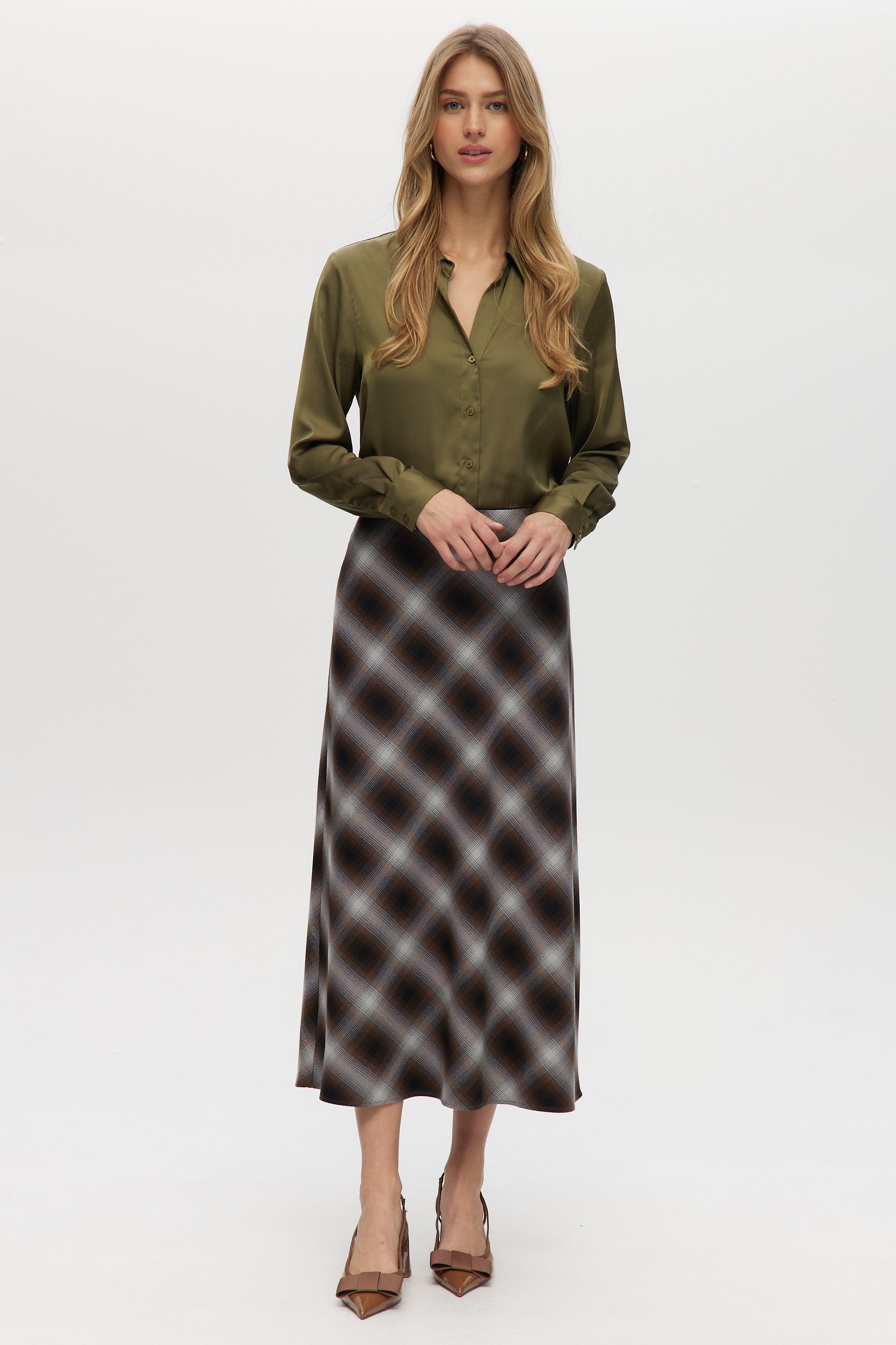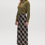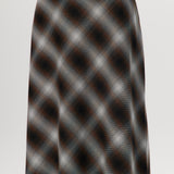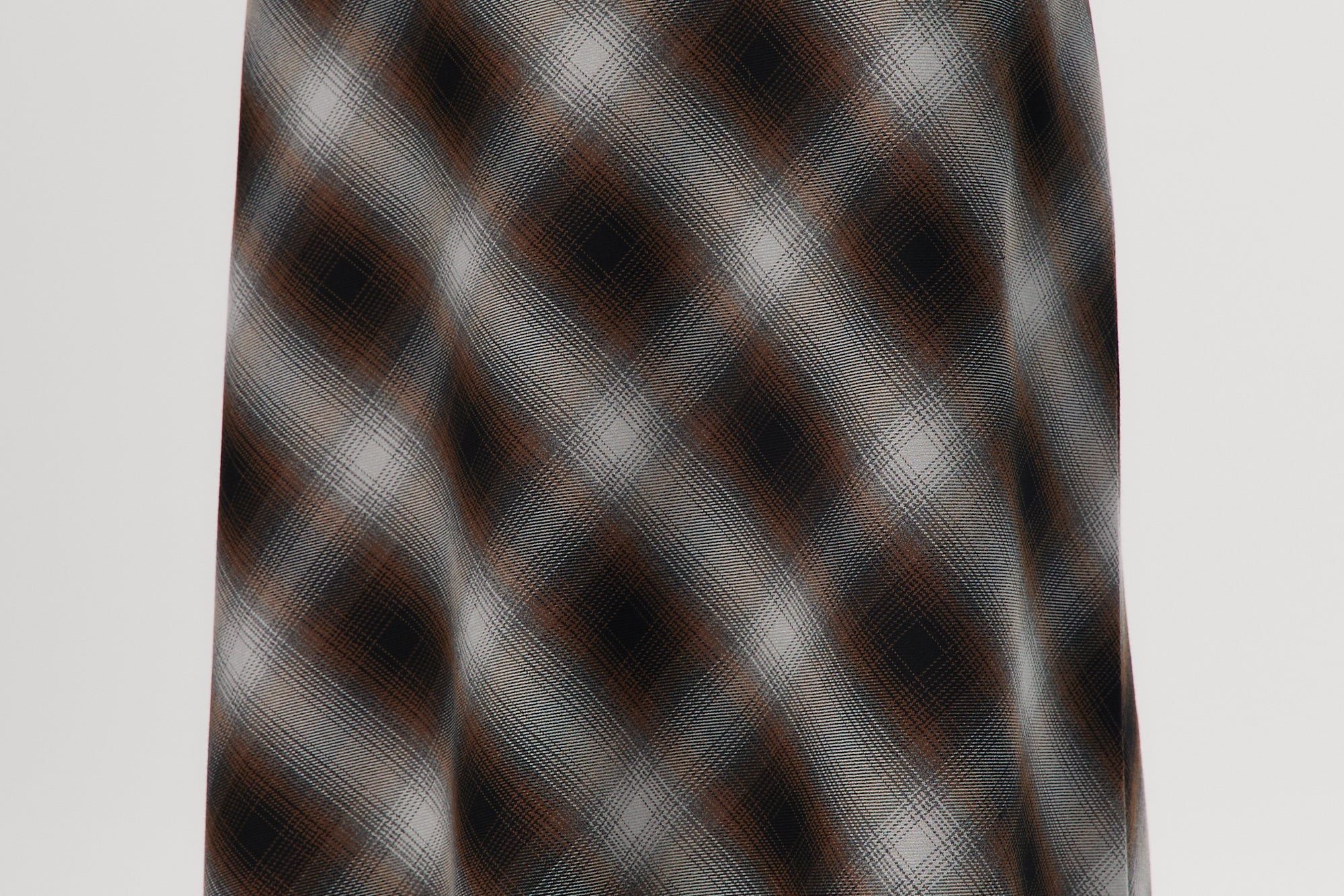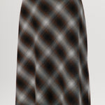 A high-waist flared midi skirt designed in a soft printed woven with a smooth drape. This style offers effortless movement thanks to its bias-inspired flare, creating a fluid and feminine silhouette. The waistband is finished with a scalloped elastic detail for added comfort and a clean, pull-on design. A versatile fall skirt that pairs beautifully with knits, blouses, or structured jackets.