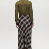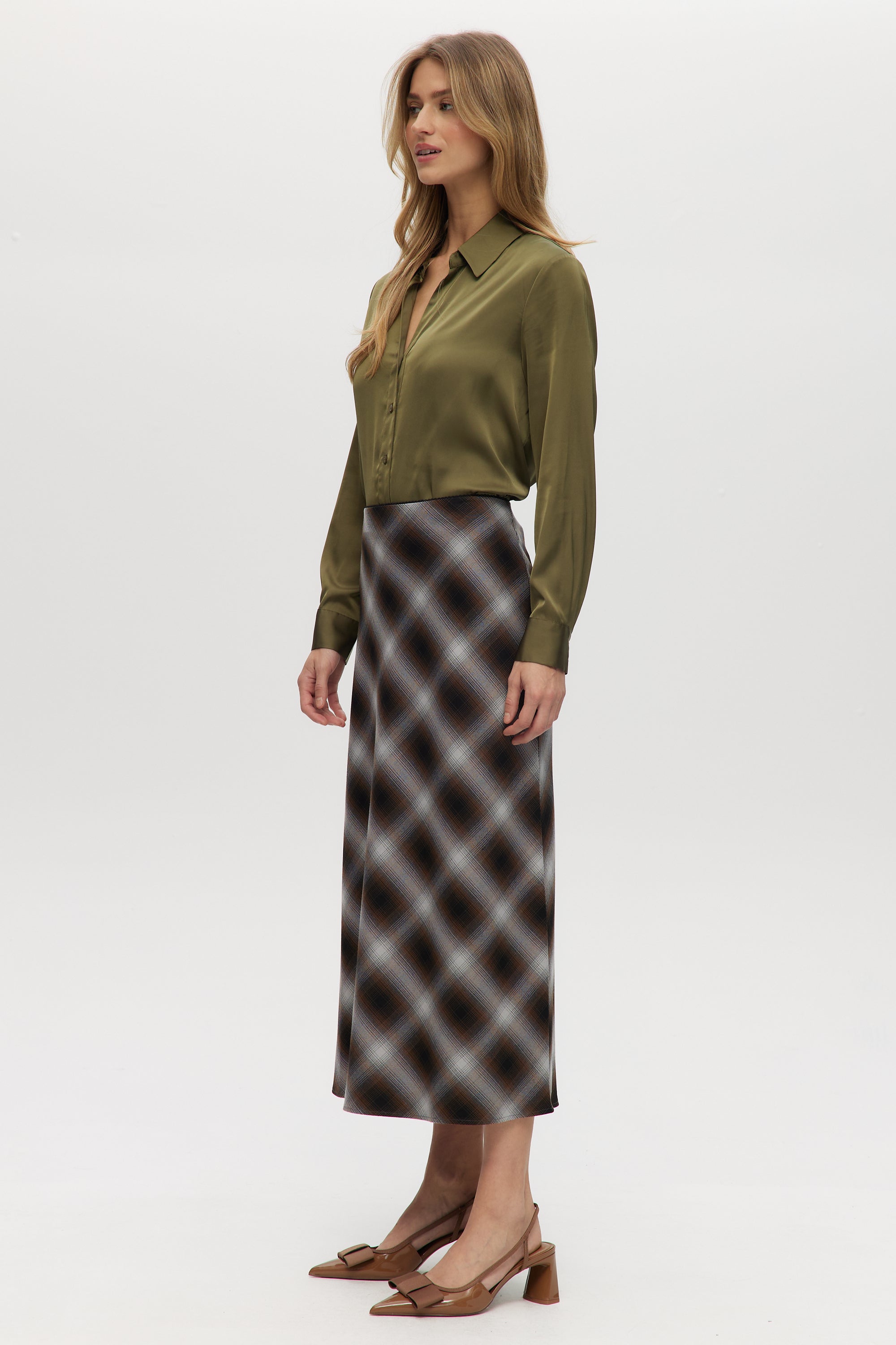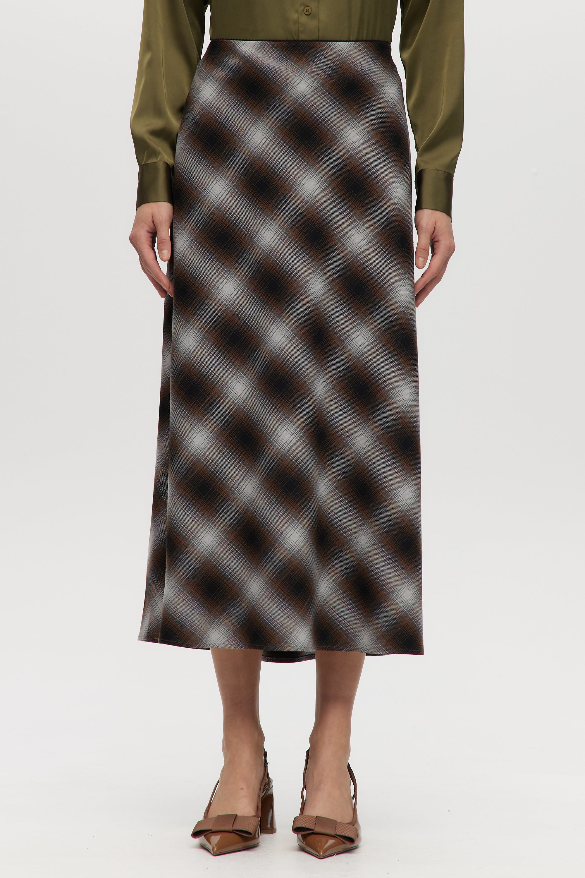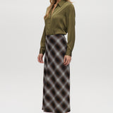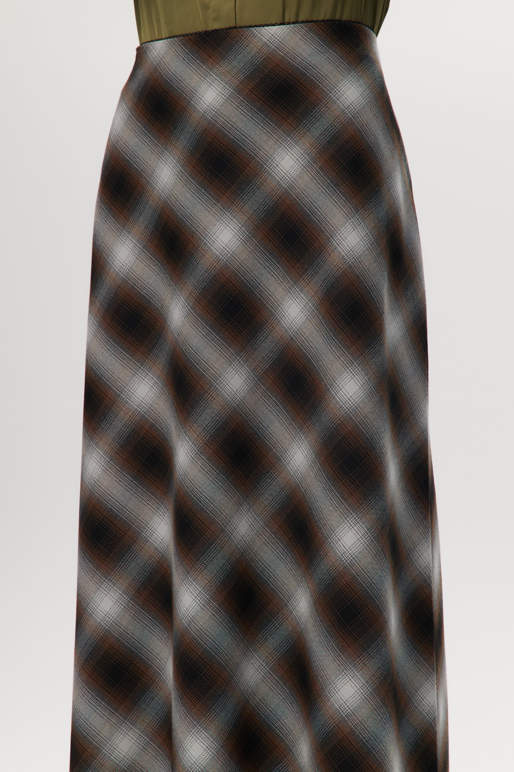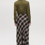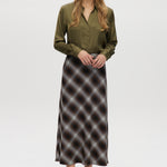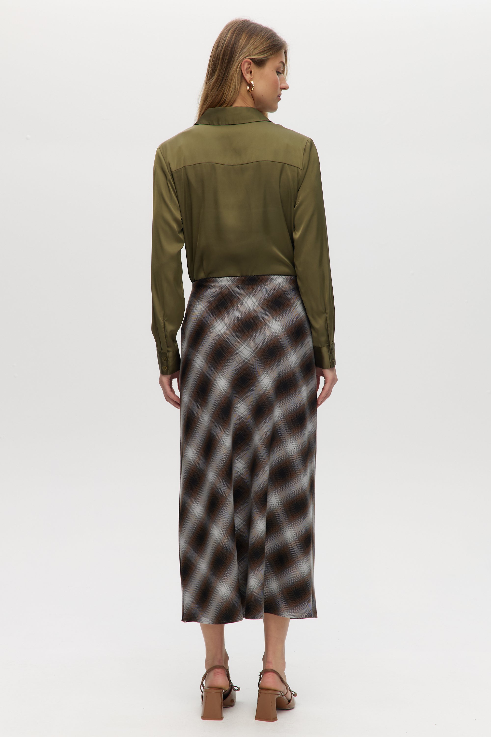 A high-waist flared midi skirt designed in a soft printed woven with a smooth drape. This style offers effortless movement thanks to its bias-inspired flare, creating a fluid and feminine silhouette. The waistband is finished with a scalloped elastic detail for added comfort and a clean, pull-on design. A versatile fall skirt that pairs beautifully with knits, blouses, or structured jackets.