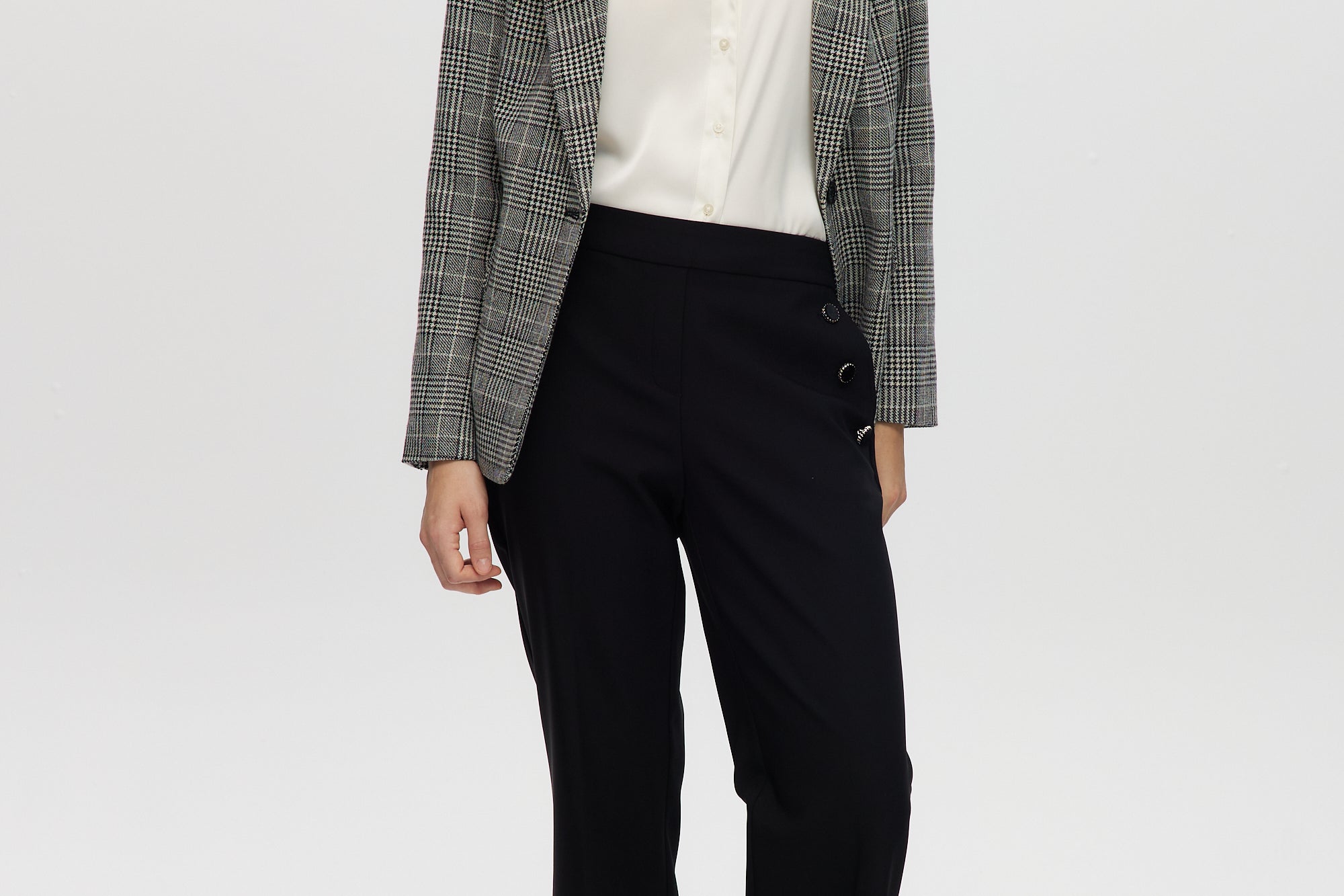 This modern-fit plaid blazer brings a polished, elevated touch to your fall wardrobe. Crafted in a wool-like woven fabric with a clean 26" CB length, it features a sleek one-button closure, tailored long sleeves, flap pockets, and a vent for comfortable movement. A removable light-gold crystal brooch adds a refined statement detail, making it perfect for both work and evening styling.