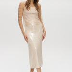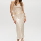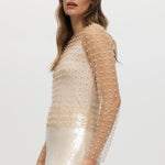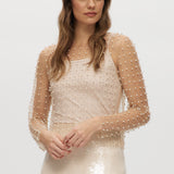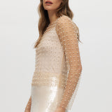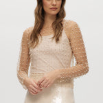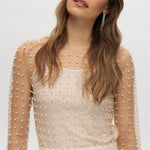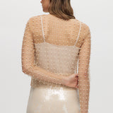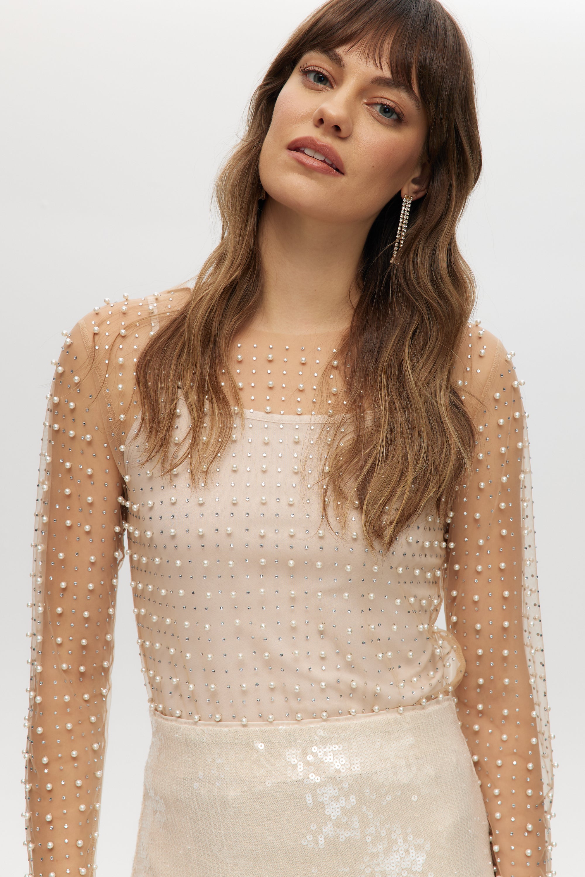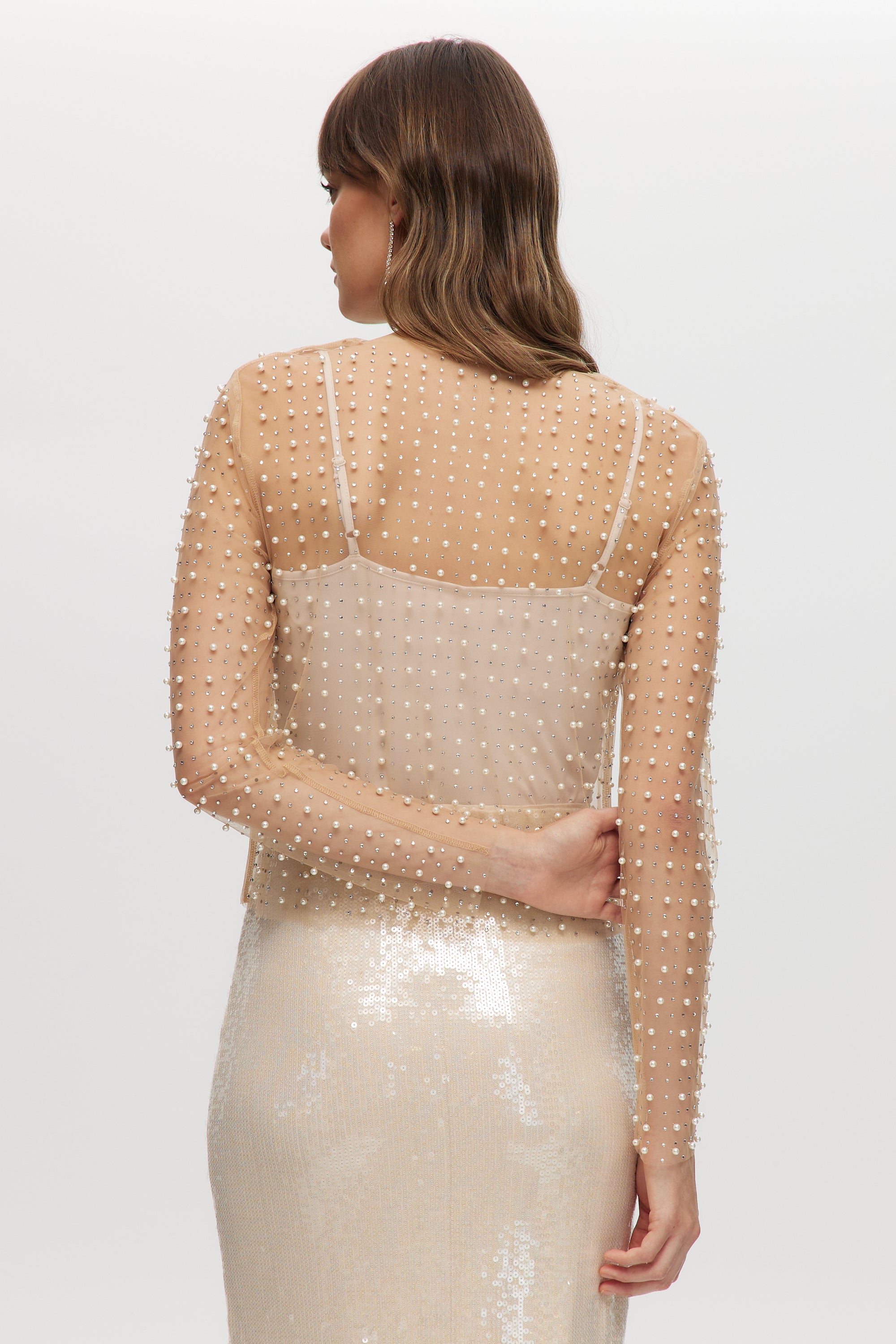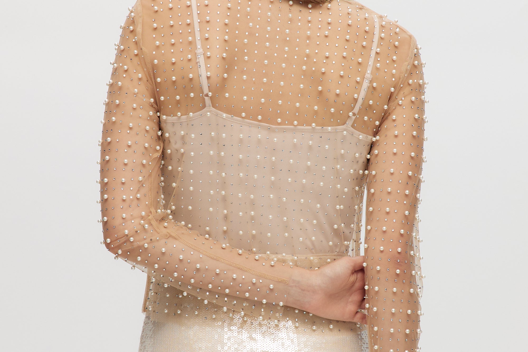 Add a touch of sparkle to your winter wardrobe. This elegant long sleeve mesh top features delicate beaded pearls and rhinestones, layered over a removable knit cami with adjustable straps. Its the perfect festive piece for holiday events and evening gatherings.