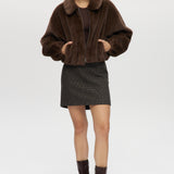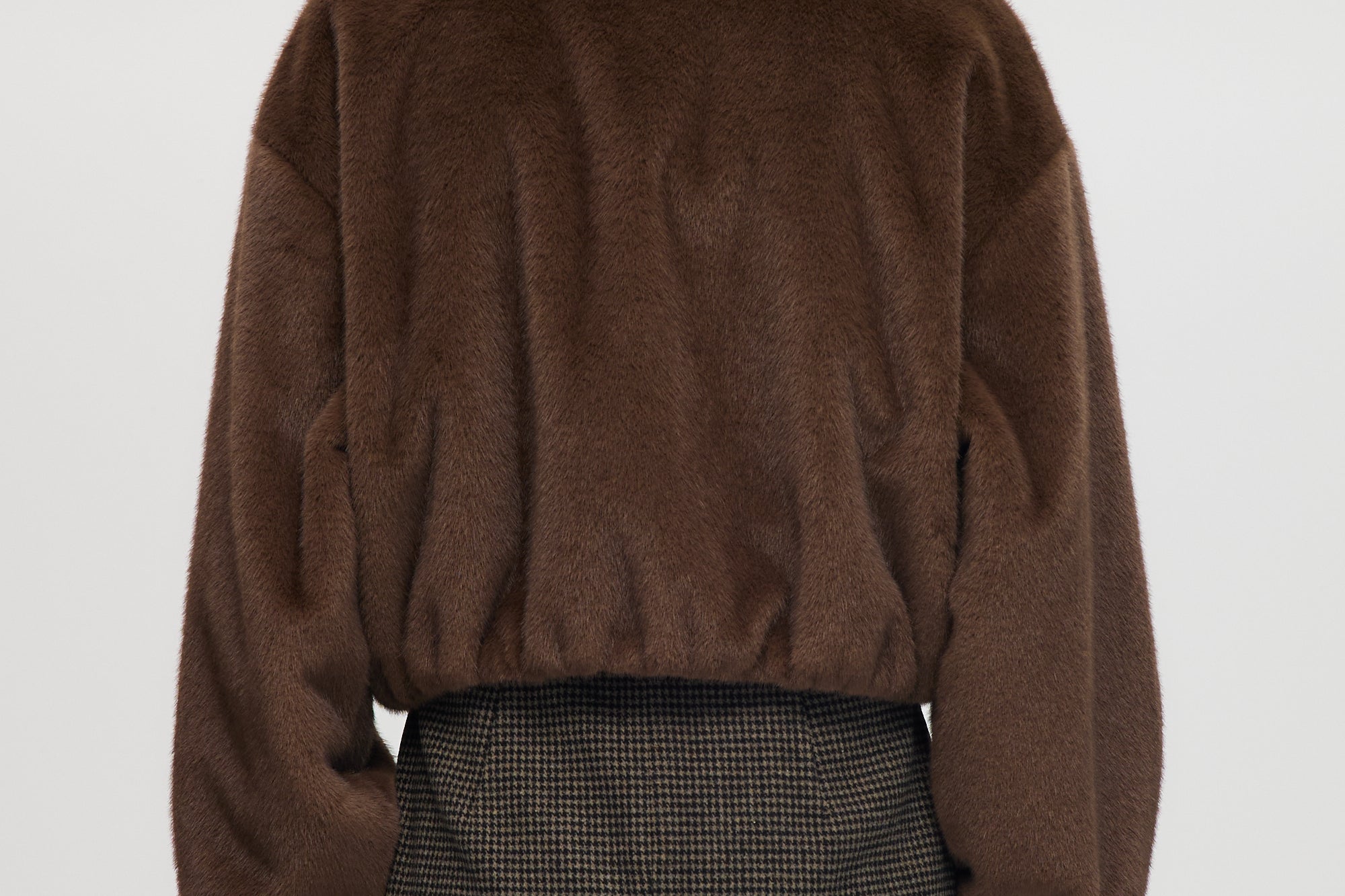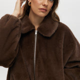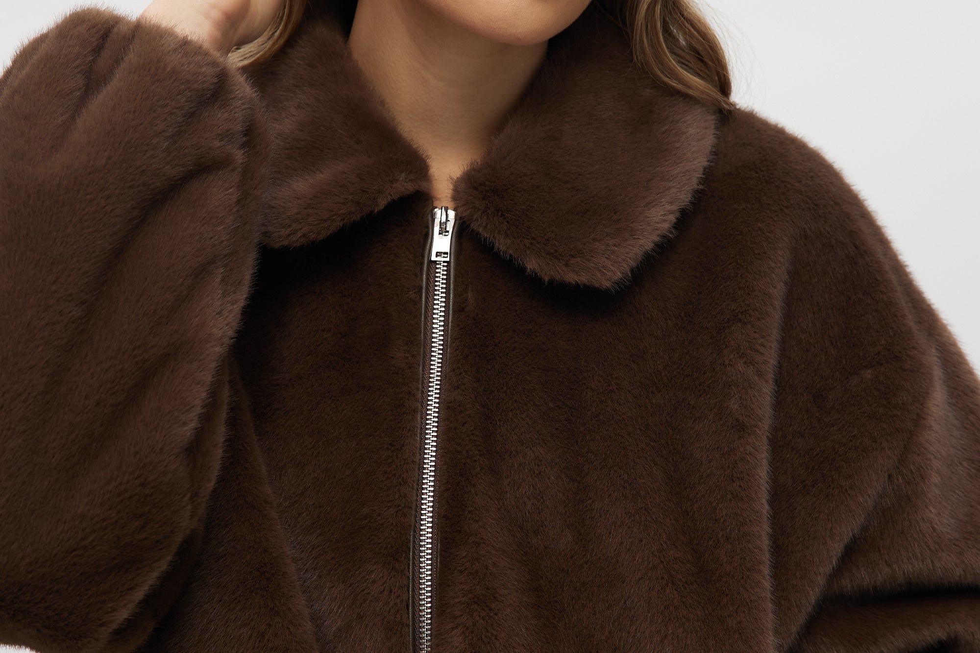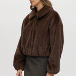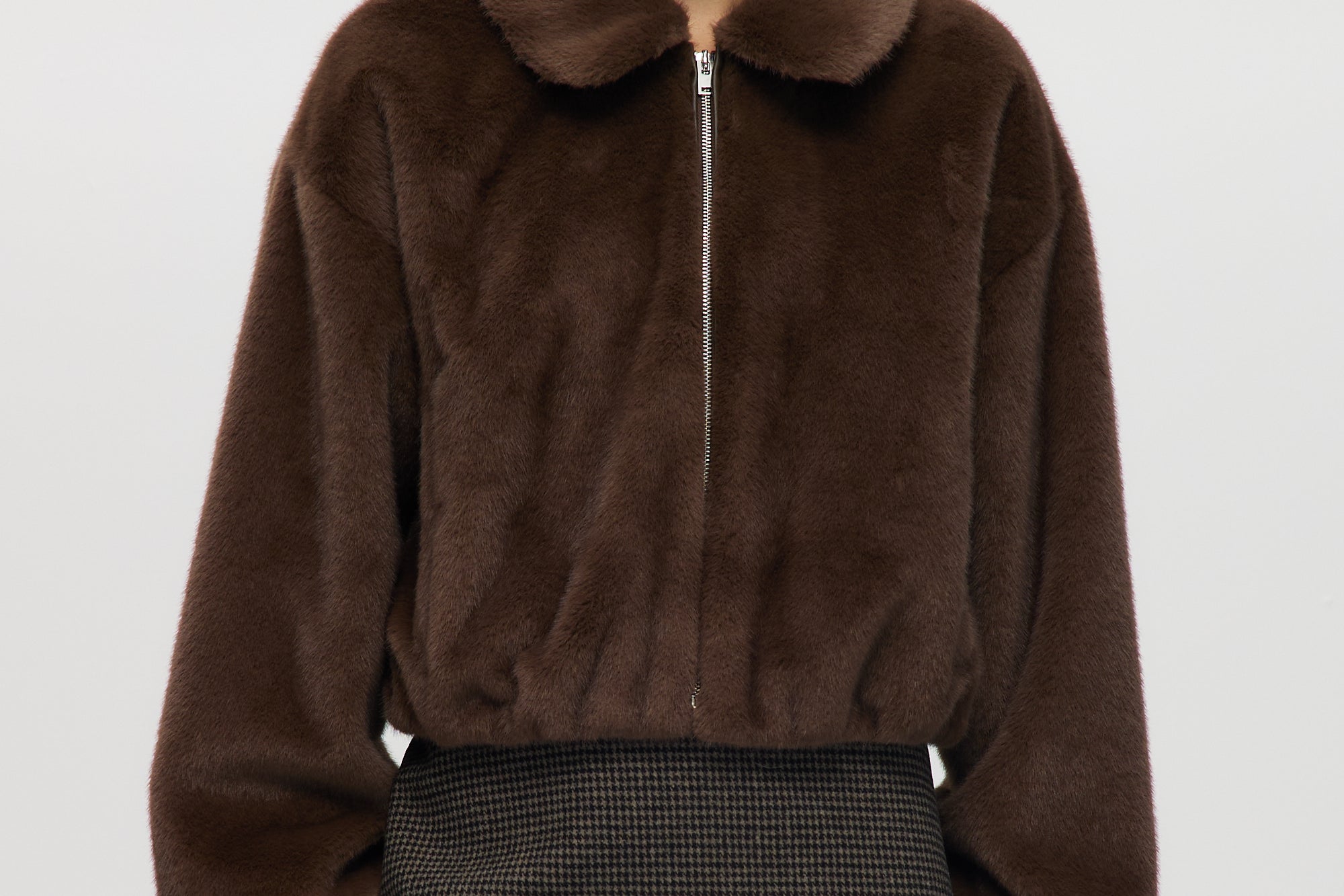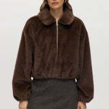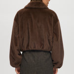 Elevate your outerwear game with this ultra-soft vegan fur bomber. With its cropped cut, plush collar, and elasticized hem, it blends glamour and edge in one cozy piece. Perfect for layering over casual or dressed-up looks.