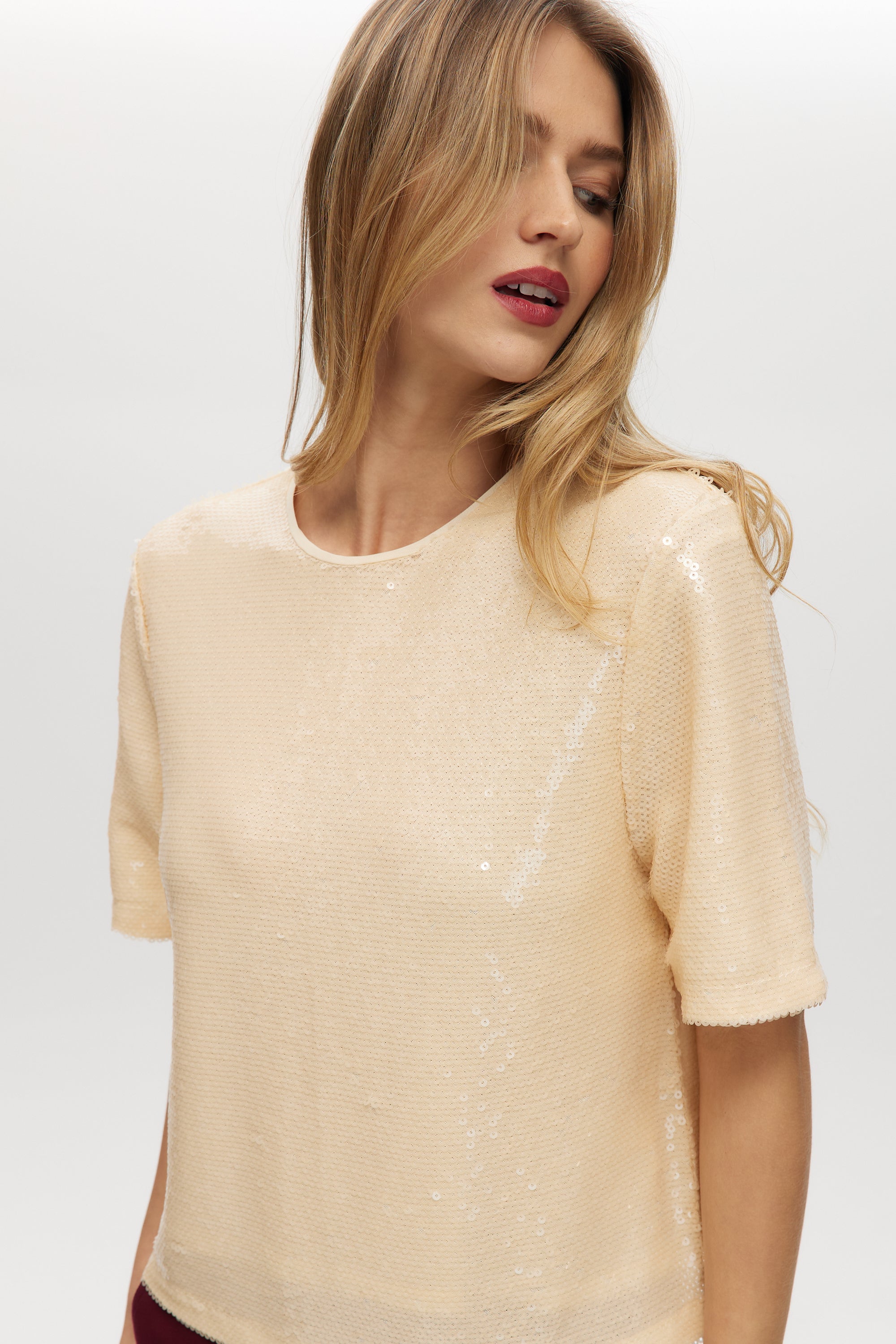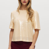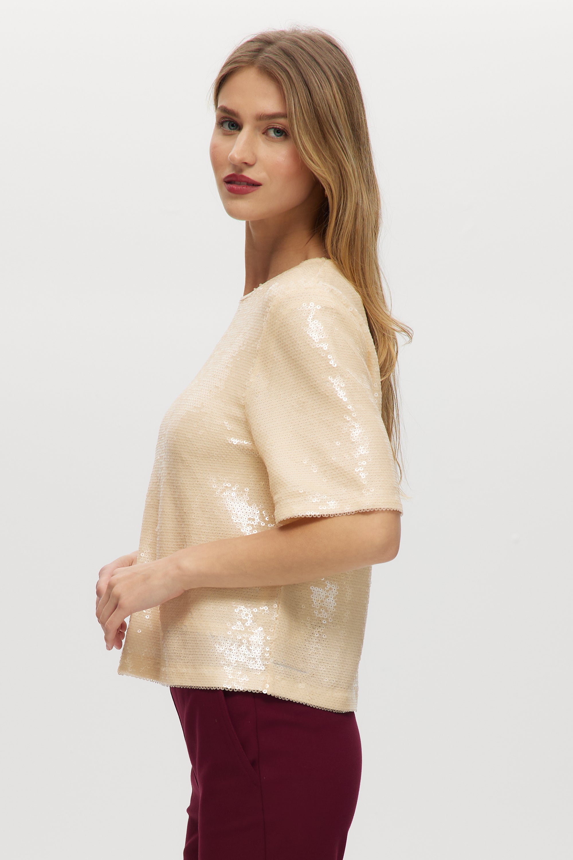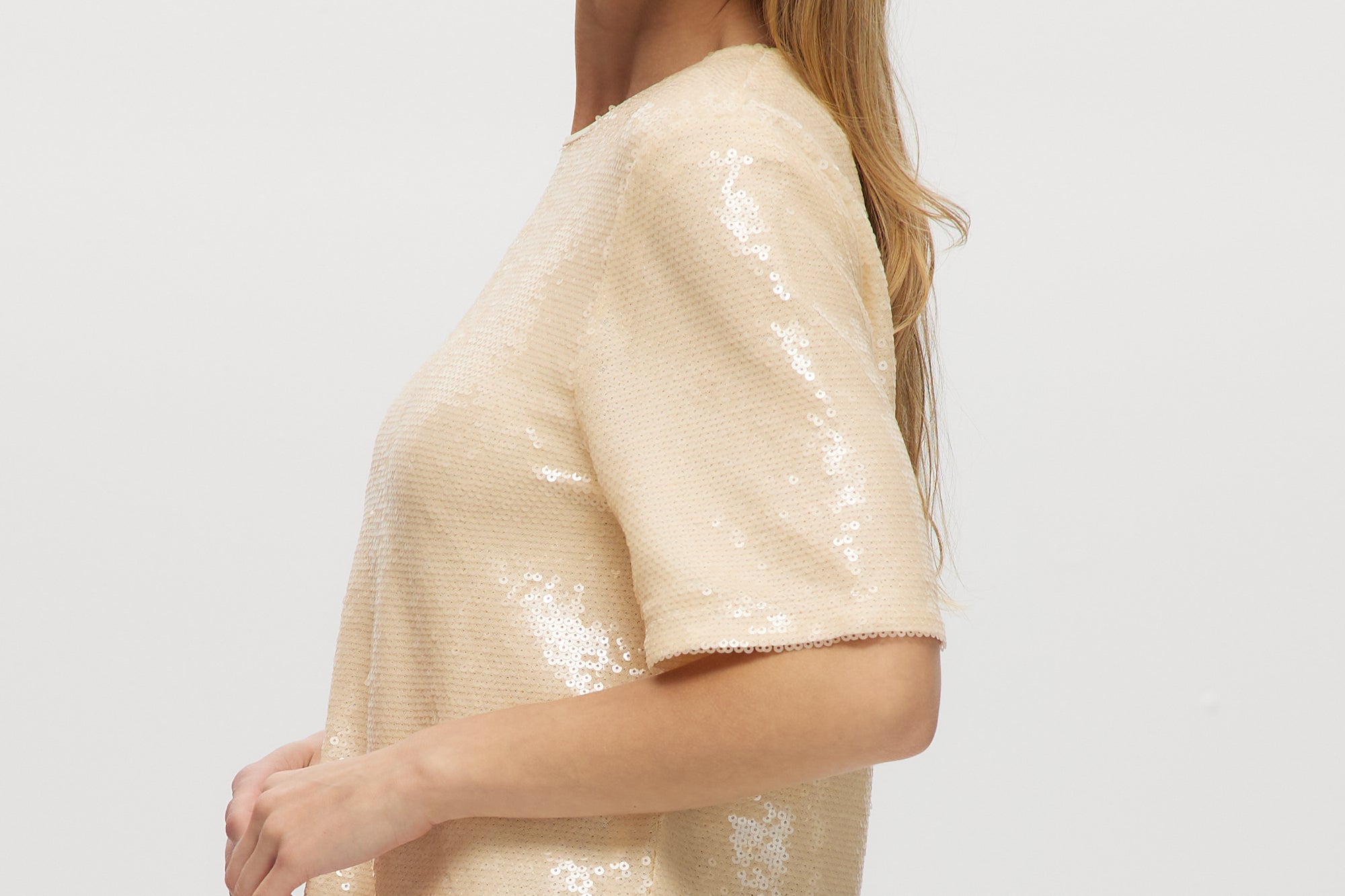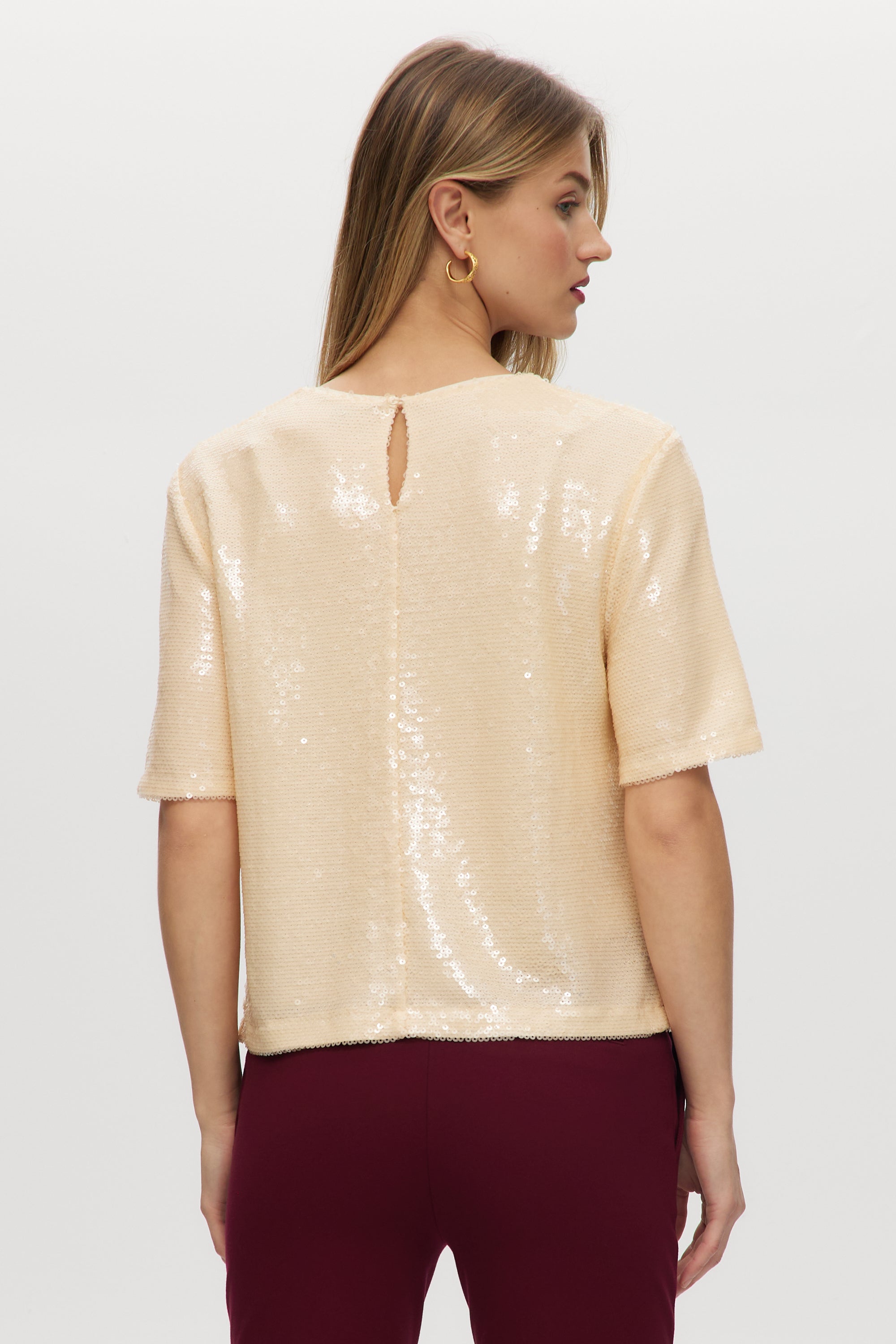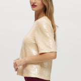 Shimmer and shine in this short sleeve sequin tee designed to light up the holiday season. With a comfortable stretch and soft lining, this festive top is a perfect match for your winter celebrations.