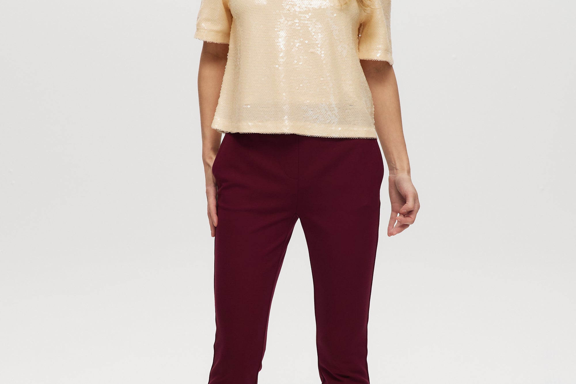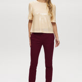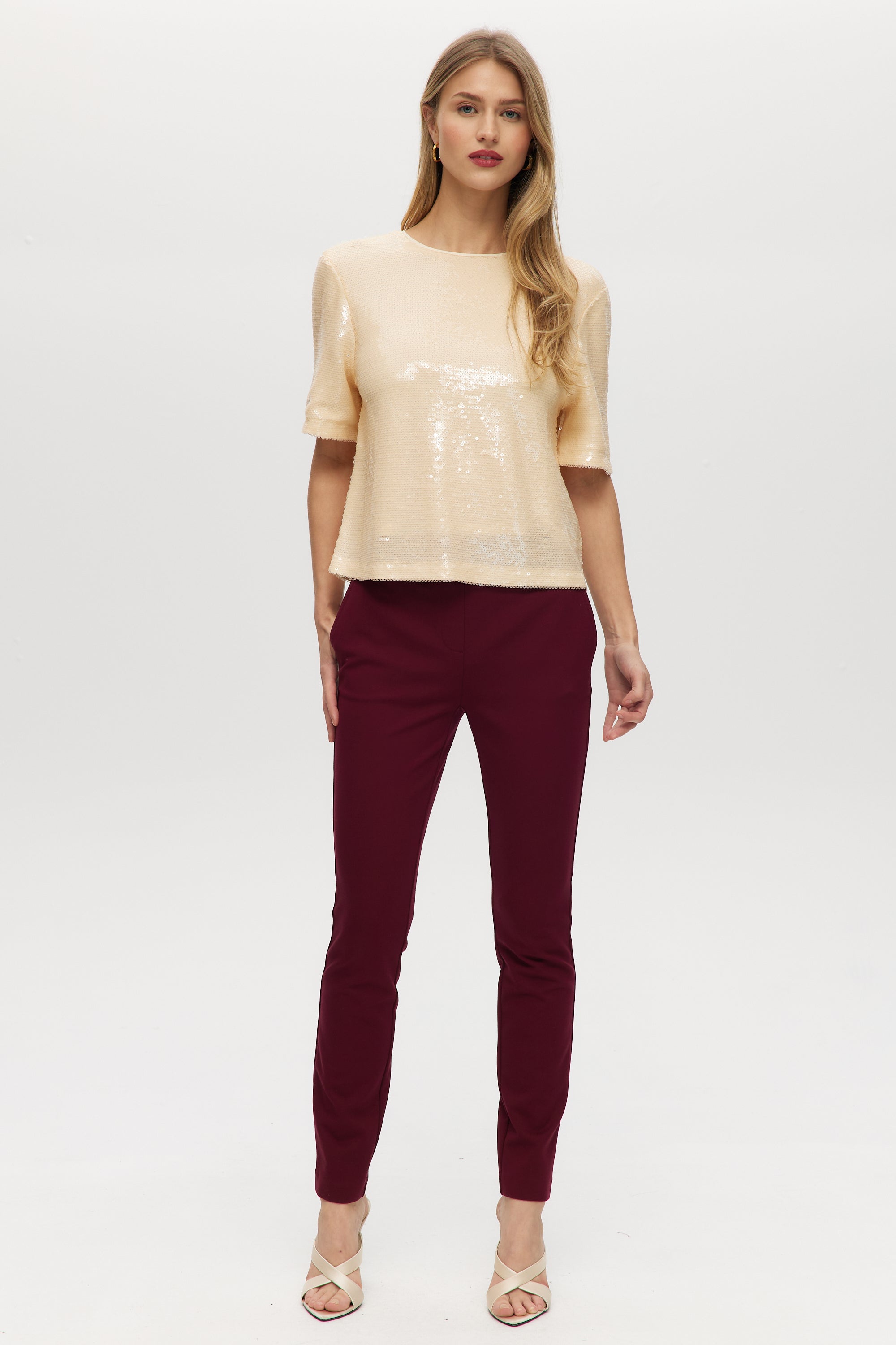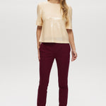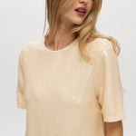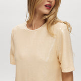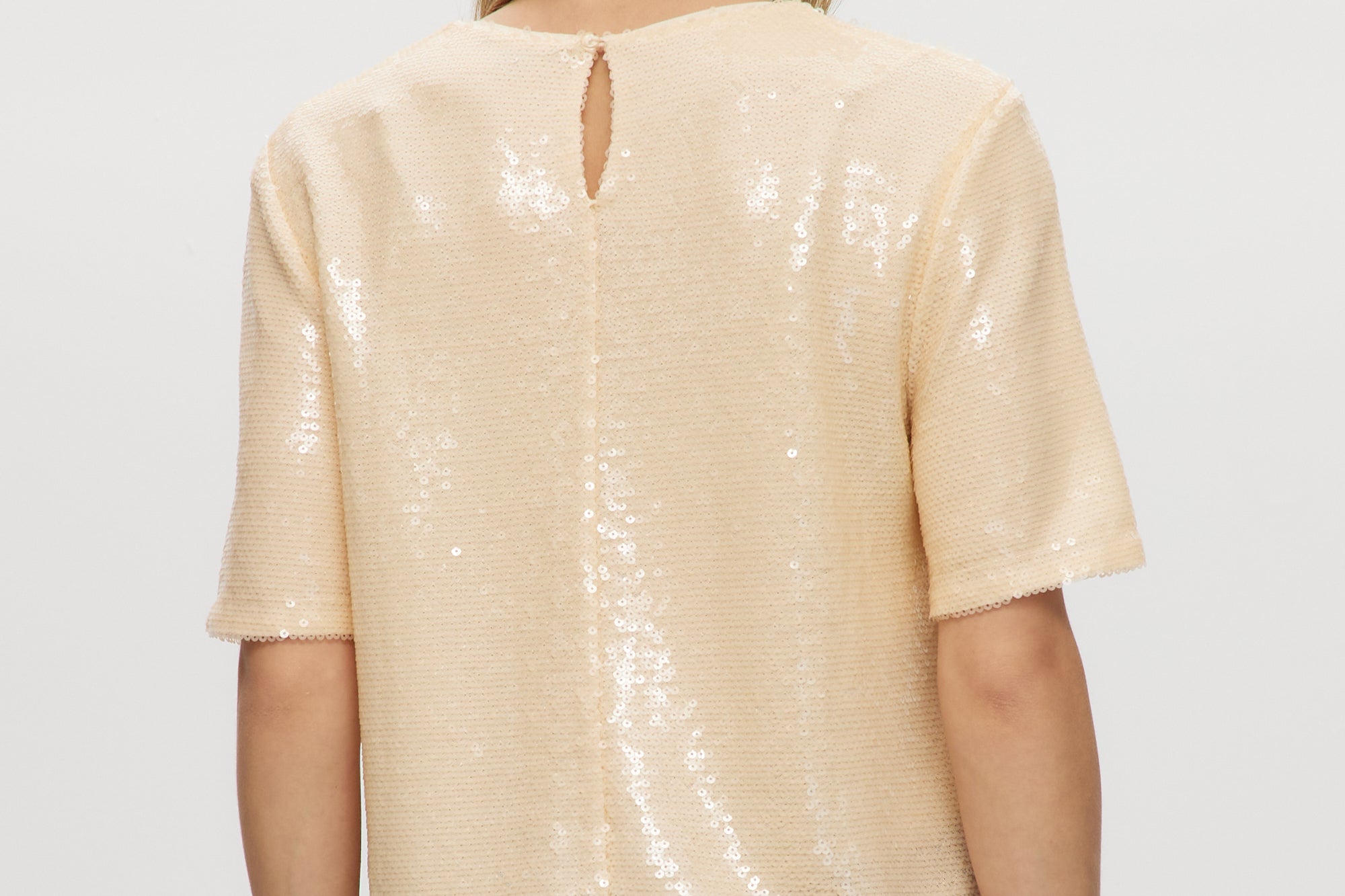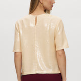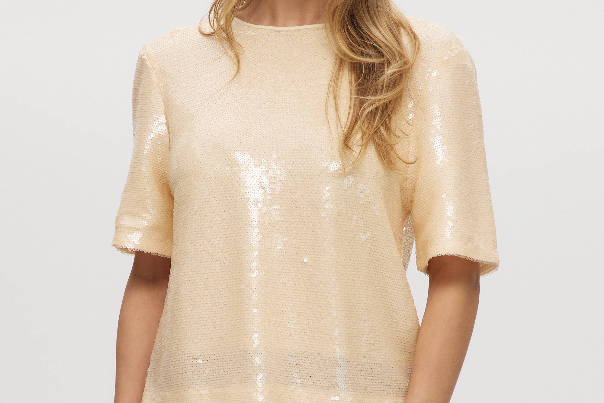 Shimmer and shine in this short sleeve sequin tee designed to light up the holiday season. With a comfortable stretch and soft lining, this festive top is a perfect match for your winter celebrations.
