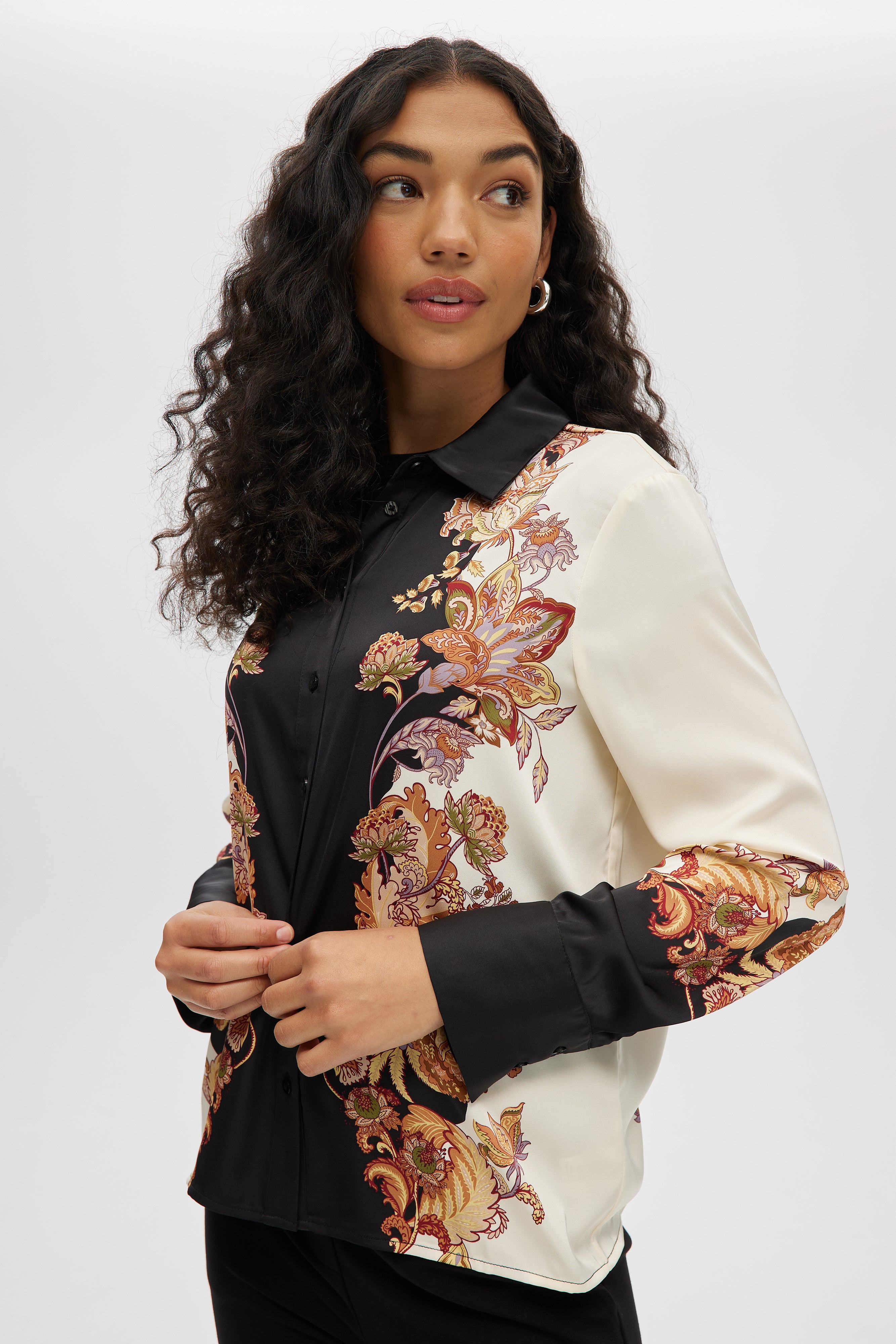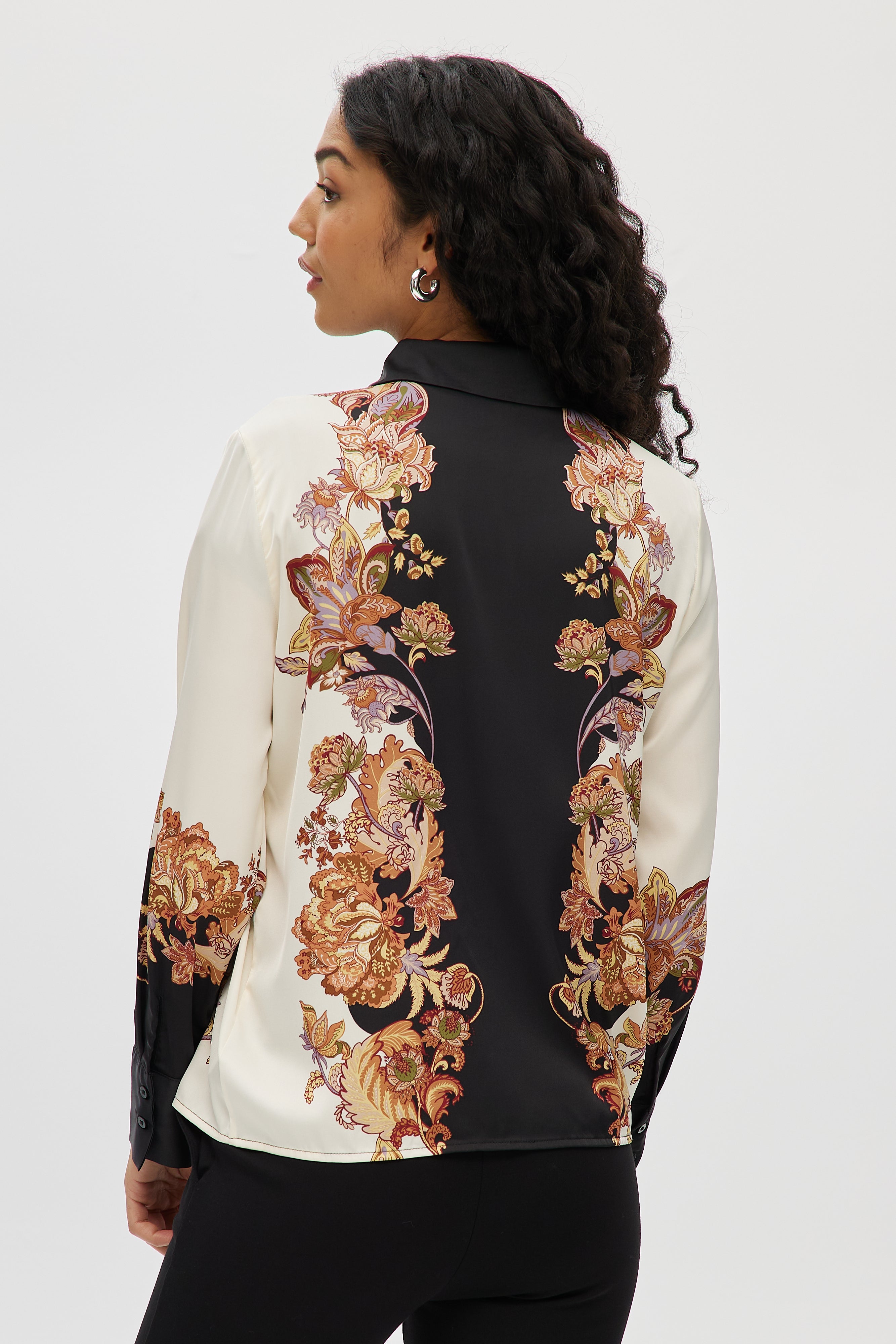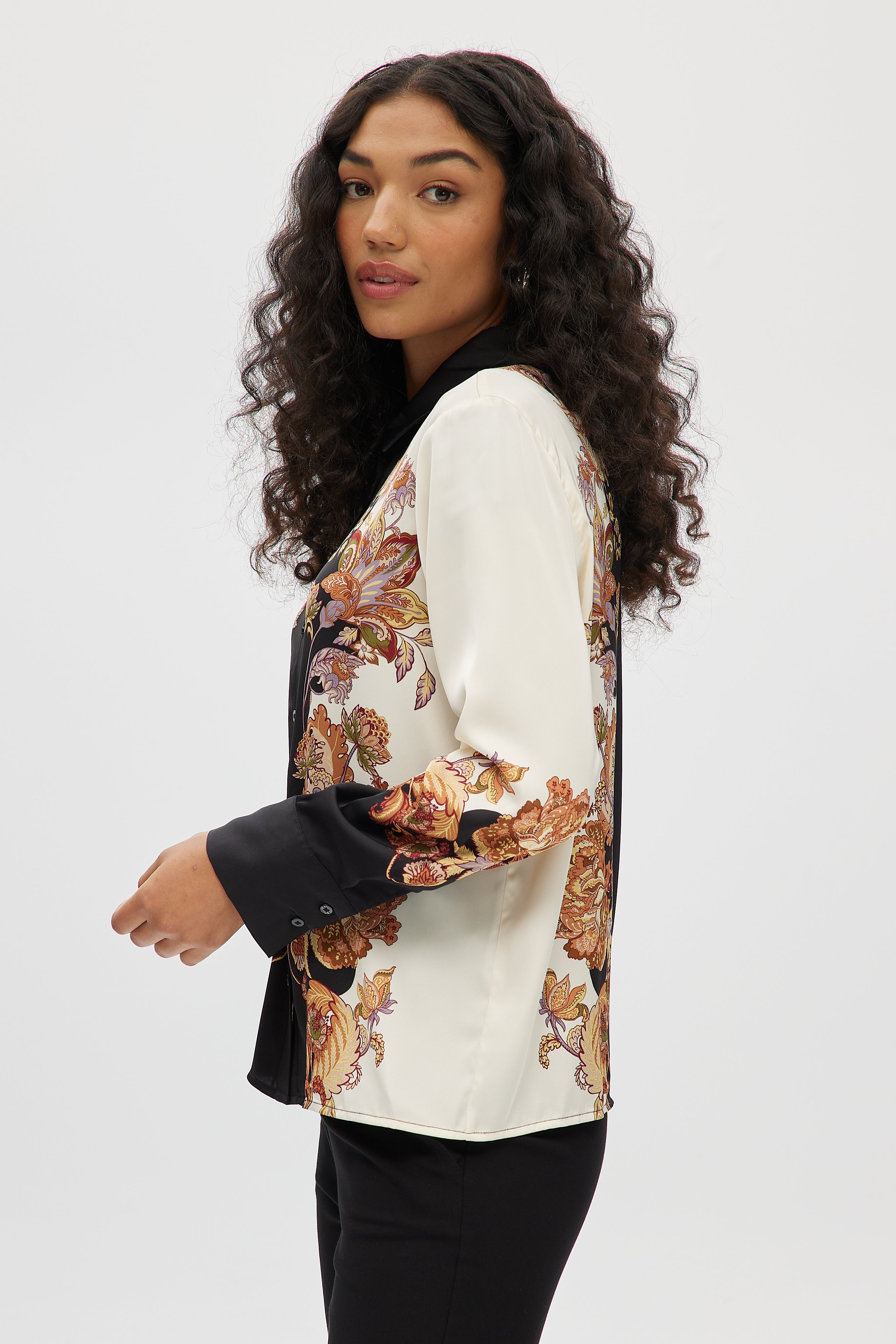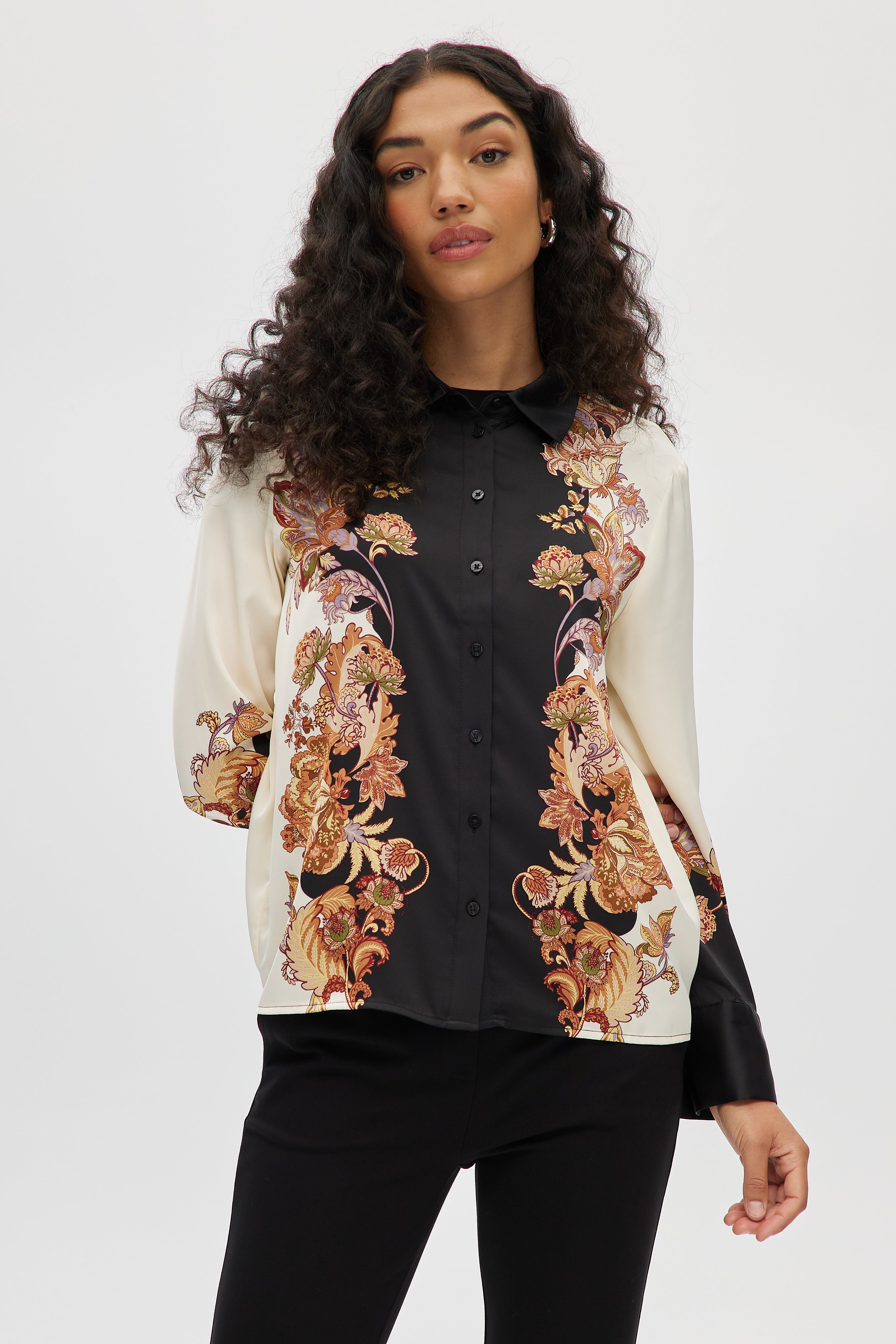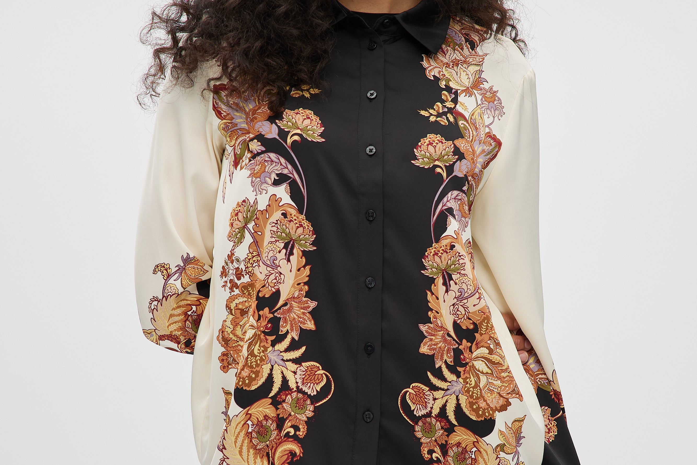 An eye-catching statement piece designed to elevate your everyday look. This long sleeve satin shirt features a bold mirrored floral print at the front, balanced by solid contrast details at the collar, placket, and cuffs for a refined finish. Its soft satin drape makes it effortlessly elegantperfect for layering over tailored pants or tucking into your favorite denim for a chic day-to-night outfit. A standout piece for those who love mixing classic tailoring with artistic prints.
