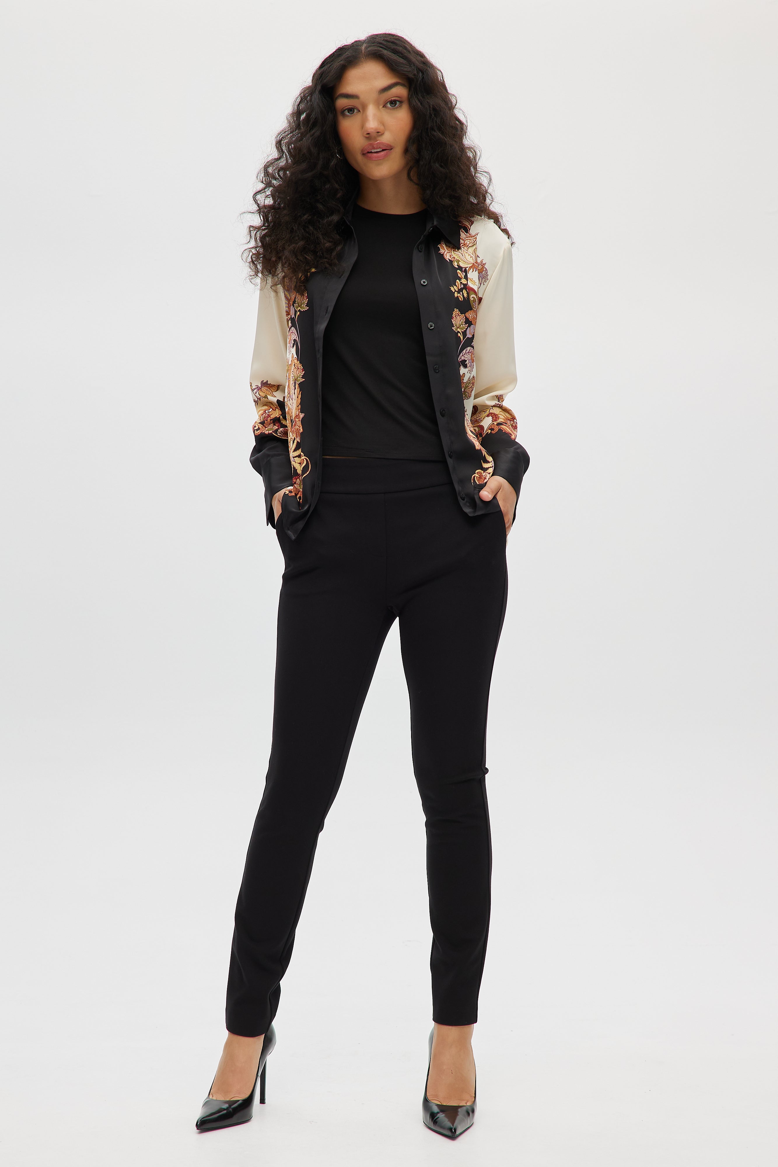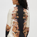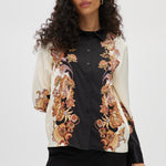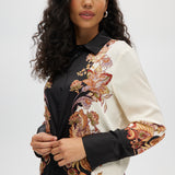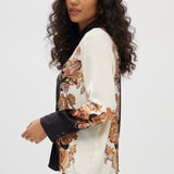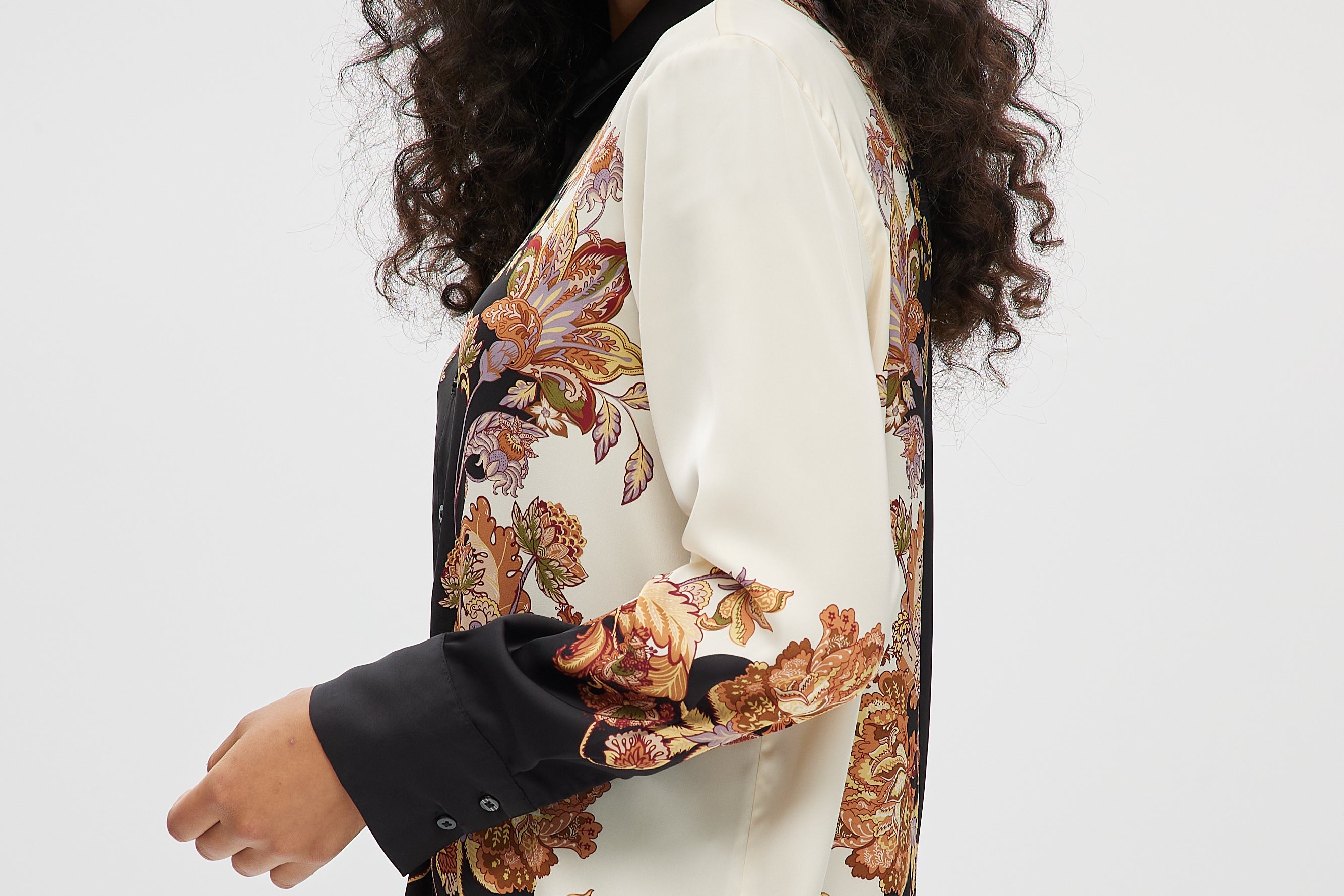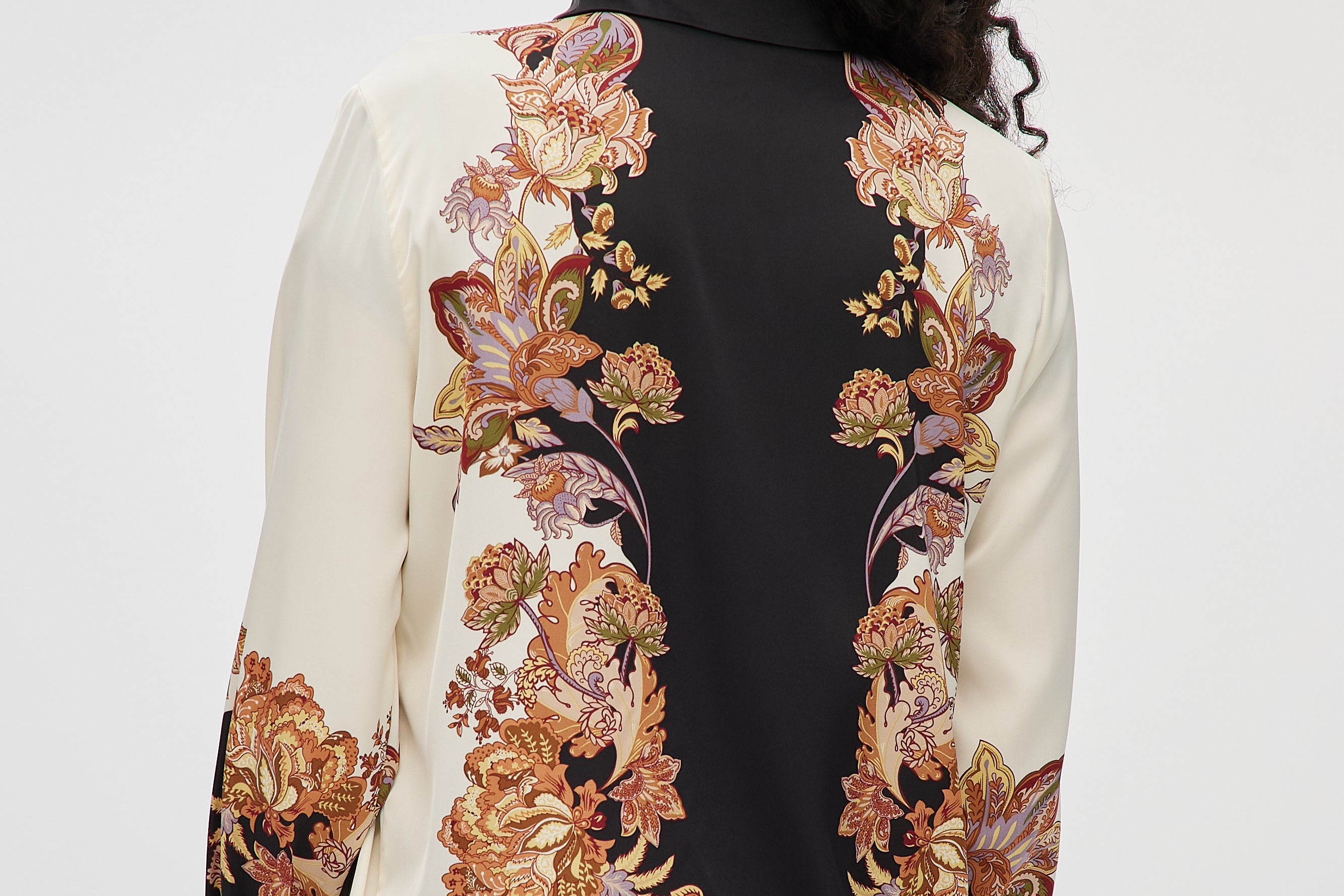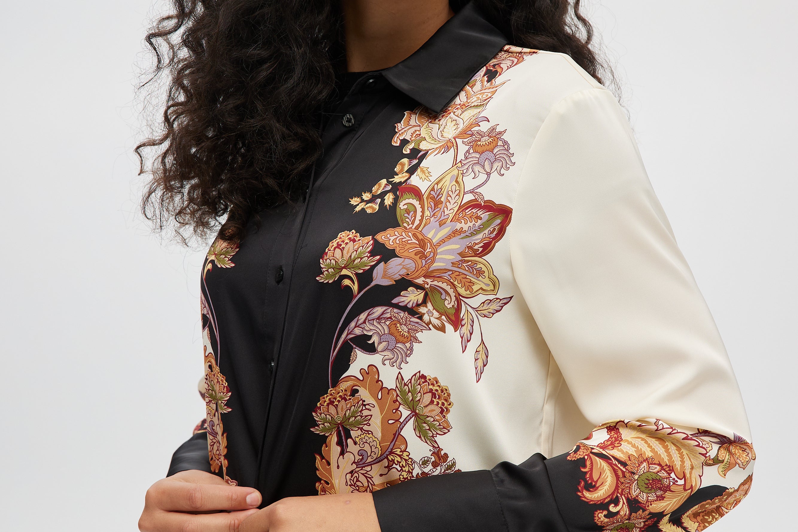 An eye-catching statement piece designed to elevate your everyday look. This long sleeve satin shirt features a bold mirrored floral print at the front, balanced by solid contrast details at the collar, placket, and cuffs for a refined finish. Its soft satin drape makes it effortlessly elegantperfect for layering over tailored pants or tucking into your favorite denim for a chic day-to-night outfit. A standout piece for those who love mixing classic tailoring with artistic prints.