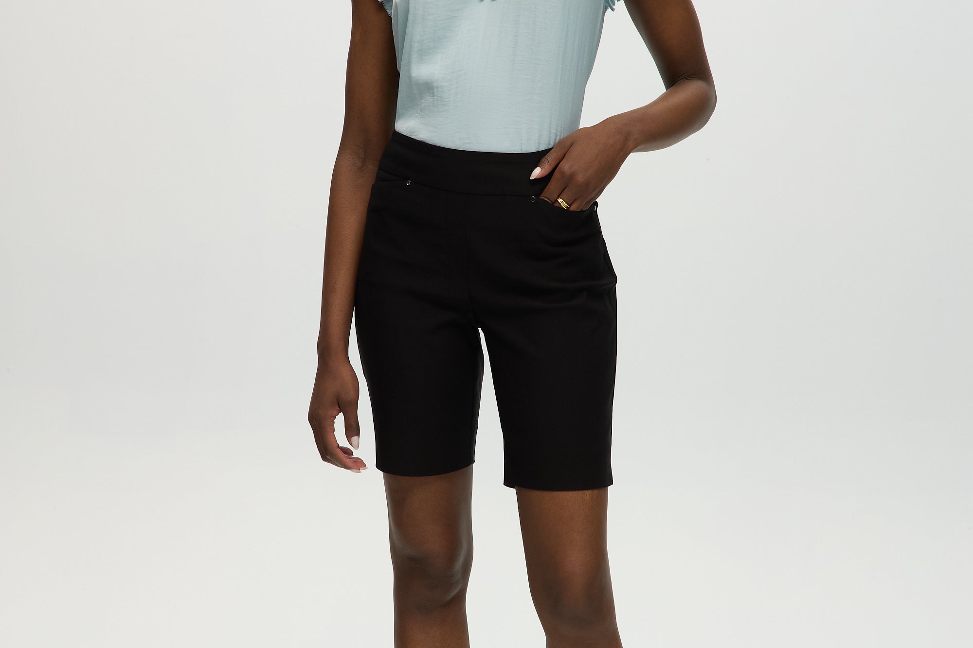 These eco-friendly pull-on Bermuda shorts feature a tummy control waistband, 9" inseam, and a sleek skinny fit. Designed with real front pockets and bottom slits, they pair effortlessly with breezy tops and sandals for casual outings or dressier blouses and wedges for elevated summer looks.