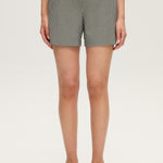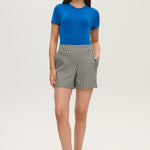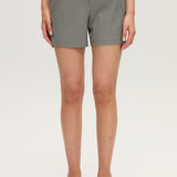 These tailored pull-on Bermuda shorts feature a classic black-and-white check pattern for a timeless and stylish look. With a 5" inseam, side pockets, and subtle back pocket details, they offer a polished fit and the comfort of sustainable super stretch woven fabric. Perfect for pairing with solid tops for a chic summer outfit..