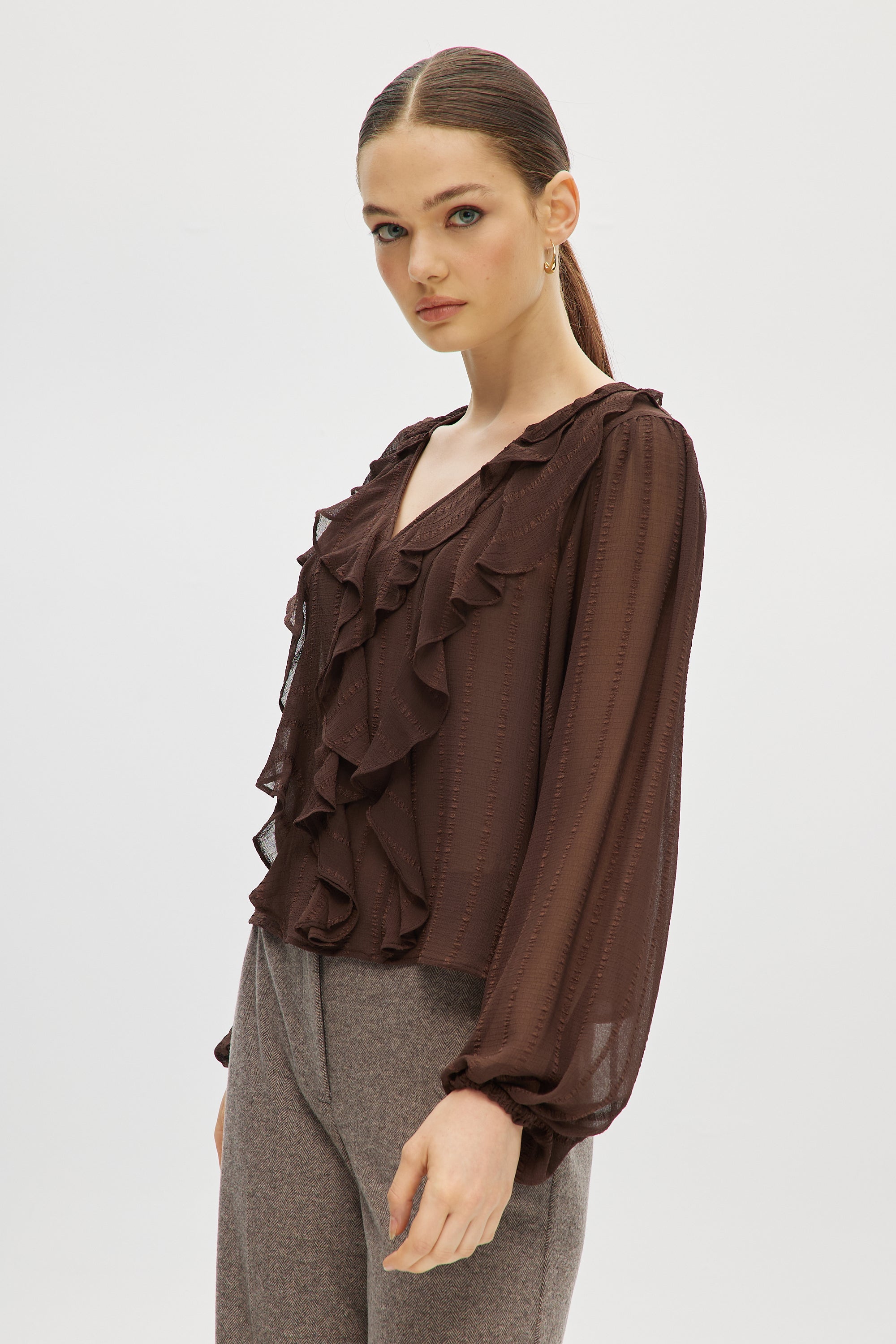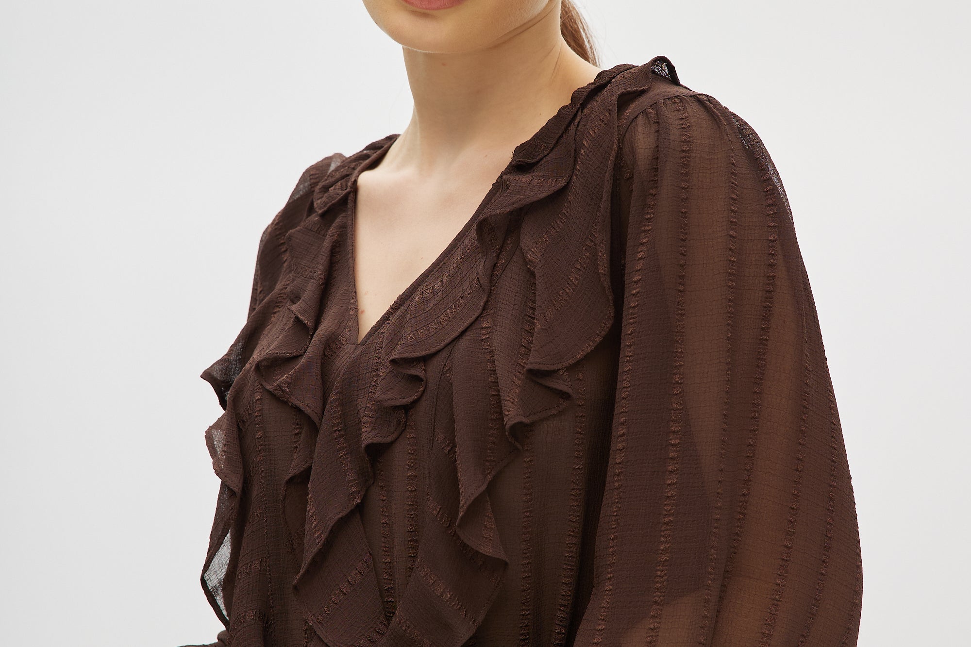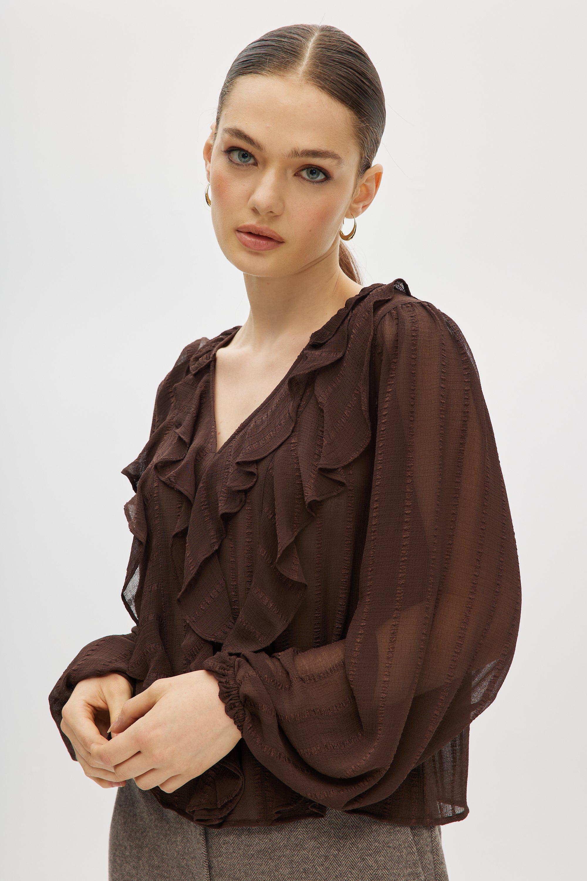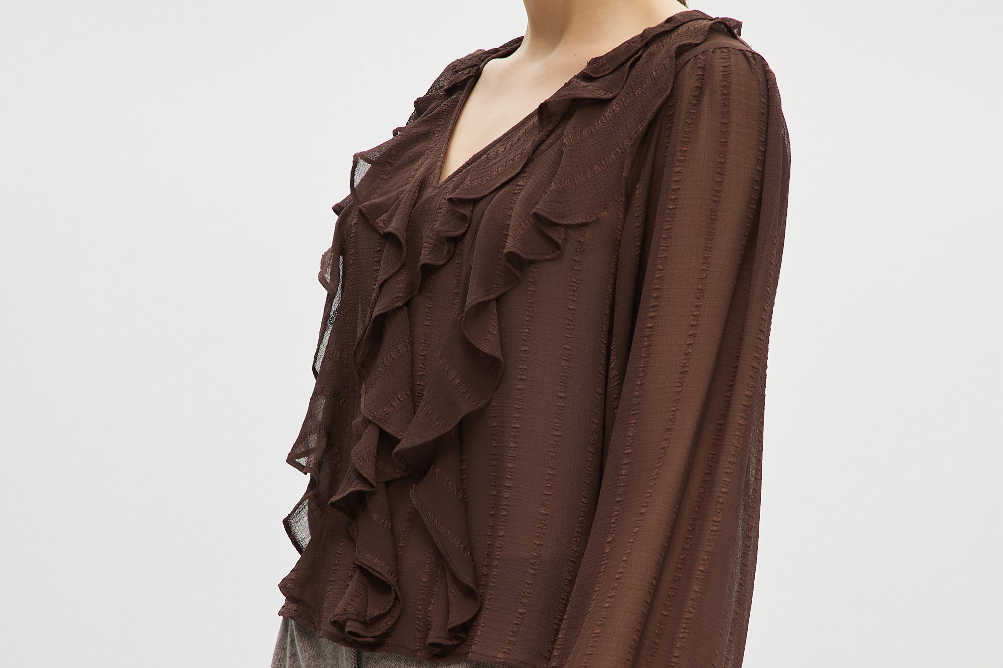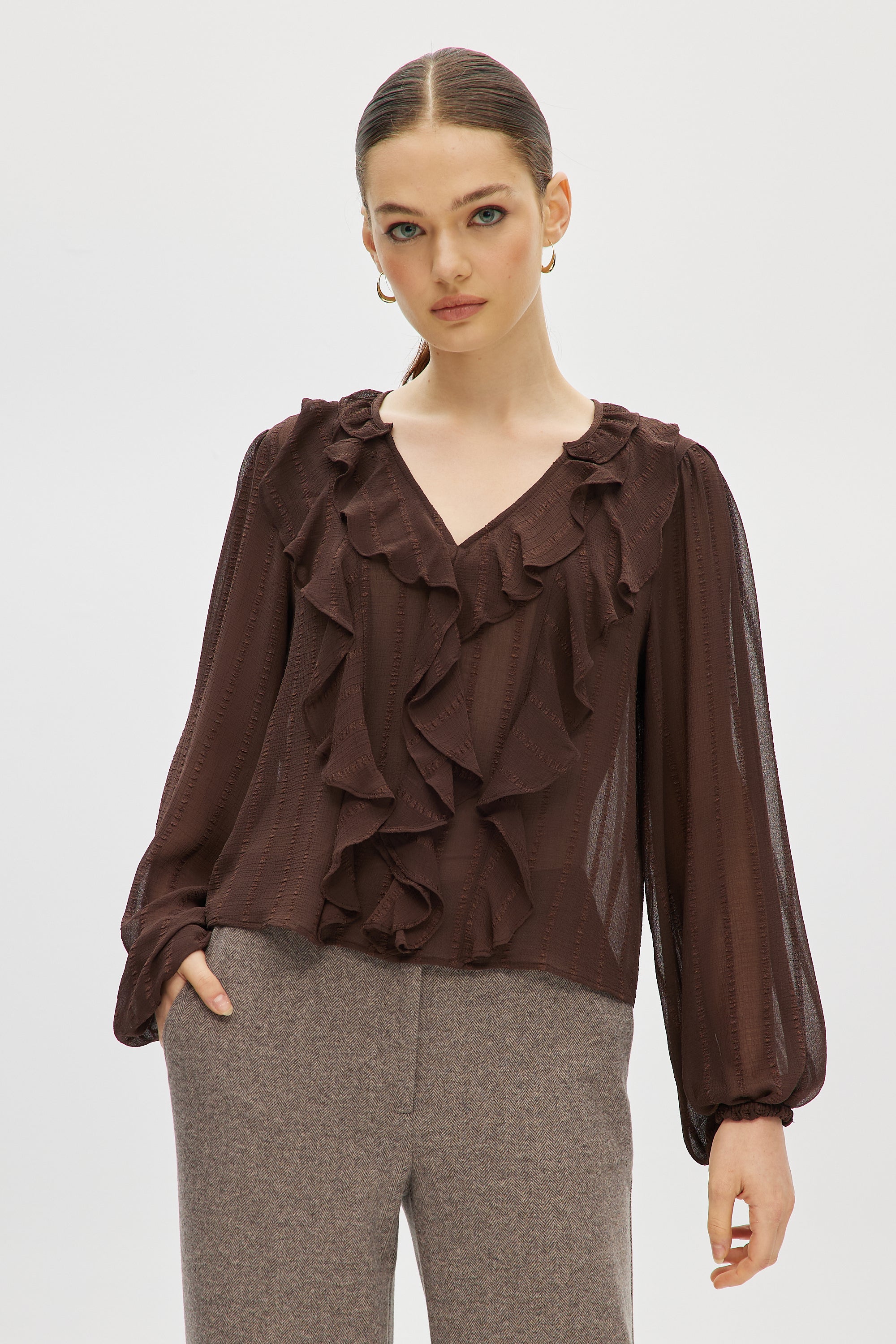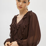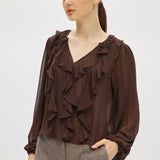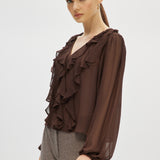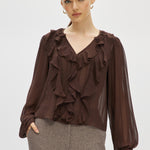 Softly structured and ultra-feminine, this popover shirt brings graceful volume with cascading ruffles framing the neckline and bodice. Made from lightweight polyester, it features a flattering V-neckline, elasticized cuffs, and a relaxed fit that works tucked in or worn loose. A perfect piece for desk-to-dinner styling, available in timeless Black and deep Java.