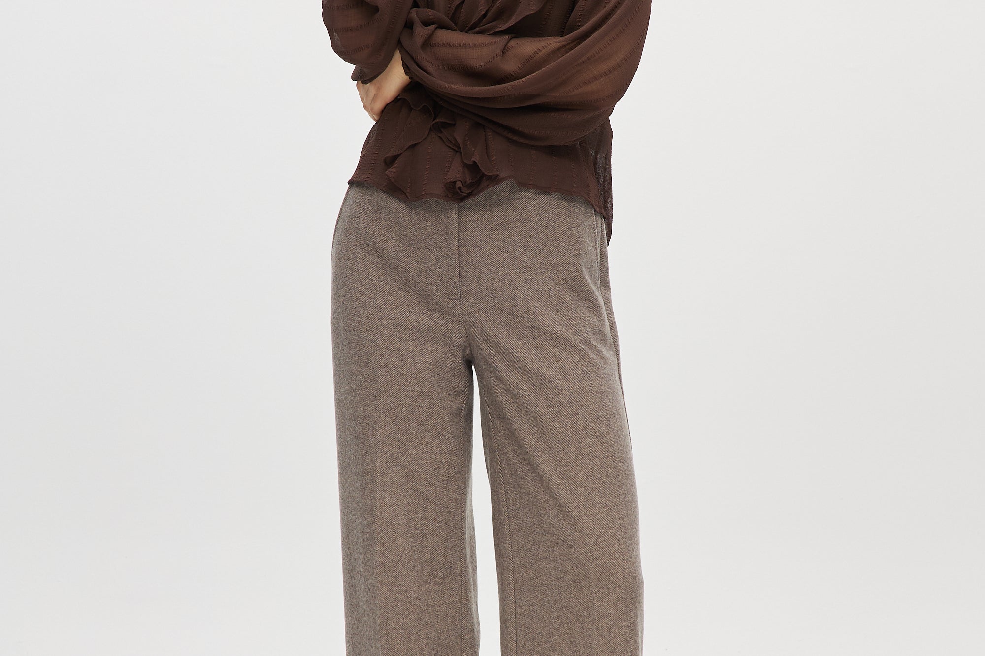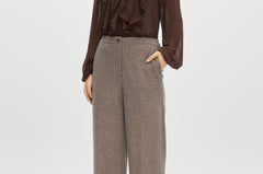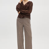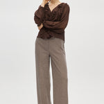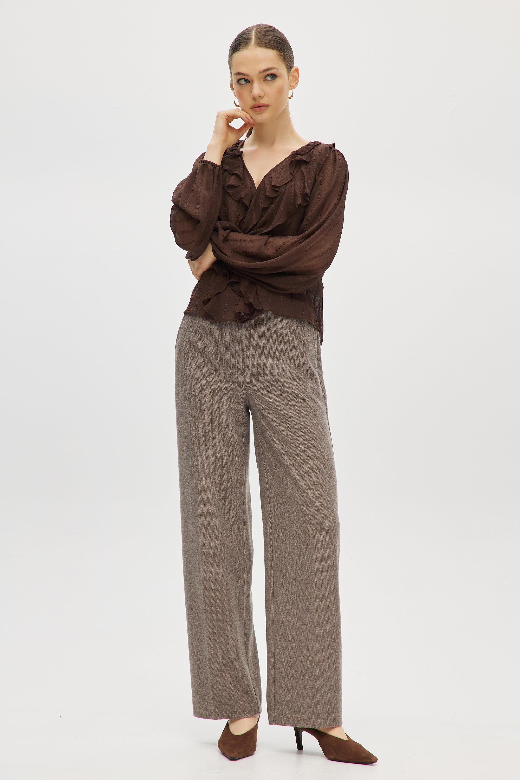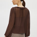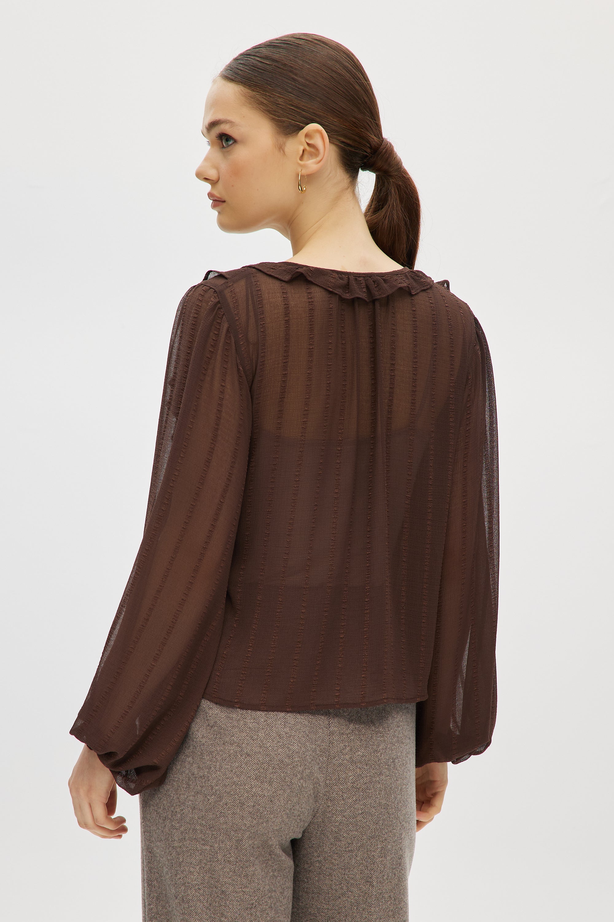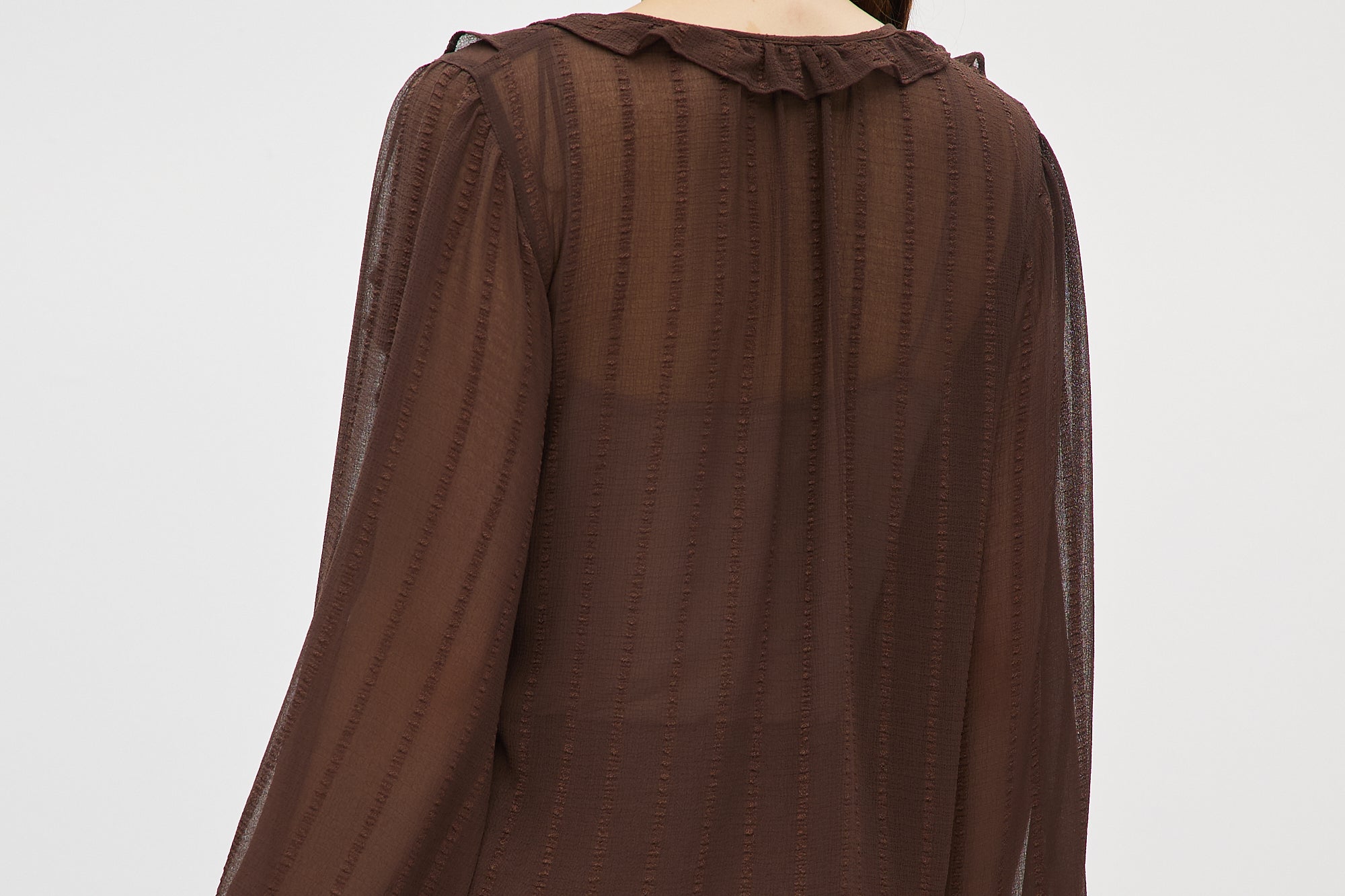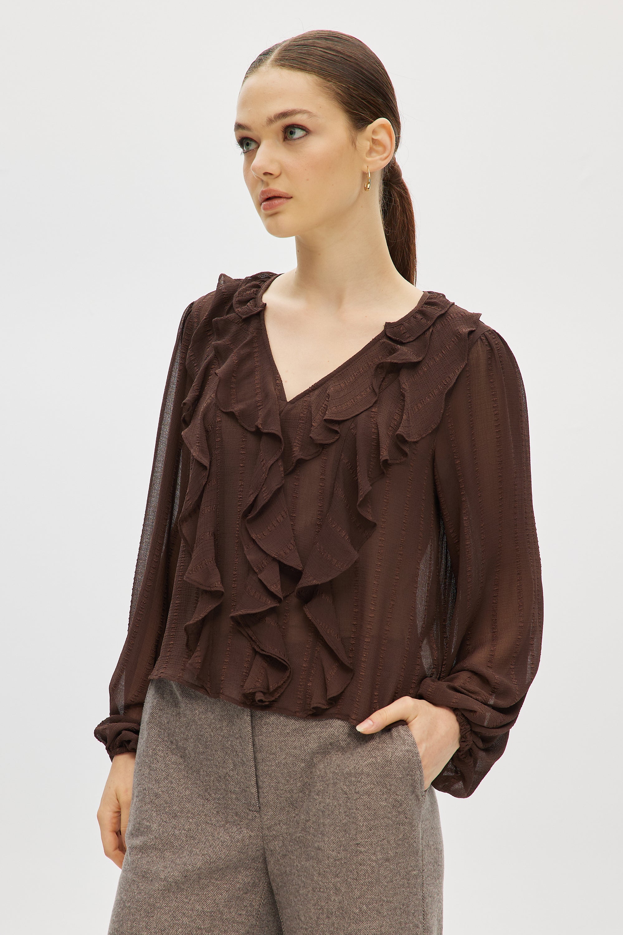 Softly structured and ultra-feminine, this popover shirt brings graceful volume with cascading ruffles framing the neckline and bodice. Made from lightweight polyester, it features a flattering V-neckline, elasticized cuffs, and a relaxed fit that works tucked in or worn loose. A perfect piece for desk-to-dinner styling, available in timeless Black and deep Java.