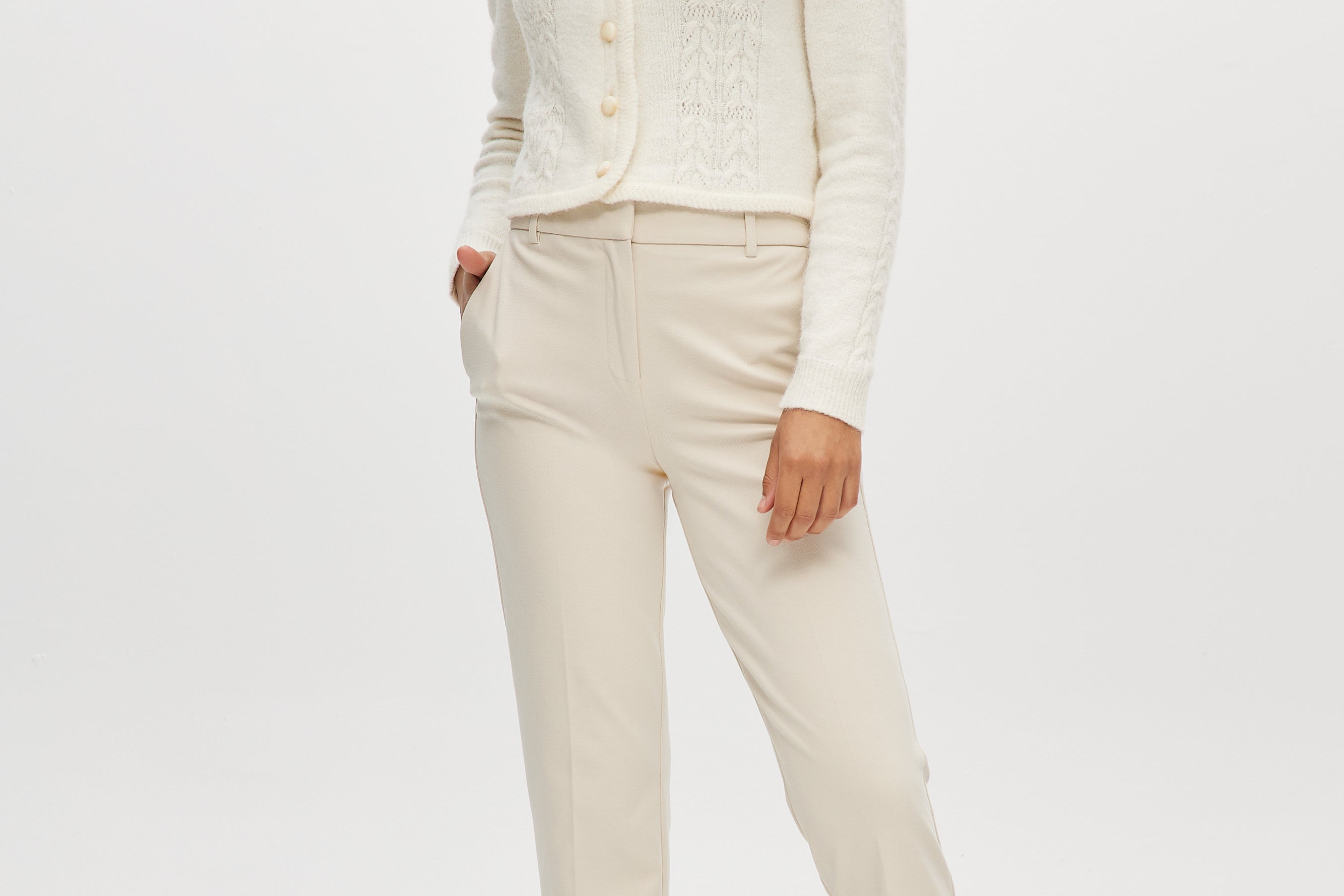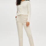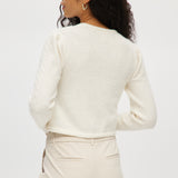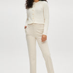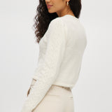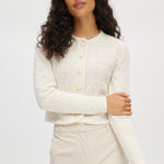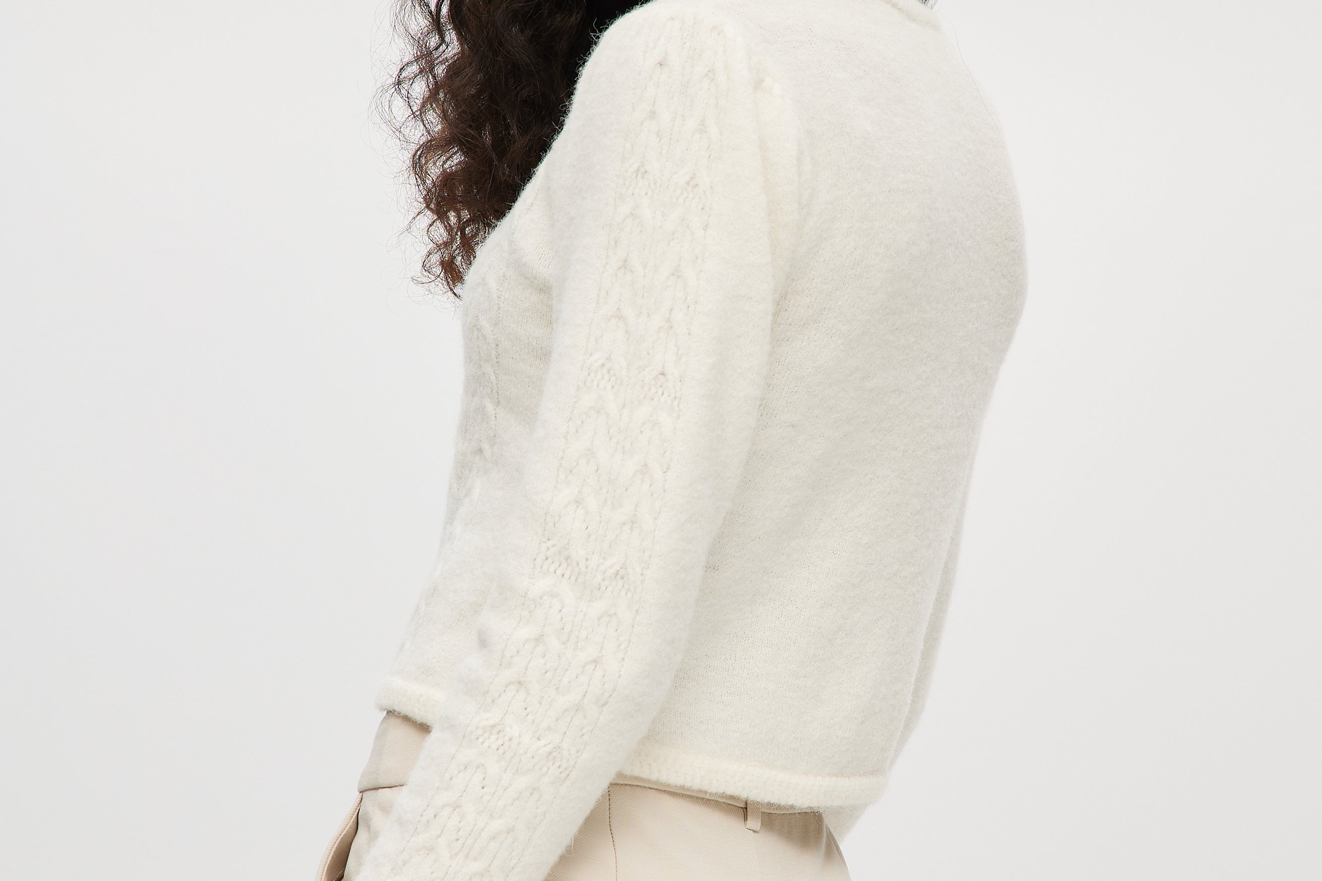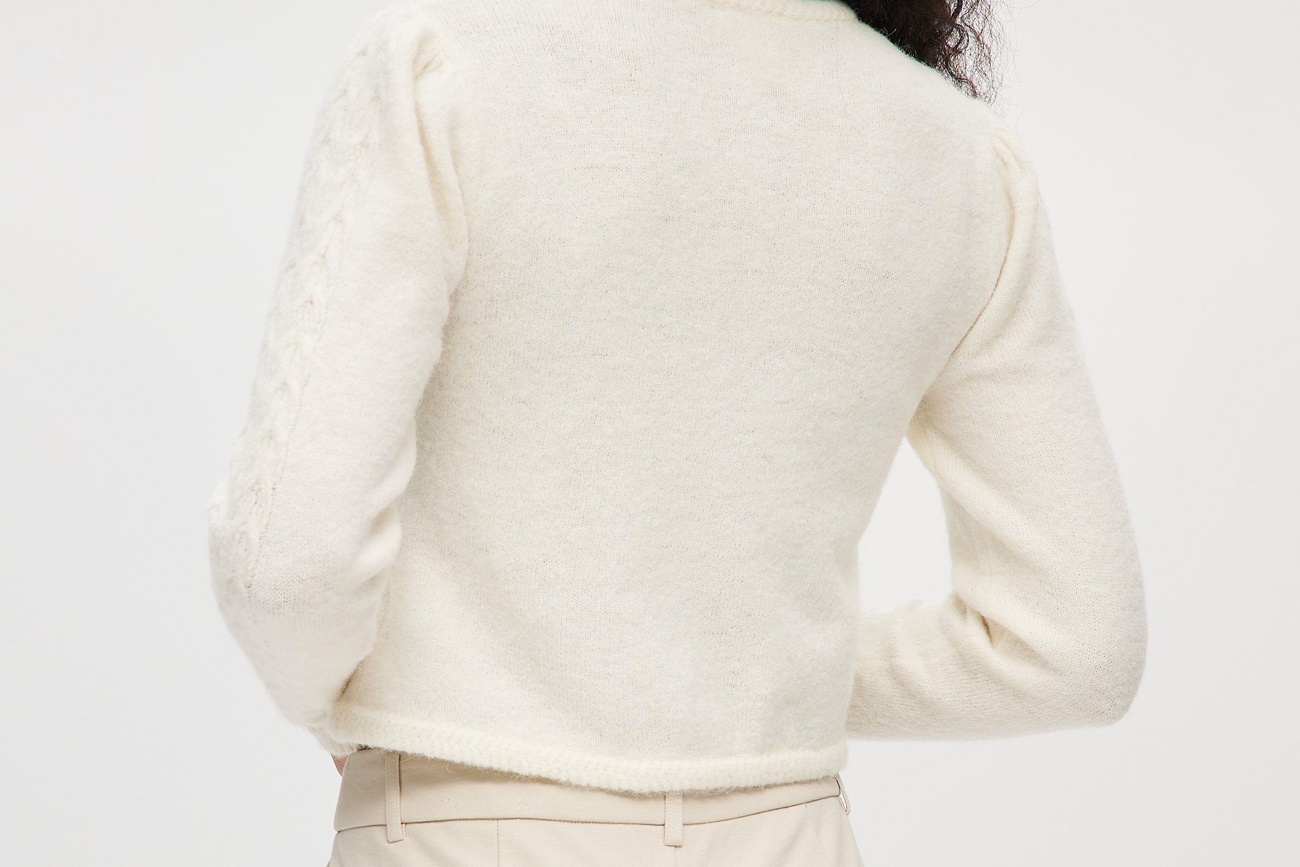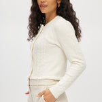 This cozy cable knit cardigan blends softness and stretch with a refined button-front design. Crafted with a warm mix of polyester, alpaga, wool, and spandex, it's the perfect layering piece for crisp fall days. Available in neutral tones for a timeless look.