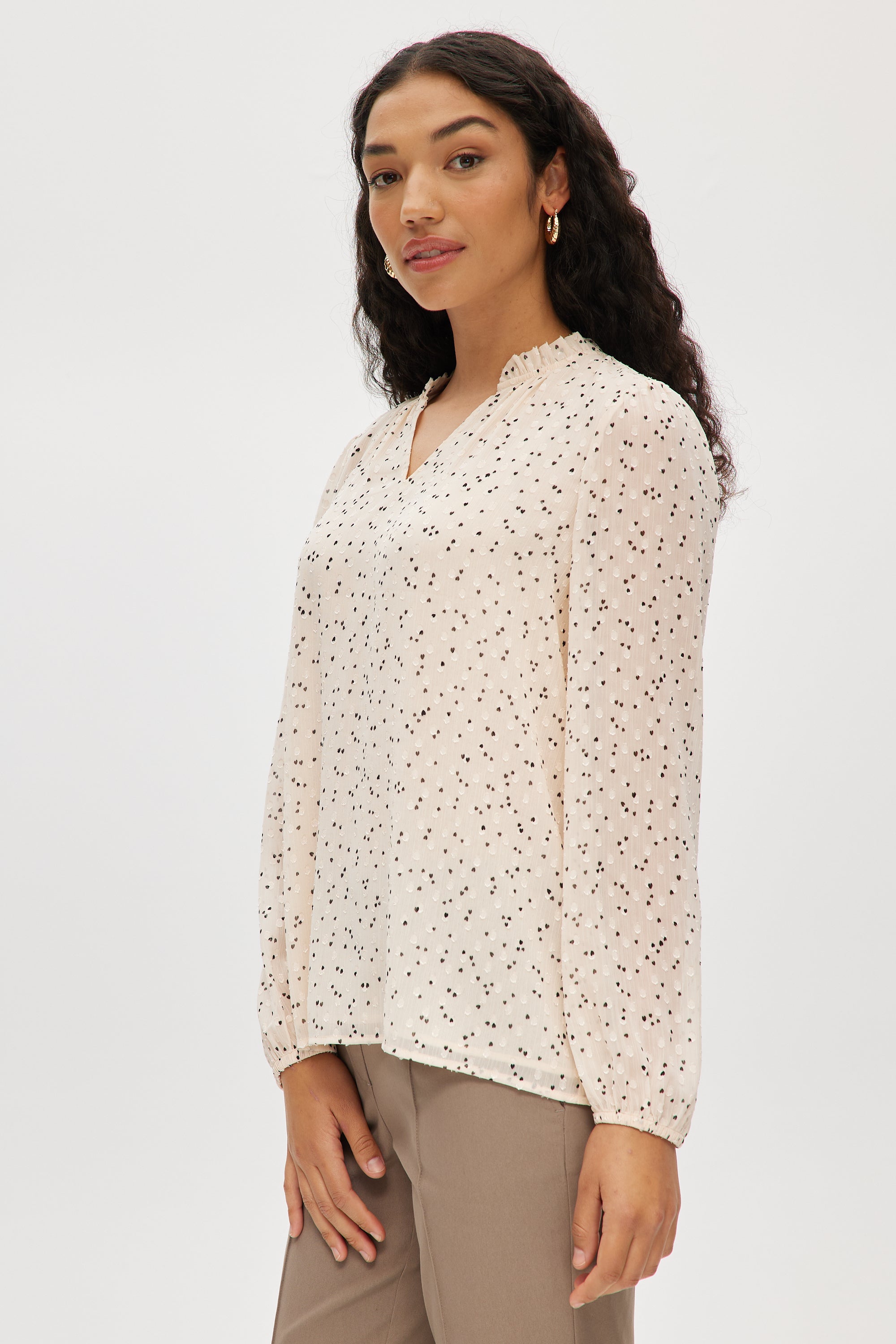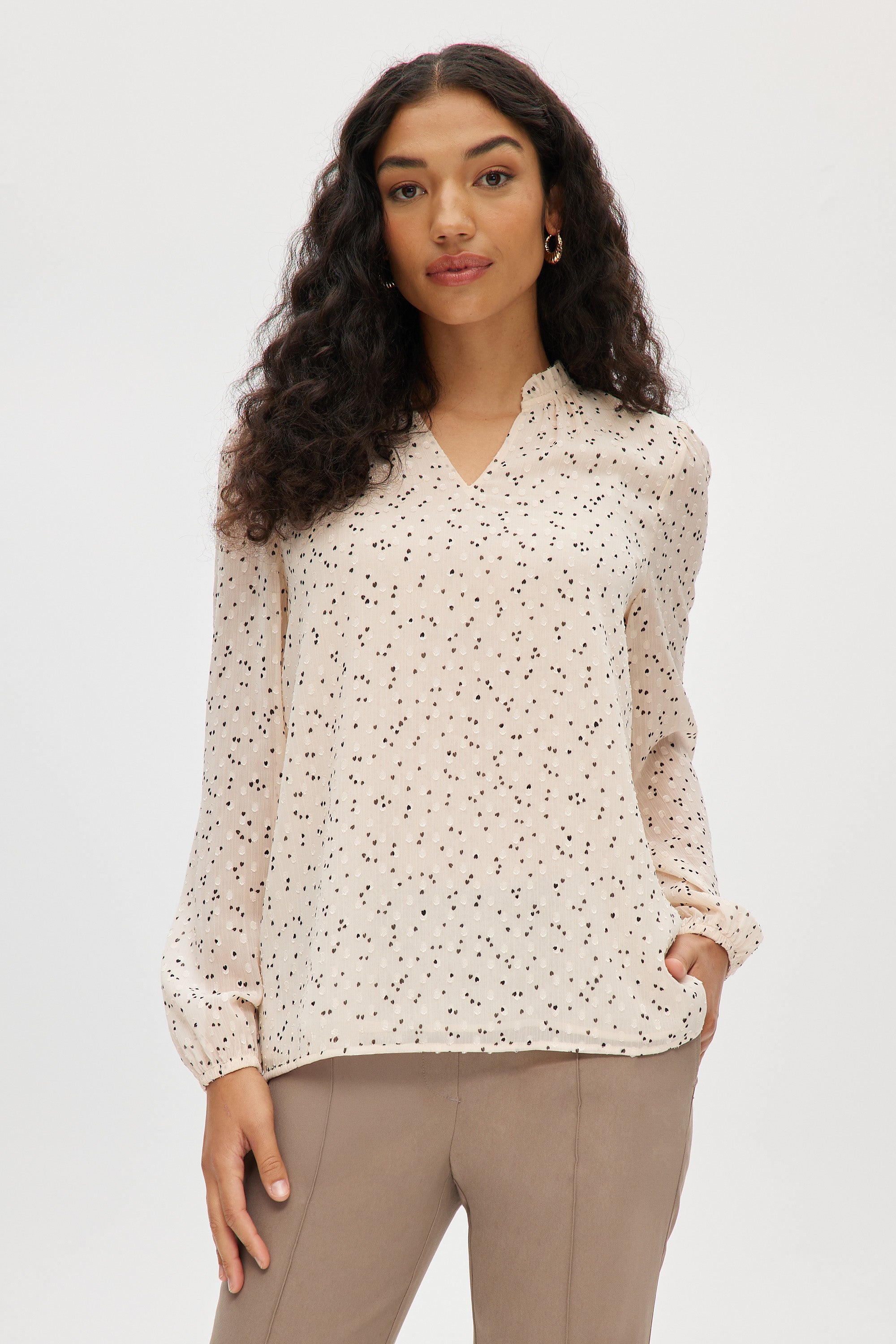 This feminine long-sleeved blouse features soft ruffles at the neckline and delicate shirring at the front and back. With its easy-care, novelty textured fabric and flattering silhouette, its perfect for dressing up jeans or pairing with tailored pants.
