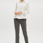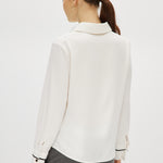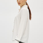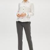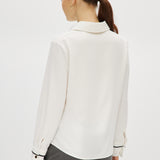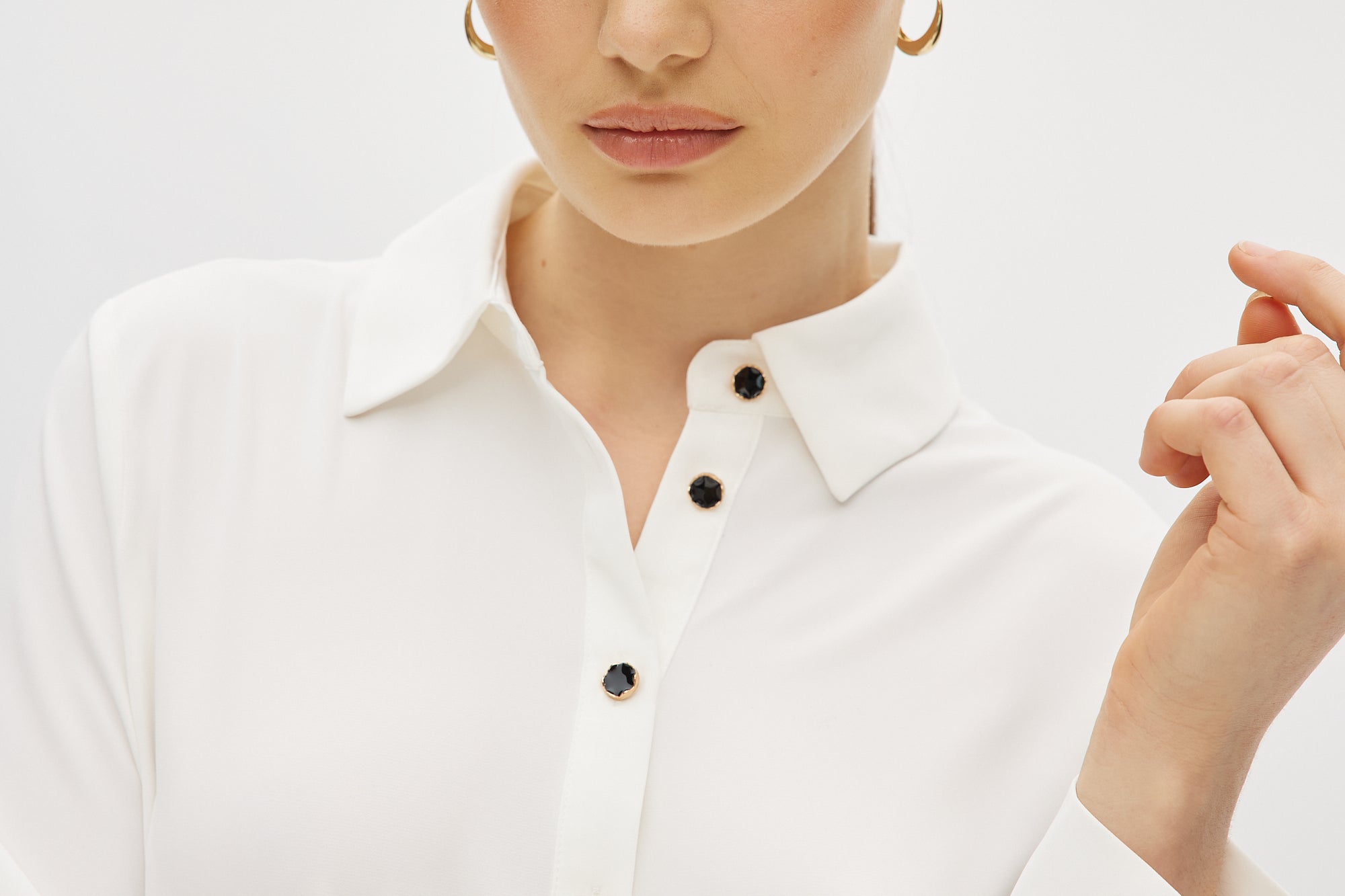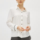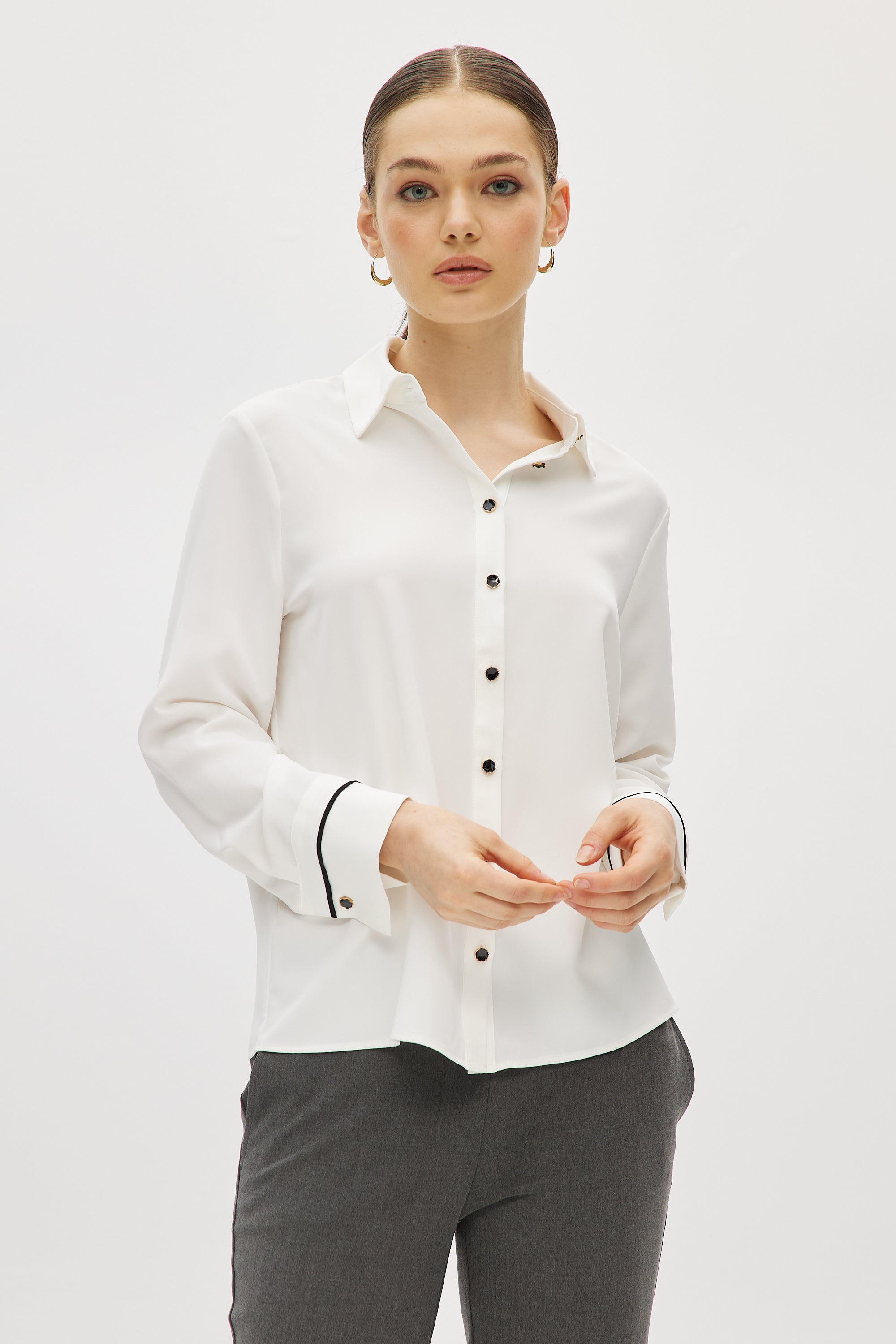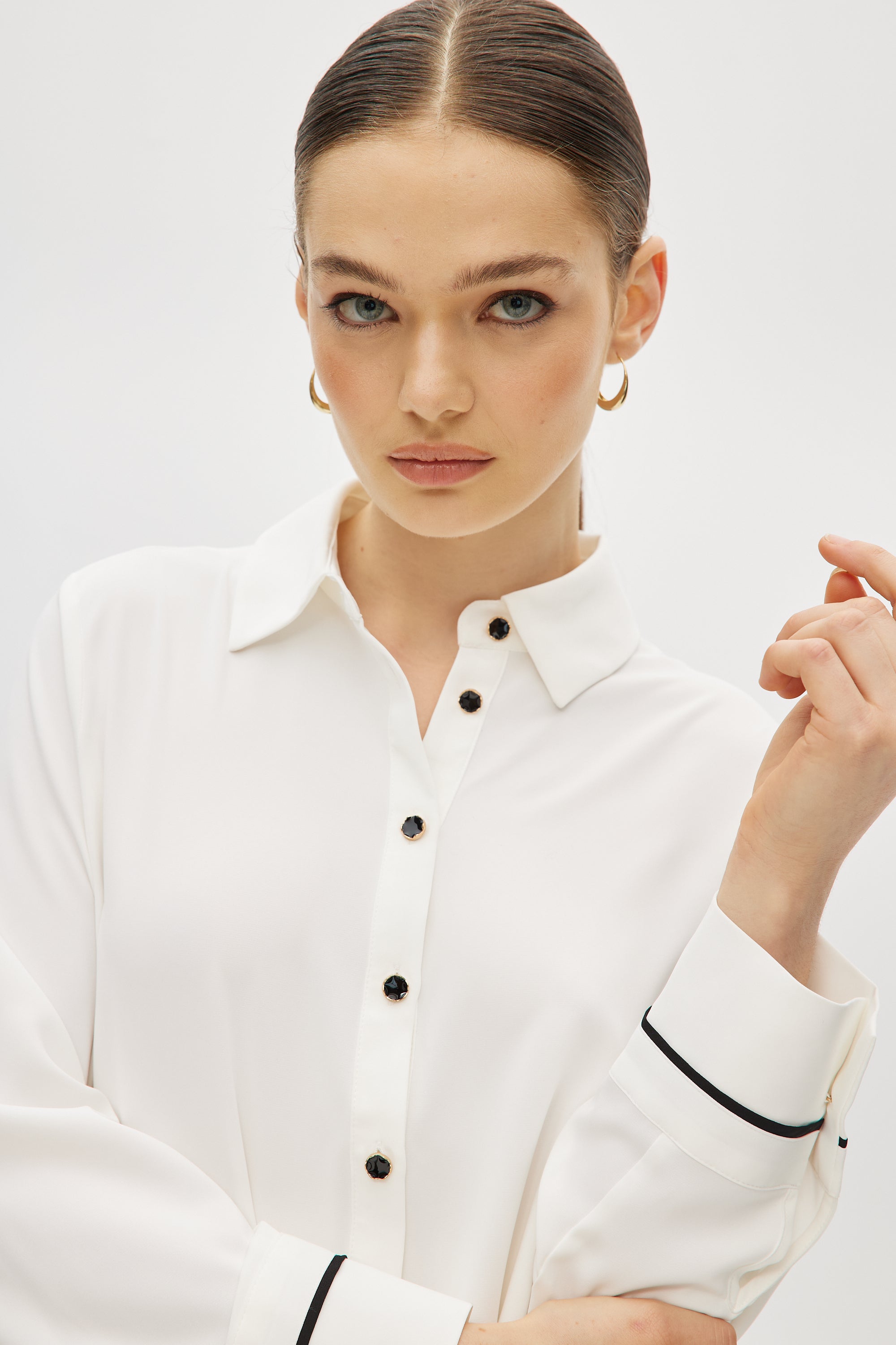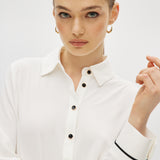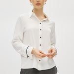 A modern essential with a twist. This ivory stretch shirt features a crisp collar, novelty buttons, and subtle contrast piping at the cuffs for an elevated finish. Crafted from 4-way stretch fabric, it moves with you while keeping a polished silhouetteperfect from desk to dinner.