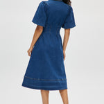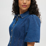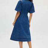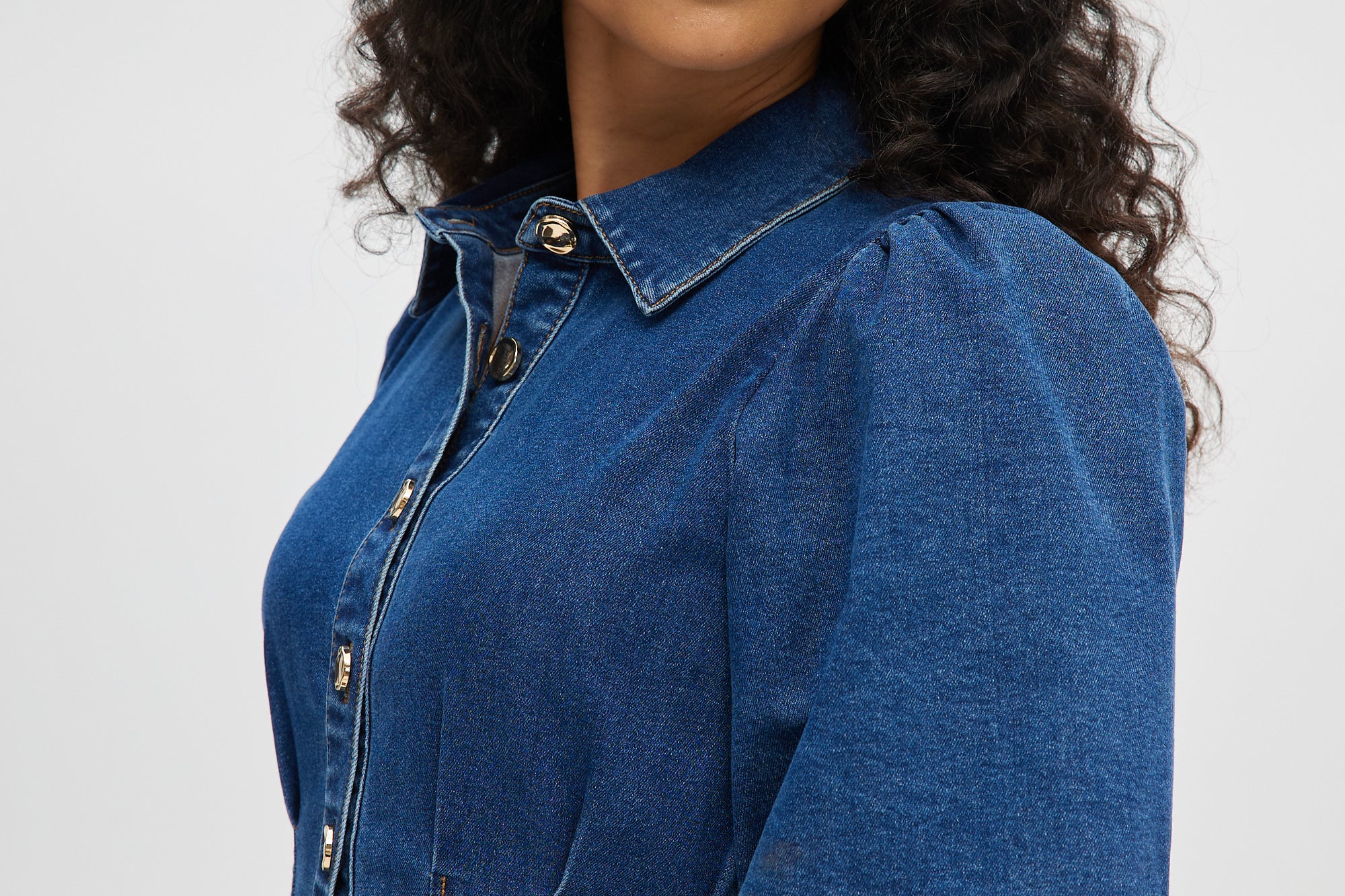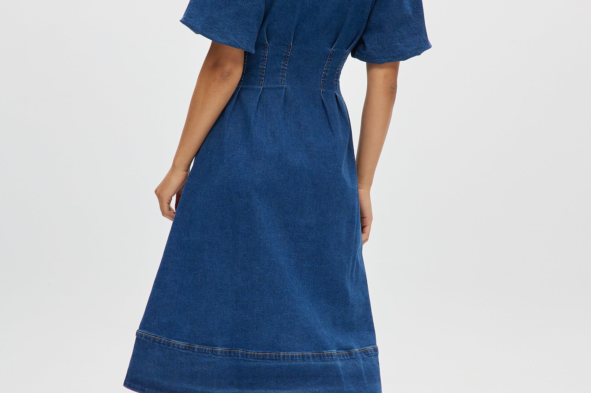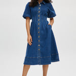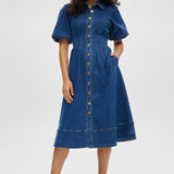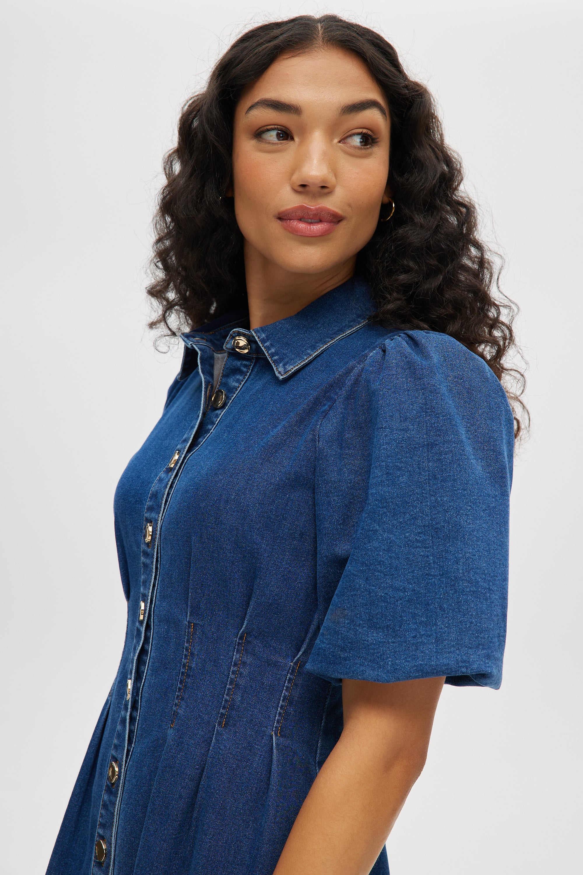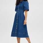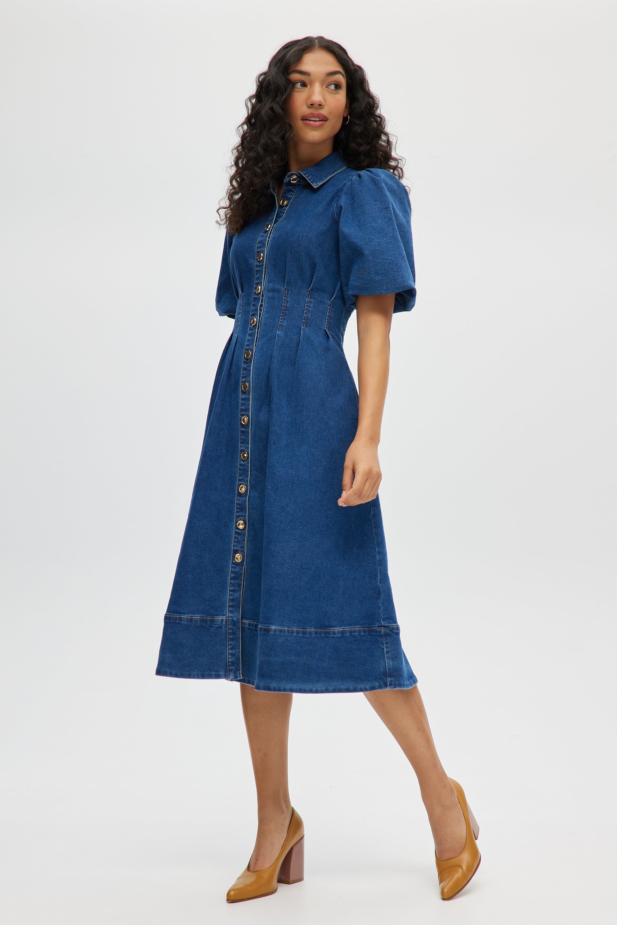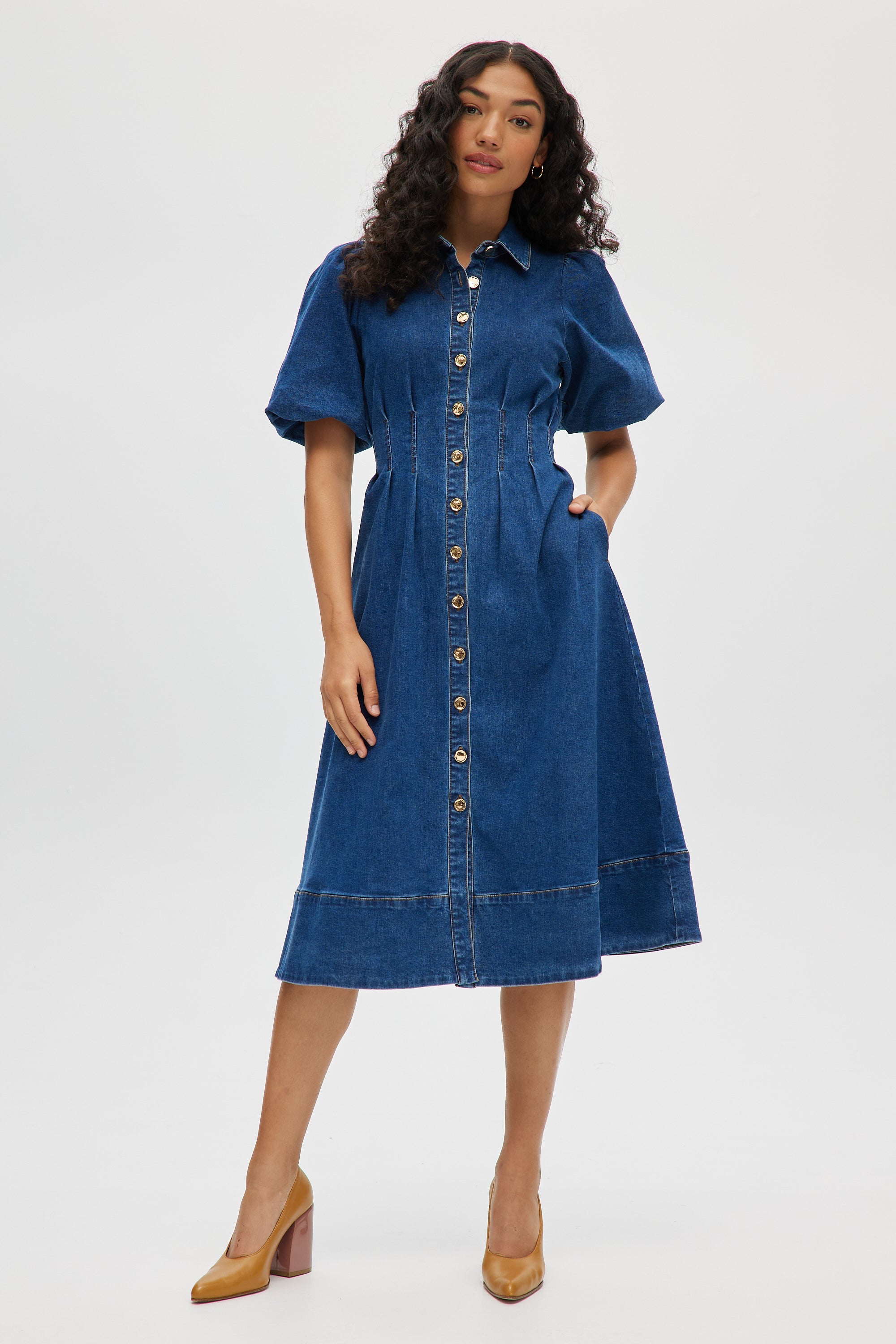 A modern twist on the classic denim dress. This midi shirt dress features voluminous puff sleeves and a softly flared skirt for an effortlessly feminine silhouette. The button-down front, defined waist, and shiny gold hardware add structure and style, making it the perfect wardrobe staple for transitional fall looksjust add boots or sneakers.