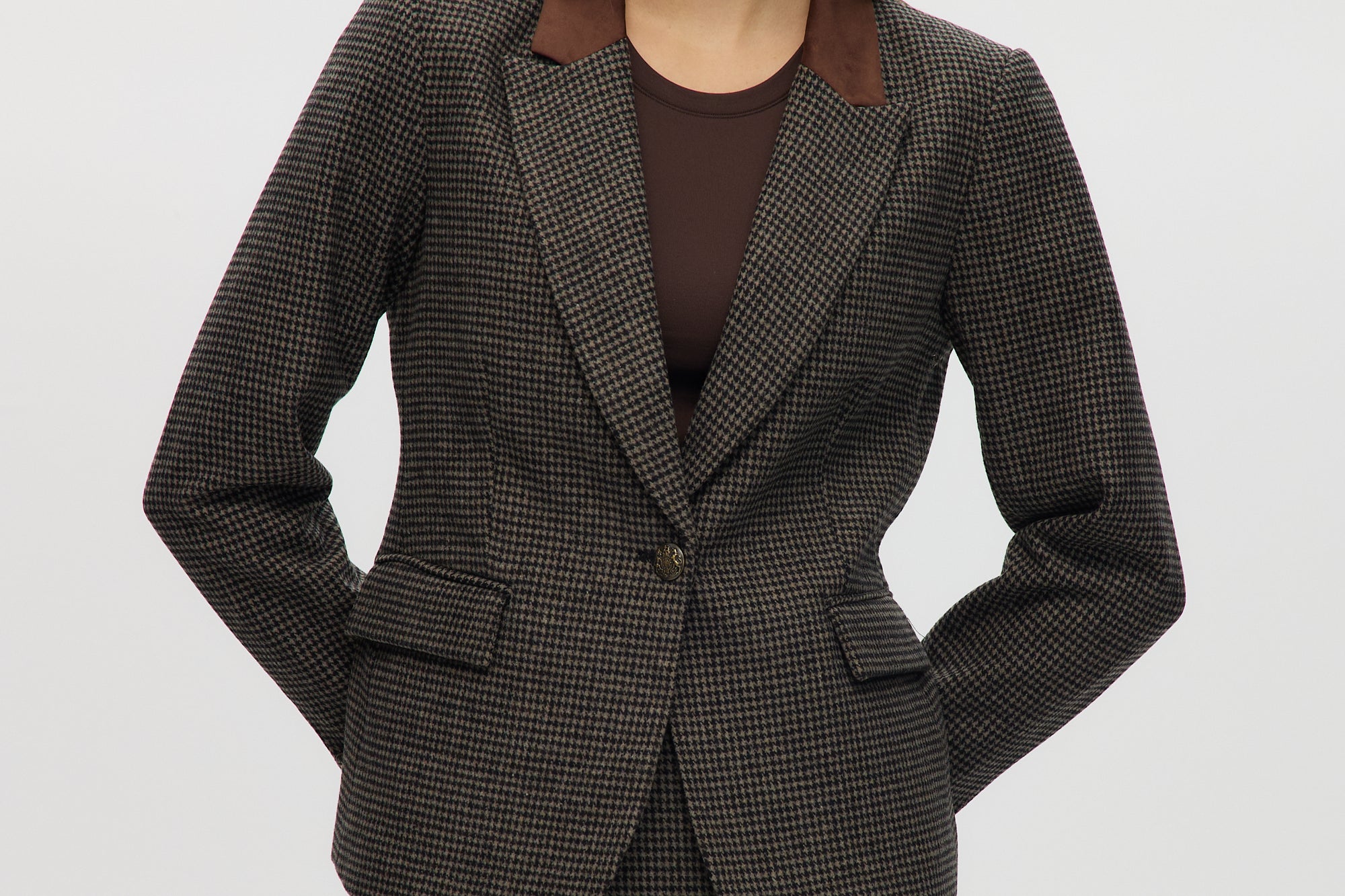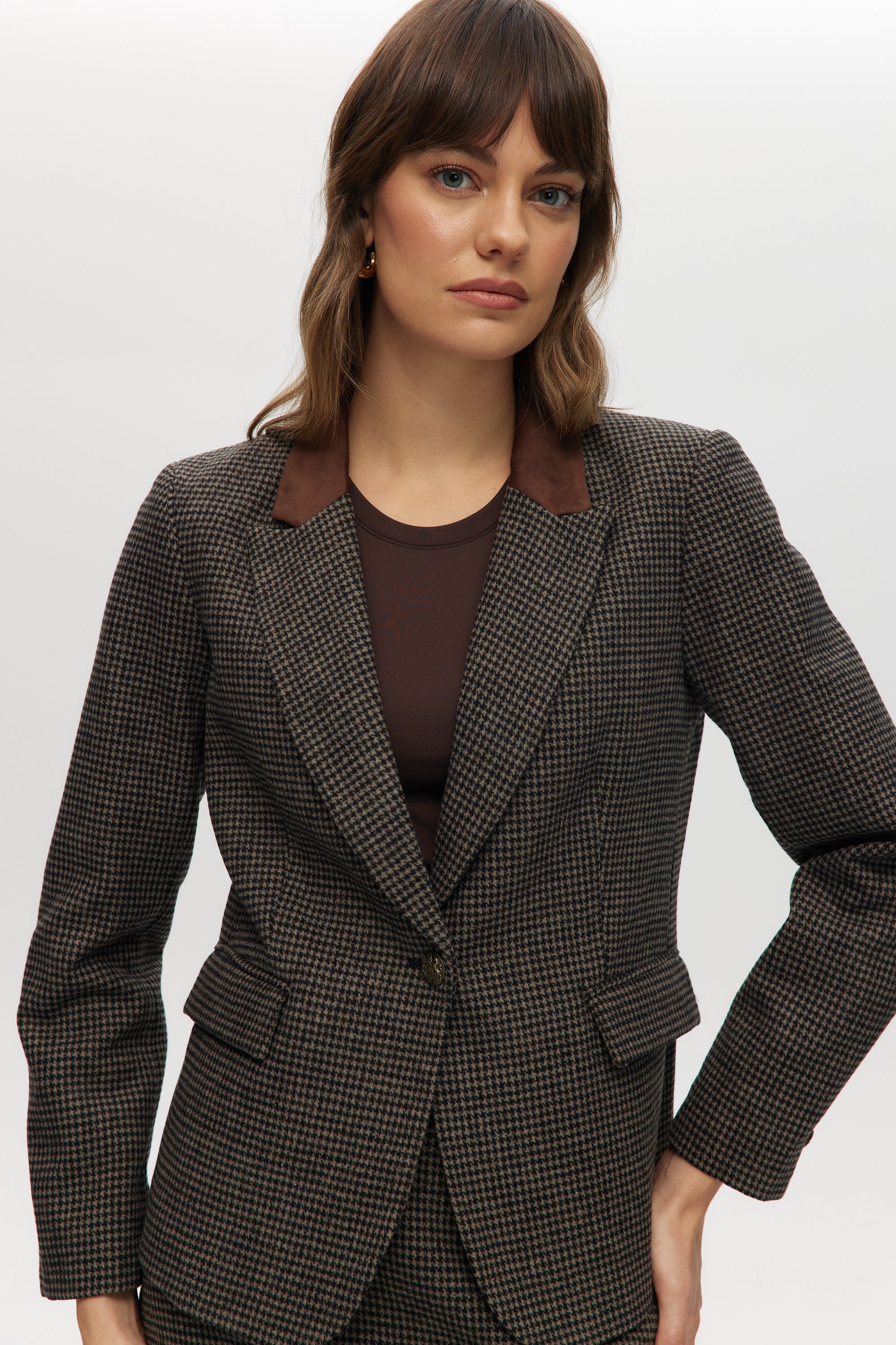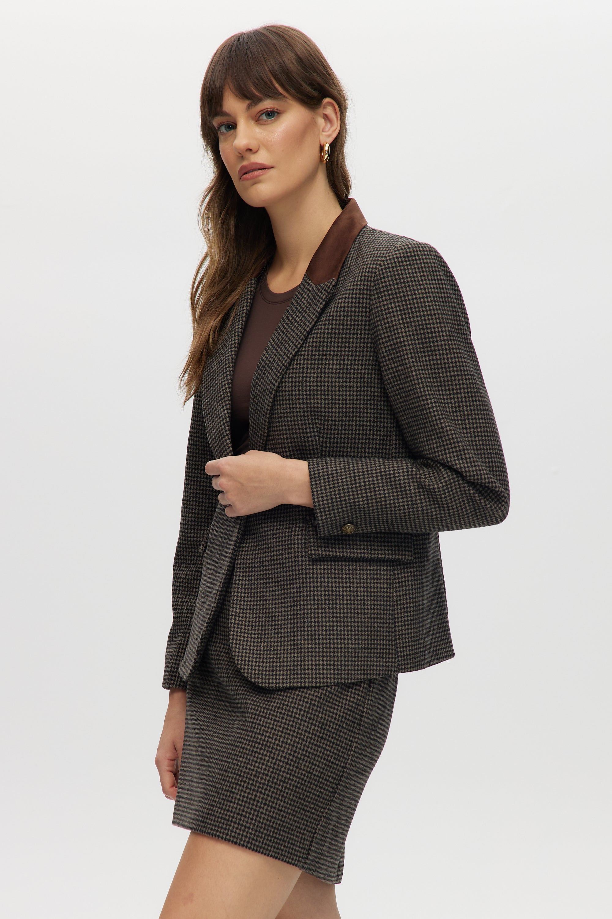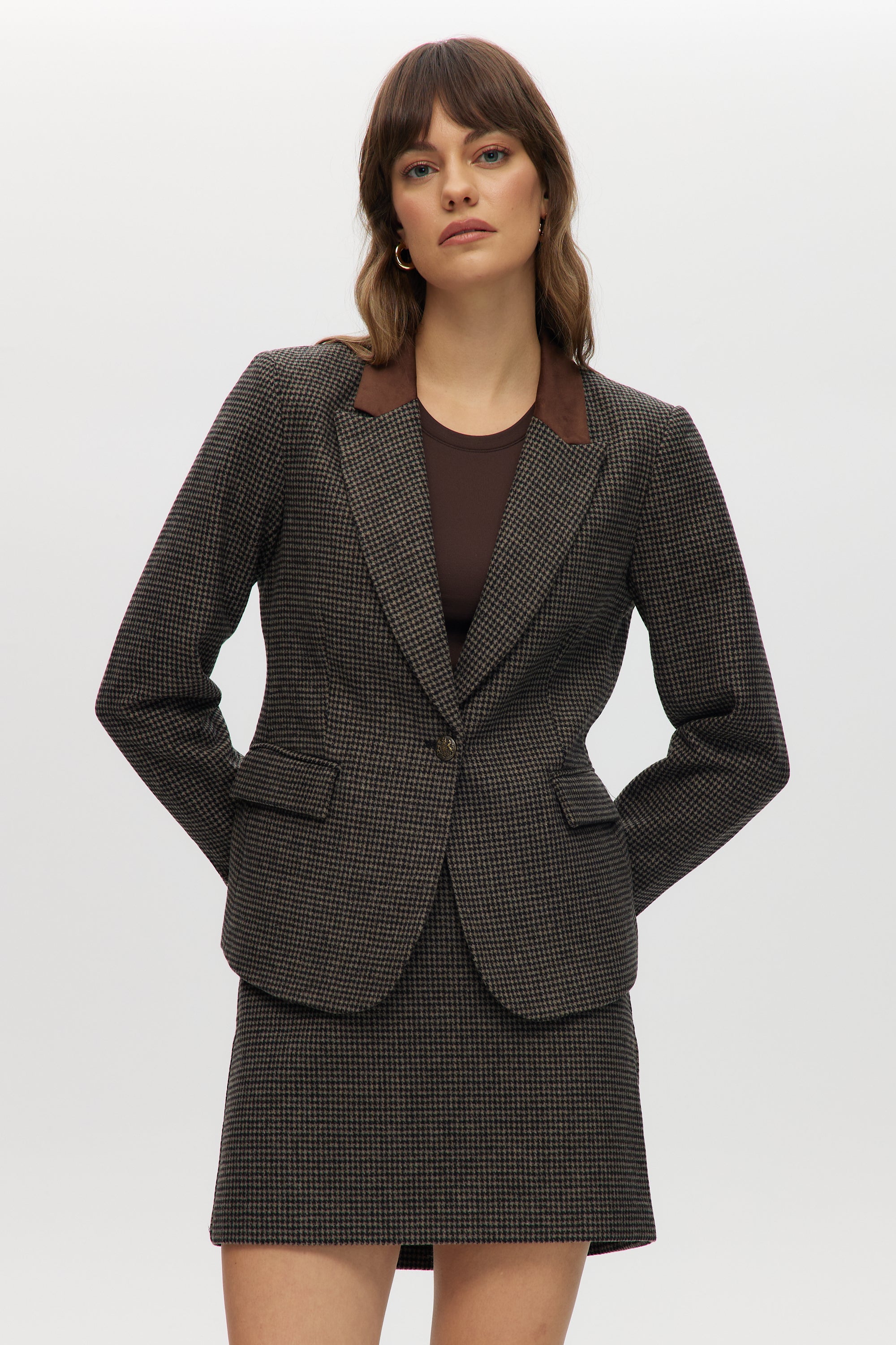This modern-fit blazer combines clean tailoring with subtle texture for a polished yet wearable look. Designed in a brushed woven fabric with charcoal and black check pattern, it features long sleeves, a notched collar, and a center-front button closure. Tonal dark brown detailing at the collar and pockets adds understated contrast. Fully lined for a smooth fit, its a wardrobe staple for effortless coordinationespecially when paired with its matching high-rise skirt, sold separately.