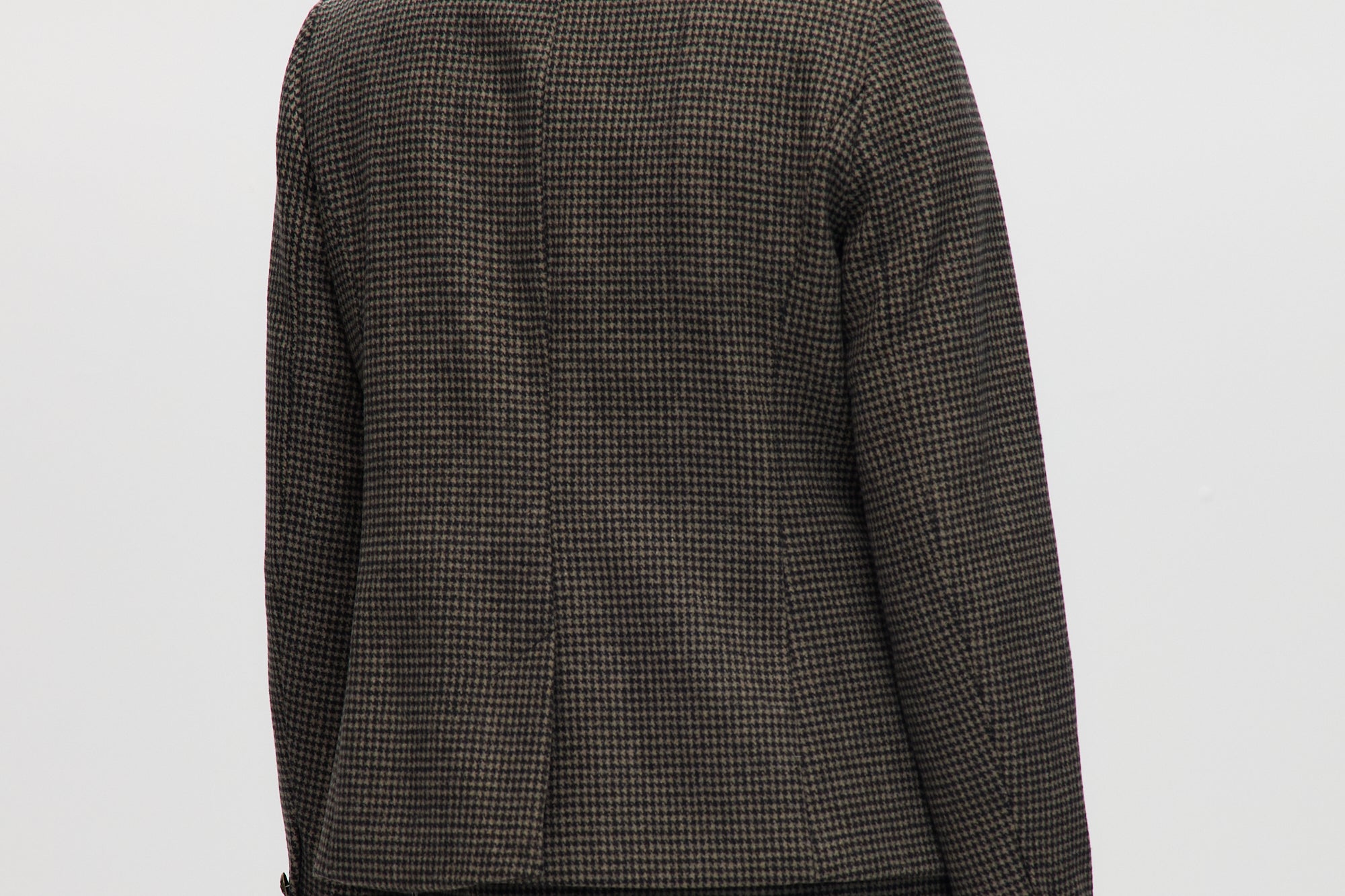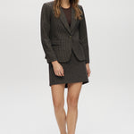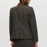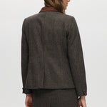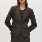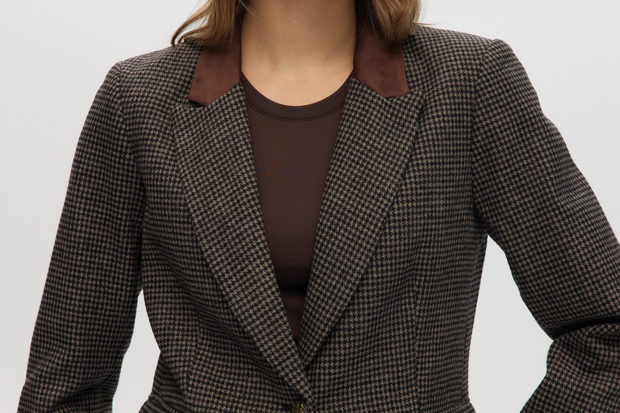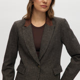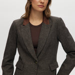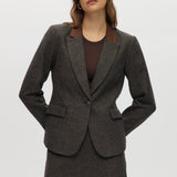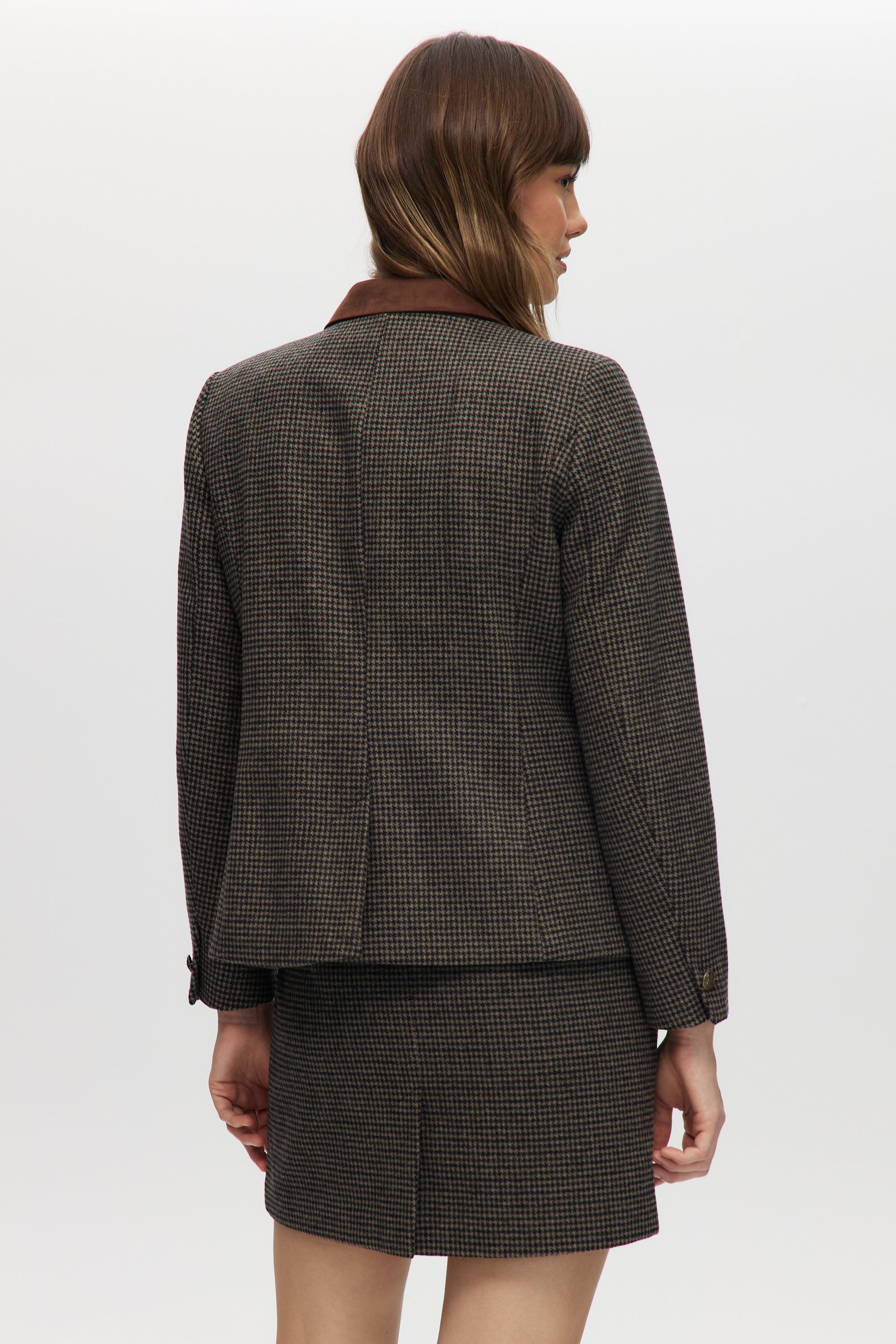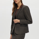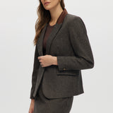 This modern-fit blazer combines clean tailoring with subtle texture for a polished yet wearable look. Designed in a brushed woven fabric with charcoal and black check pattern, it features long sleeves, a notched collar, and a center-front button closure. Tonal dark brown detailing at the collar and pockets adds understated contrast. Fully lined for a smooth fit, its a wardrobe staple for effortless coordinationespecially when paired with its matching high-rise skirt, sold separately.