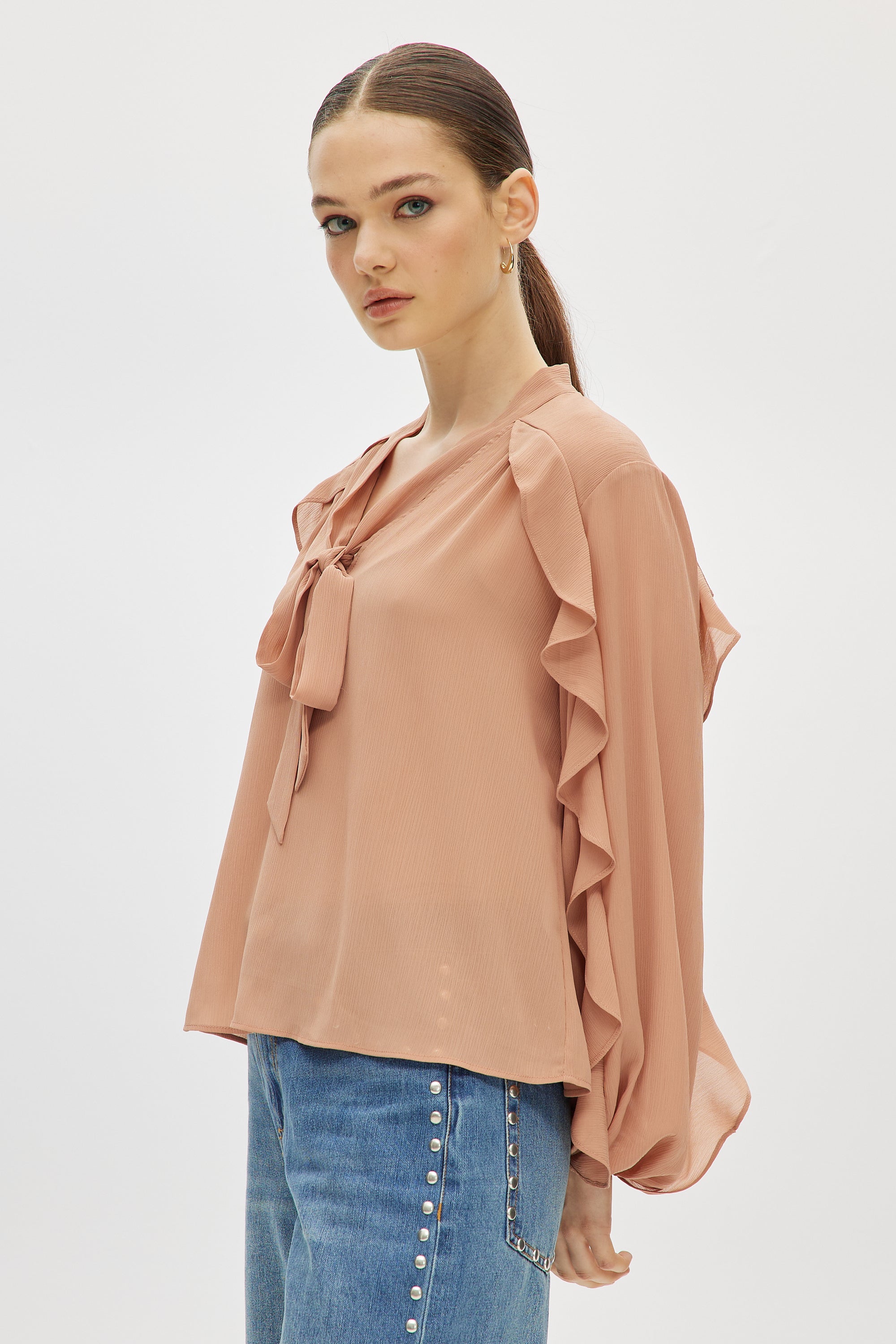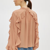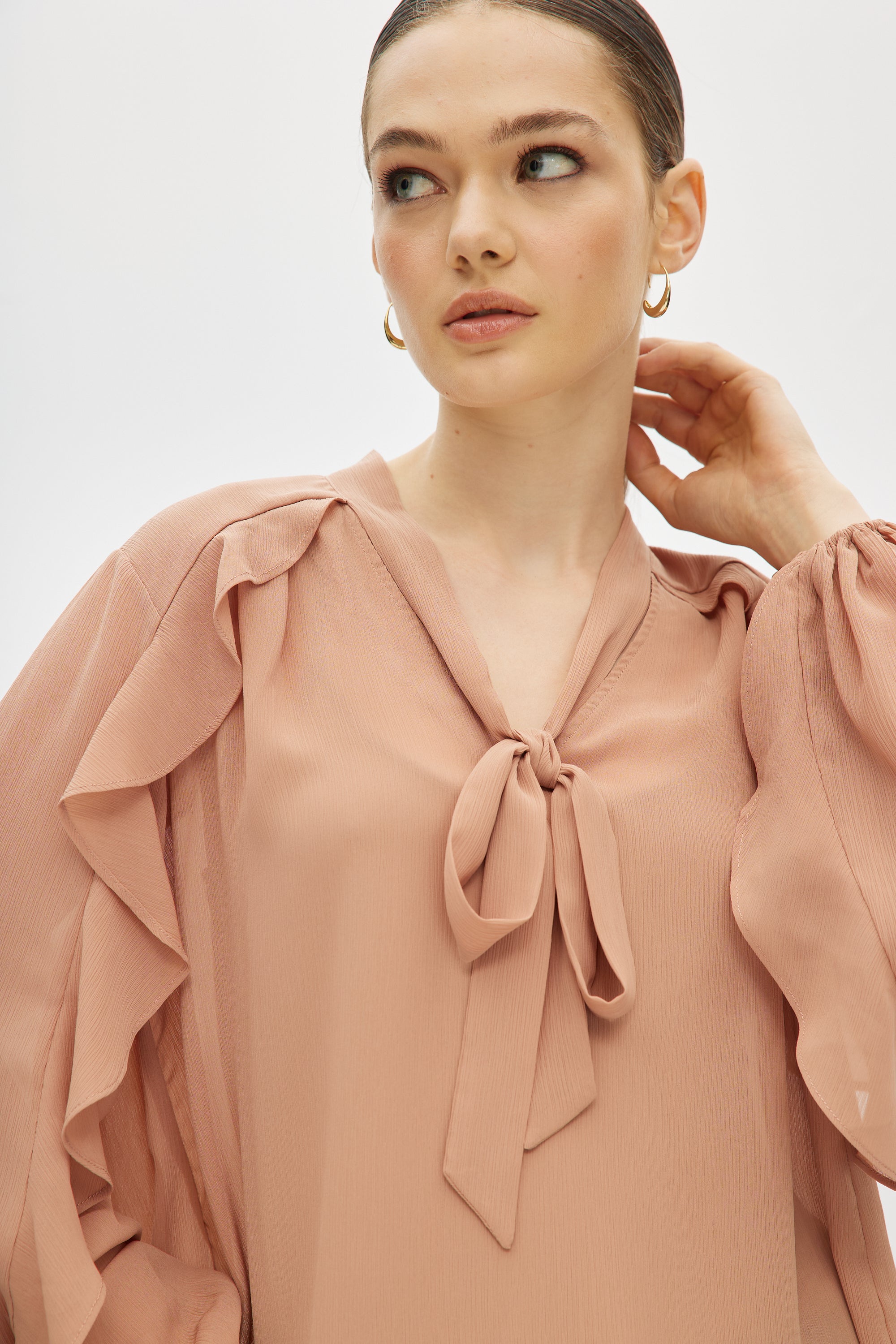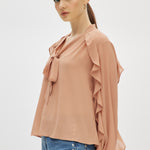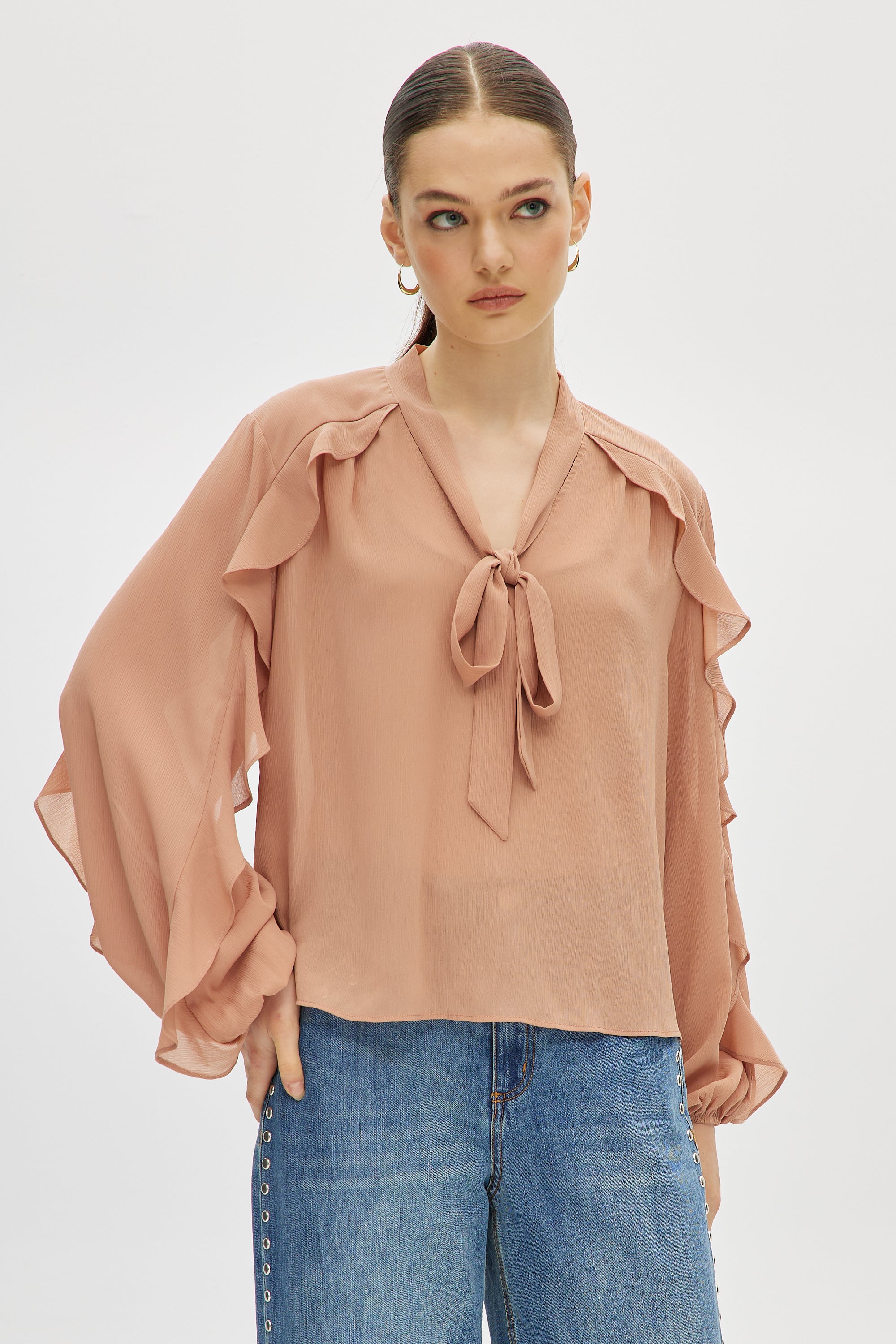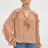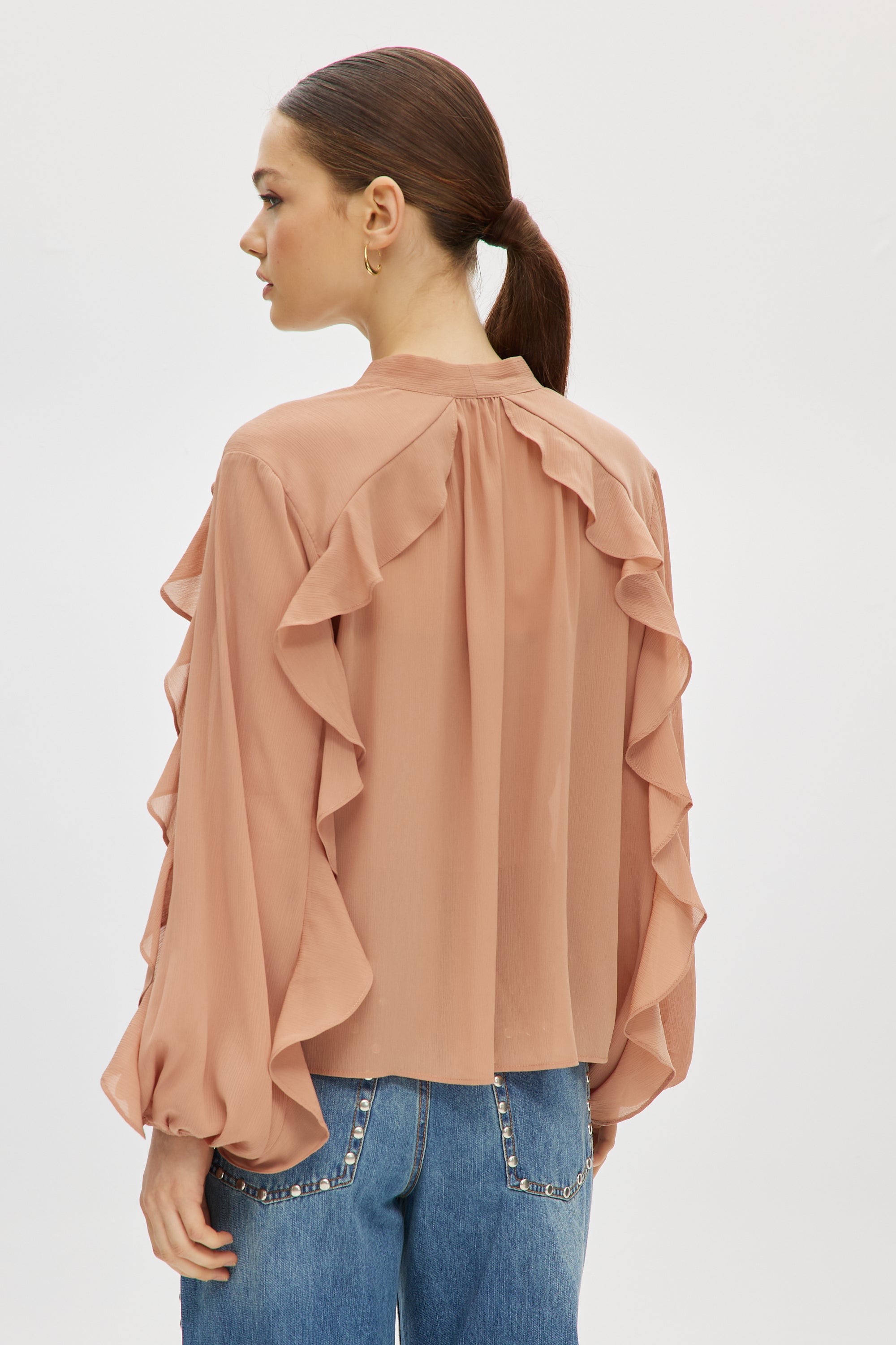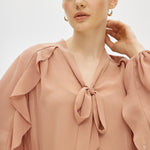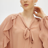 Soft and romantic, this crinkle shirt features cascading ruffles and a delicate tie-front neckline. Designed with shirred detailing at the yoke and flowy long sleeves, its a perfect blend of ease and elegance. The lightweight fabric moves beautifully and works just as well tucked into denim as it does worn loose. Available in warm seasonal hues: Café au Lait and Cabernet.