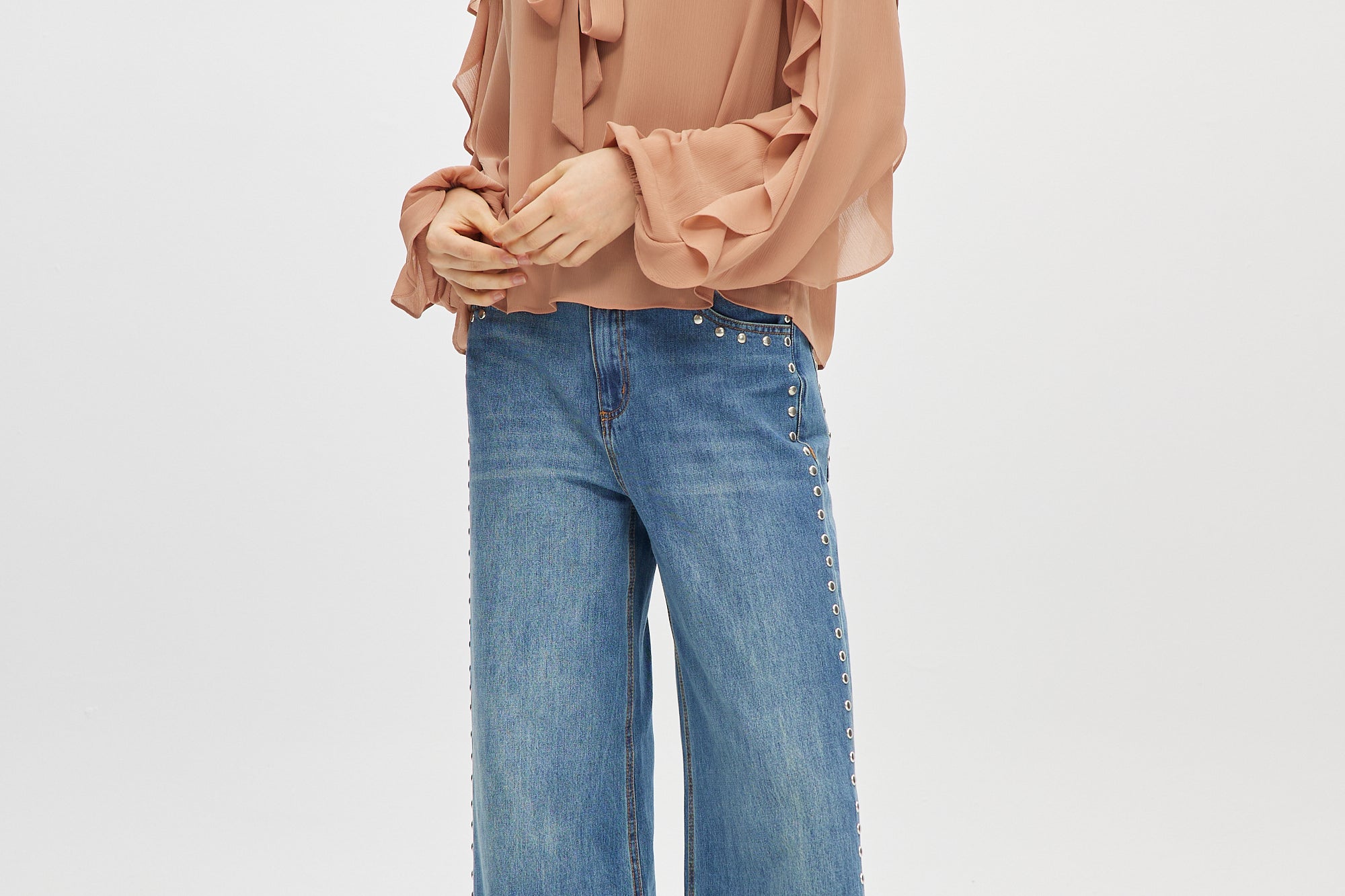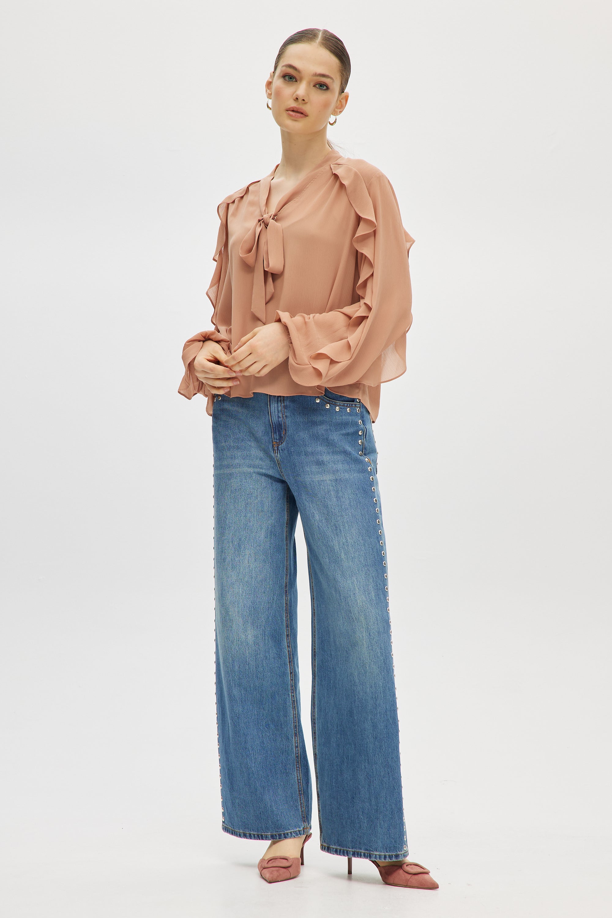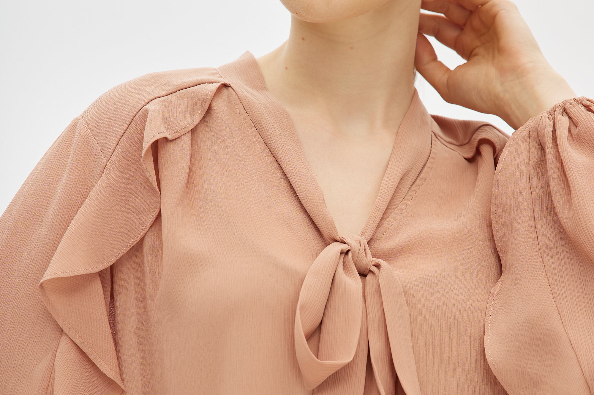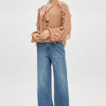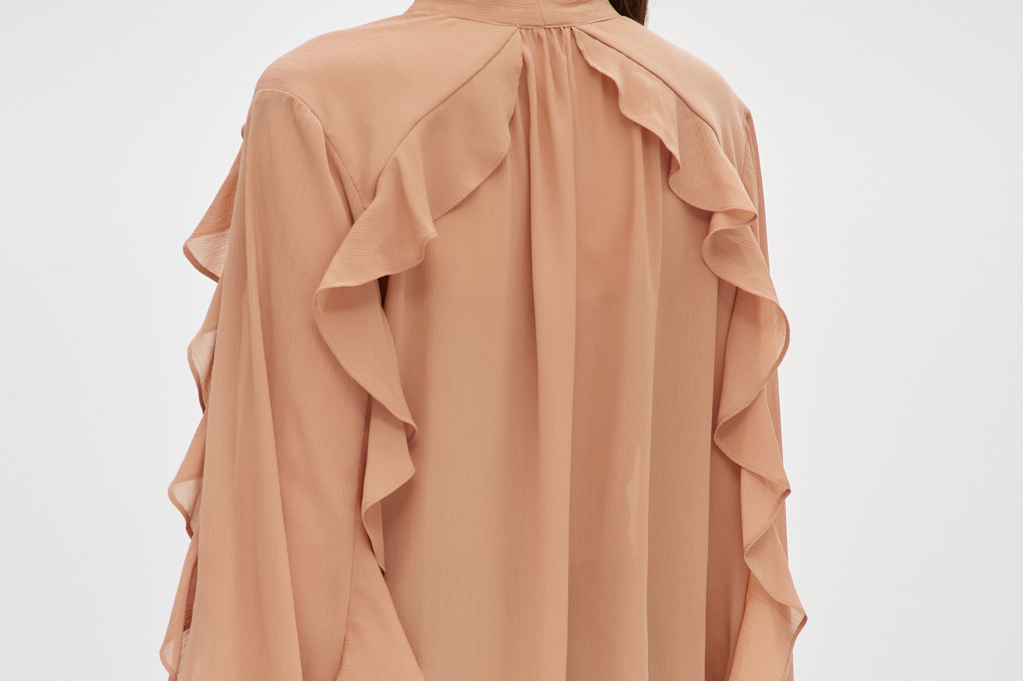 Soft and romantic, this crinkle shirt features cascading ruffles and a delicate tie-front neckline. Designed with shirred detailing at the yoke and flowy long sleeves, its a perfect blend of ease and elegance. The lightweight fabric moves beautifully and works just as well tucked into denim as it does worn loose. Available in warm seasonal hues: Café au Lait and Cabernet.
